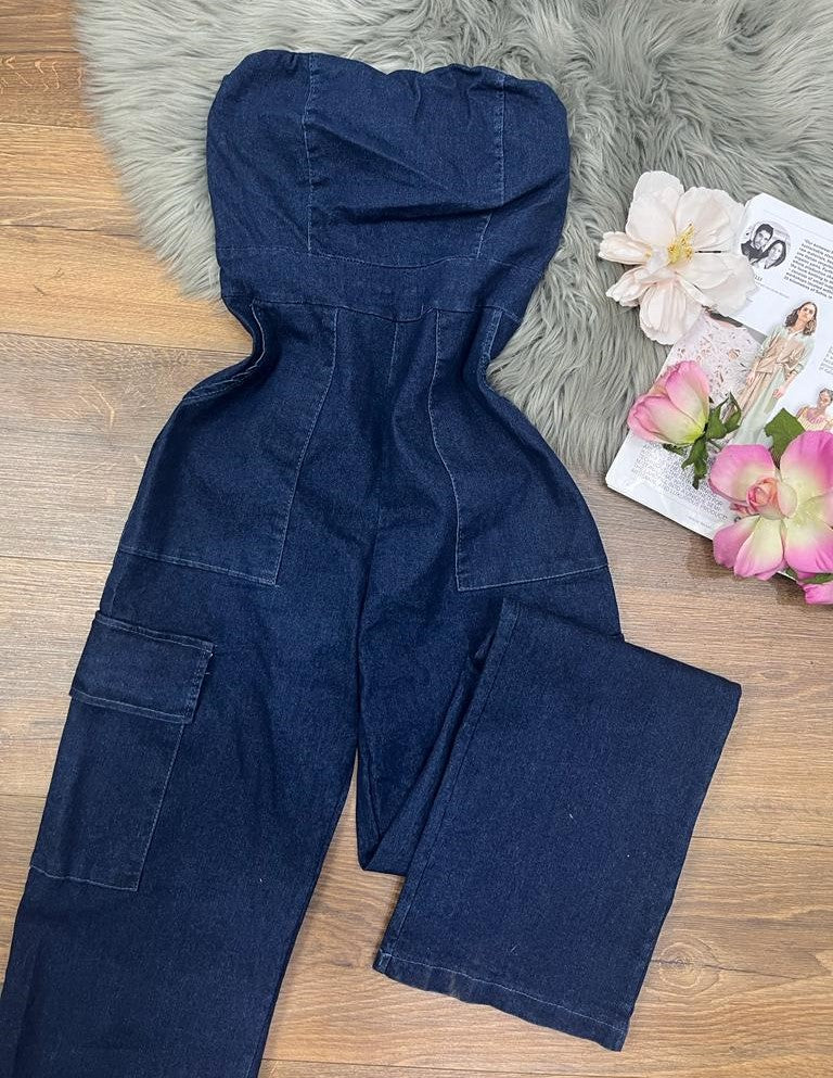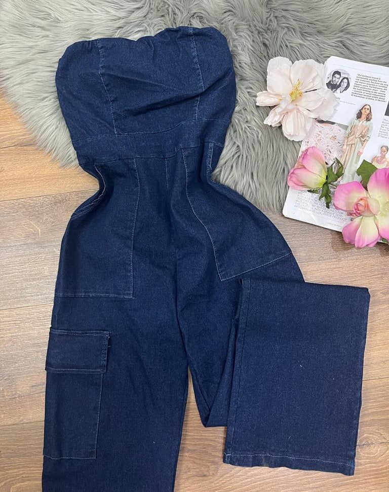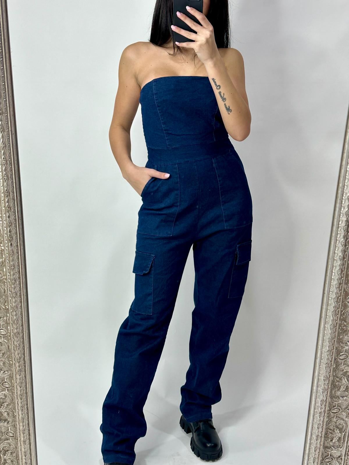 Salopette in denim modello cargo con elastico sul retro . La vestibilità delle taglie risulta regolare. Fabbricato all'estero.