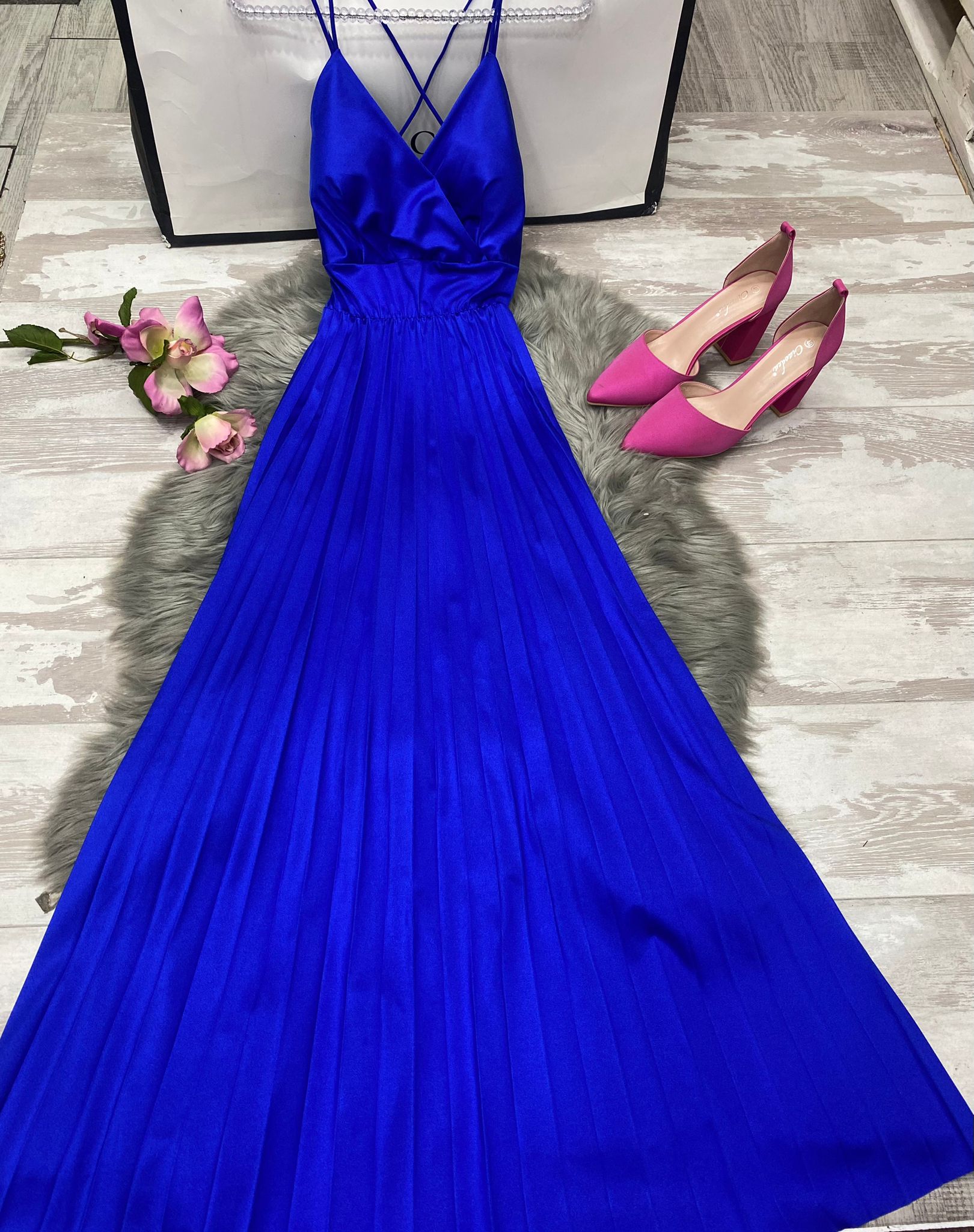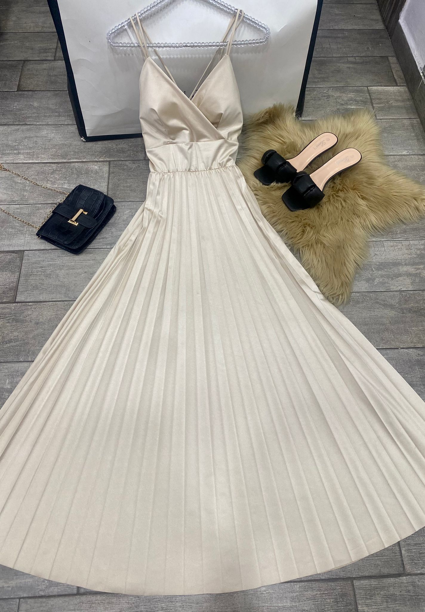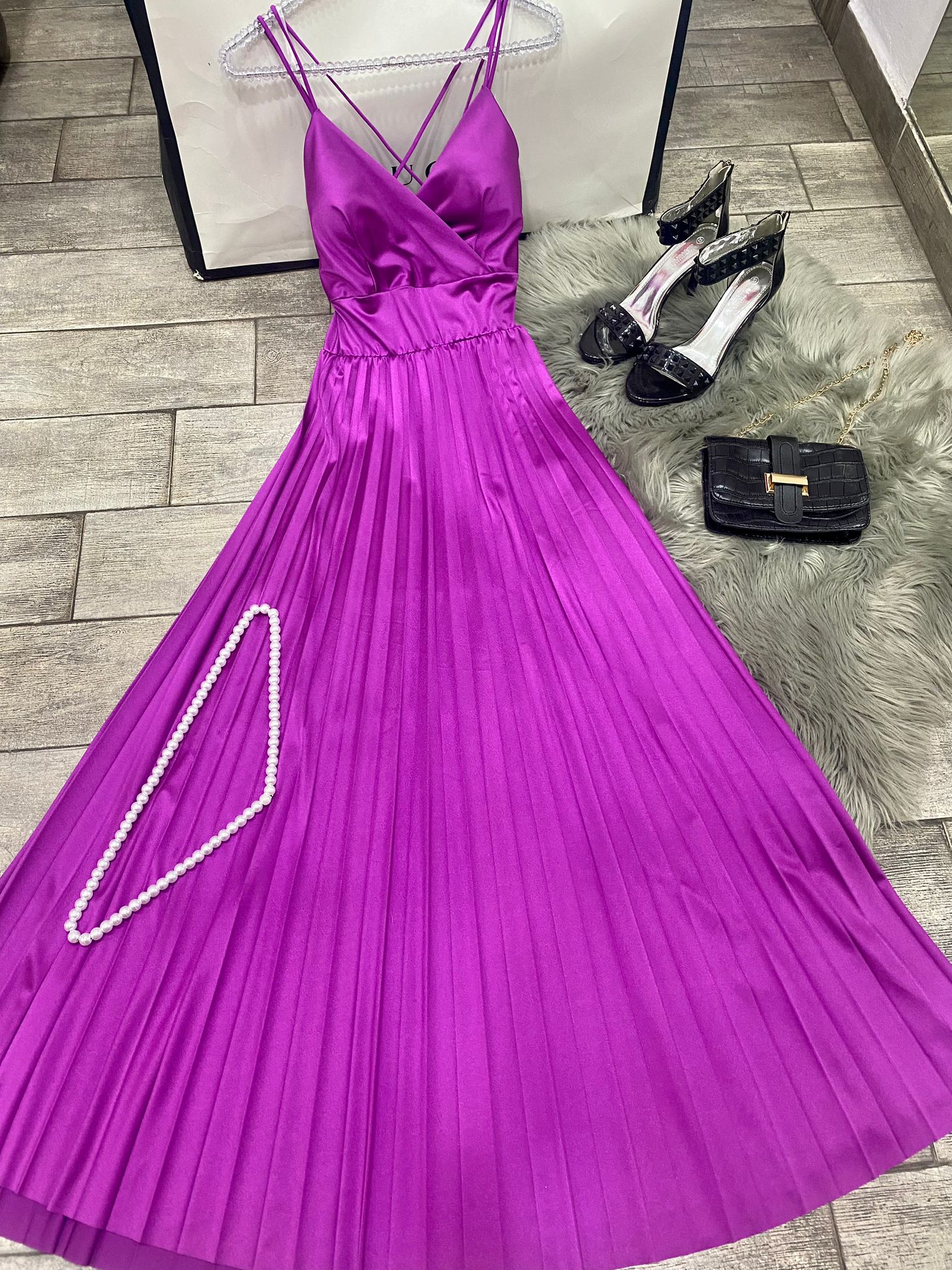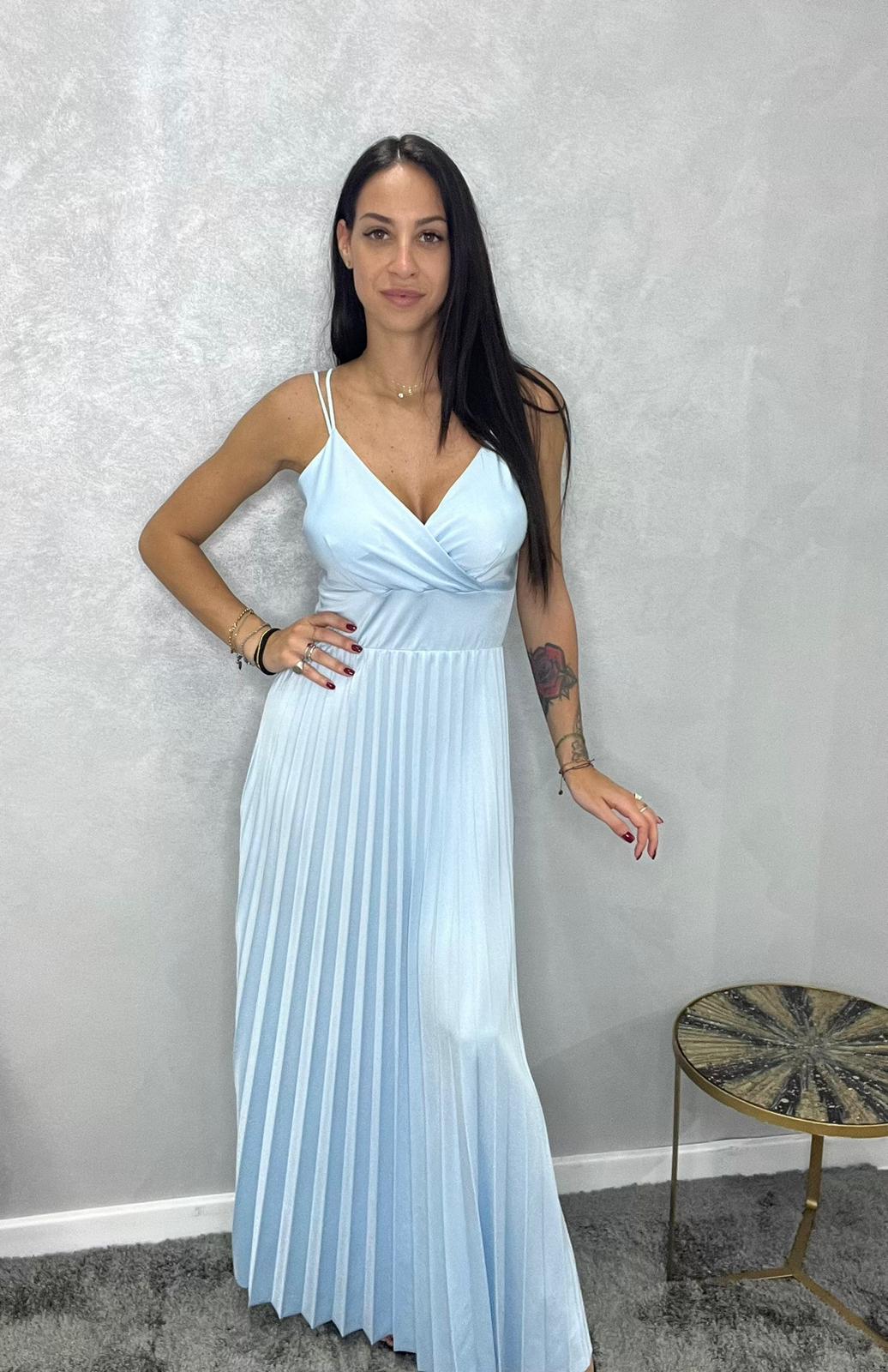 Abito lungo in raso con elastico in vita , coppe preformate e gonna plissè. Fabbricato in Italia.