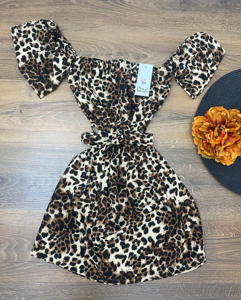 Abito in leggero tessuto strutturato con fantasia animalier e cinturino incluso. Fabbricato in Italia.