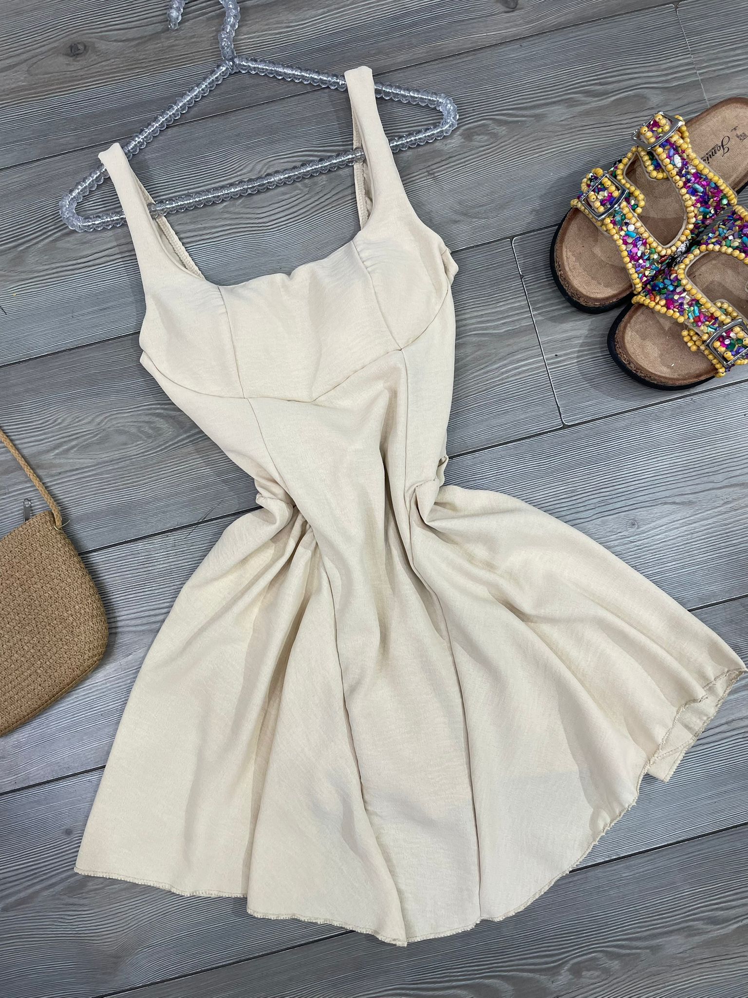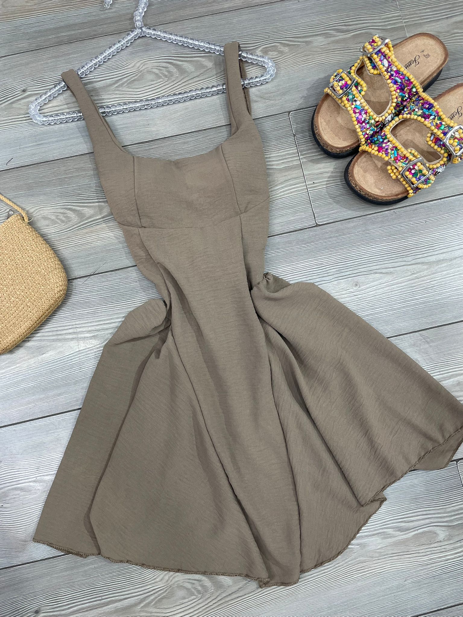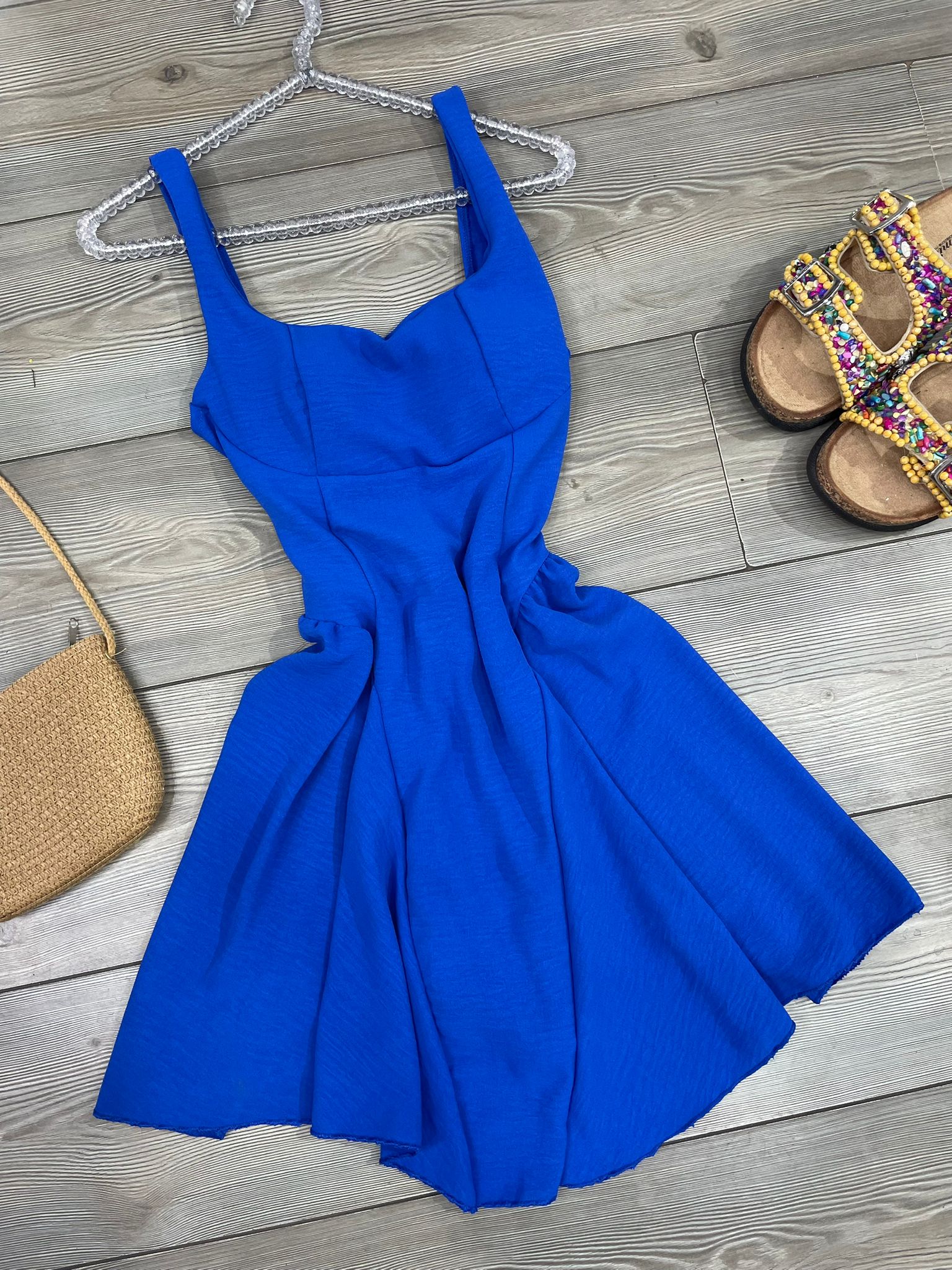 Abito corto con allacciatura dietro la schiena con gonna morbida in leggero tessuto strutturato