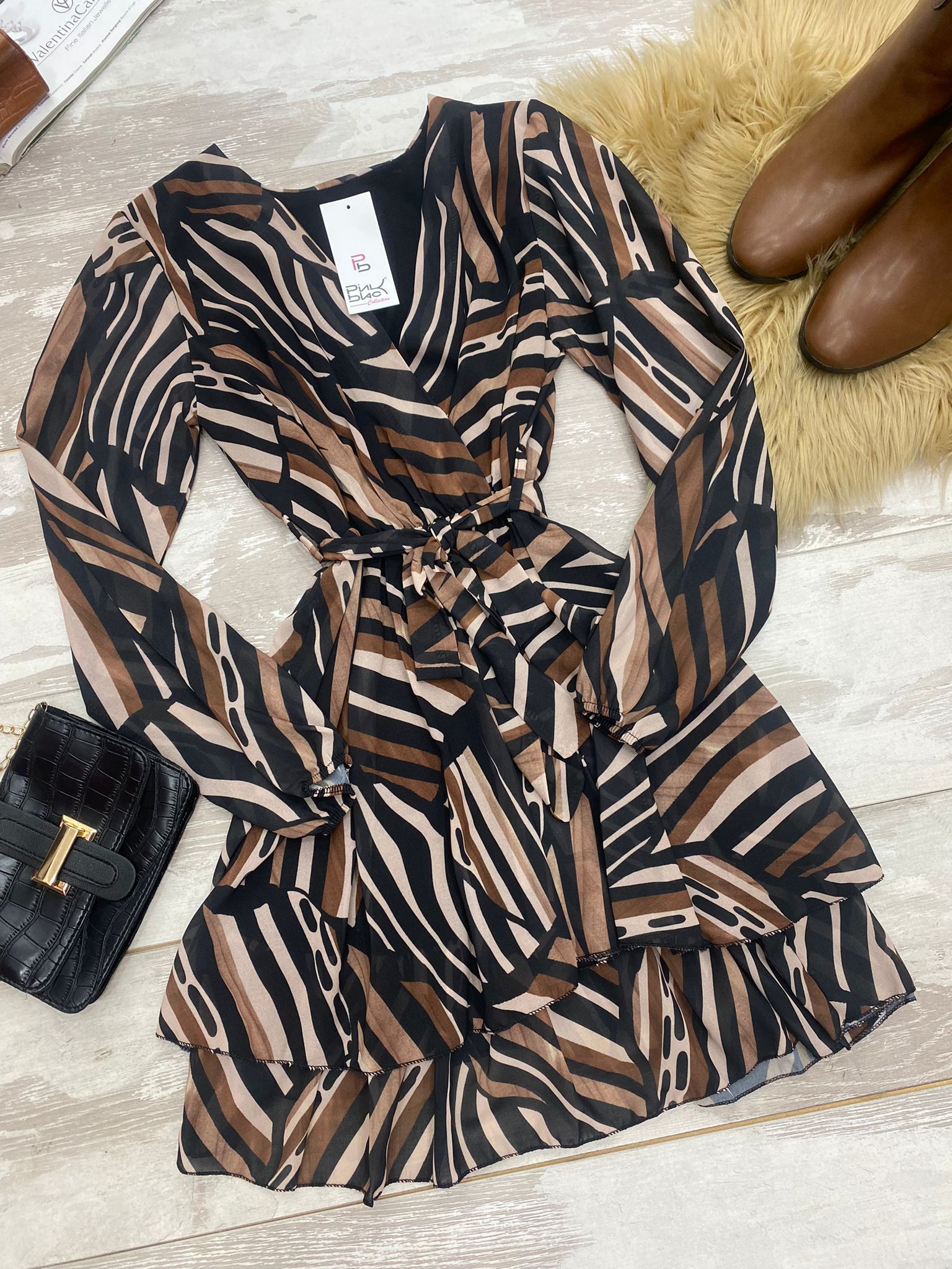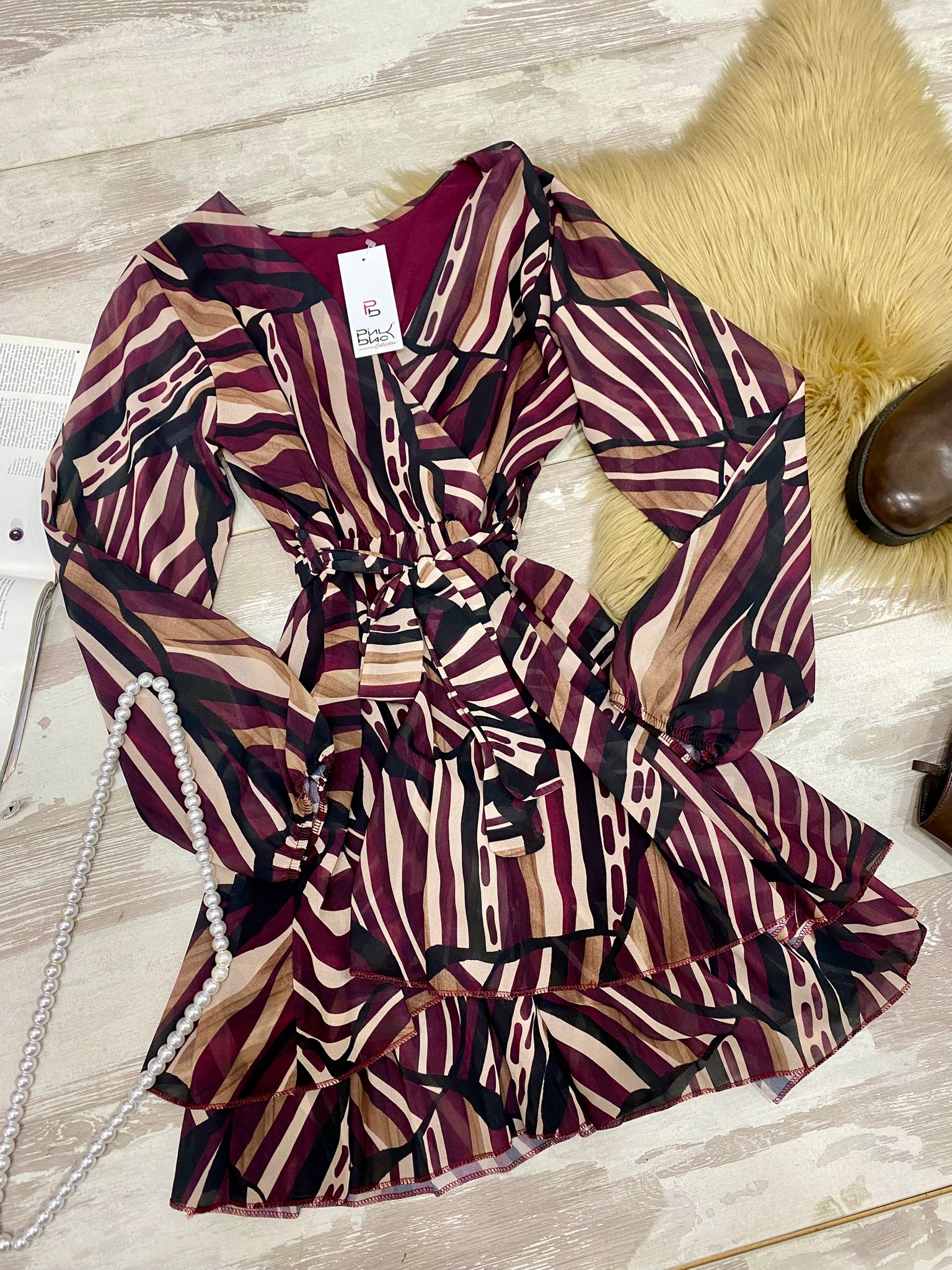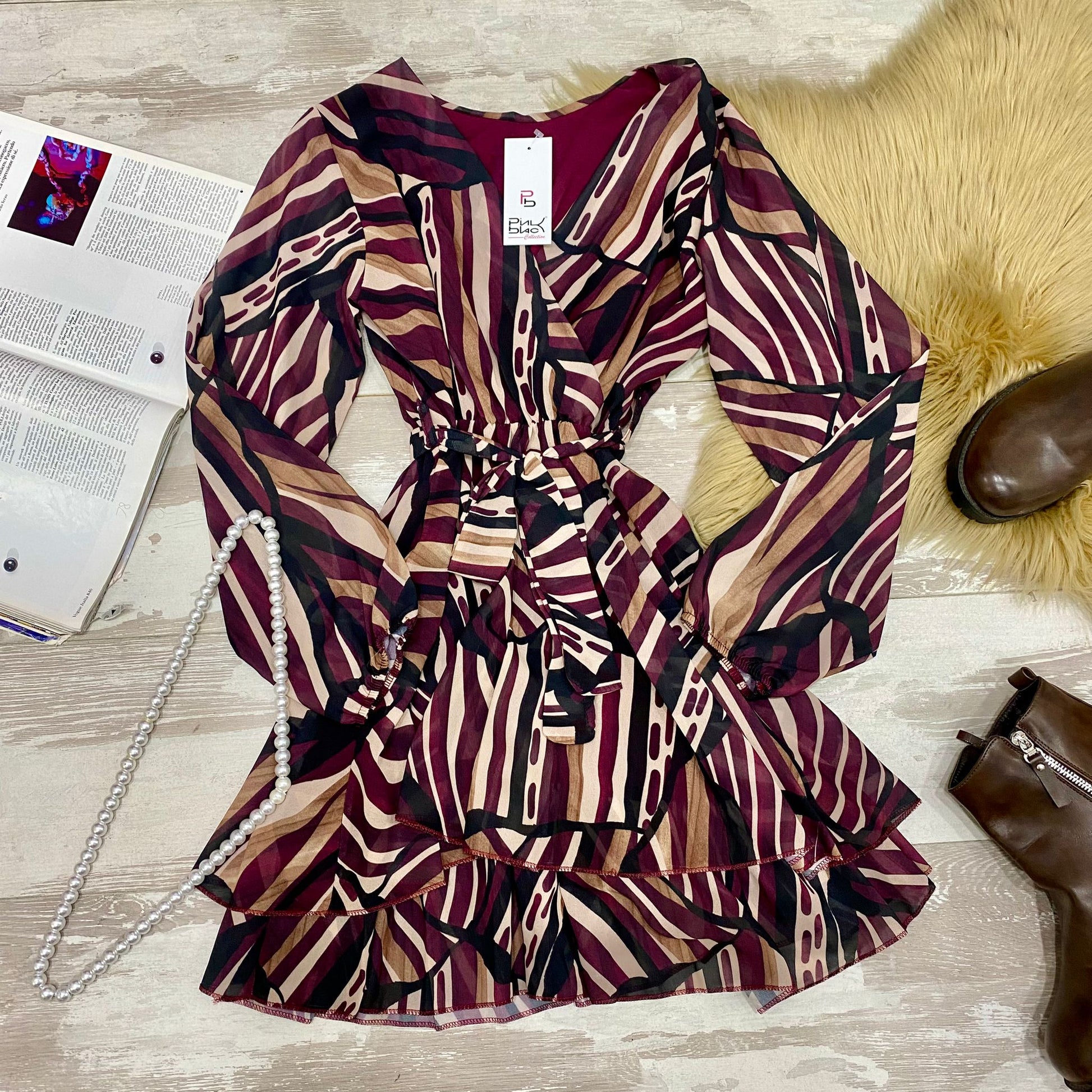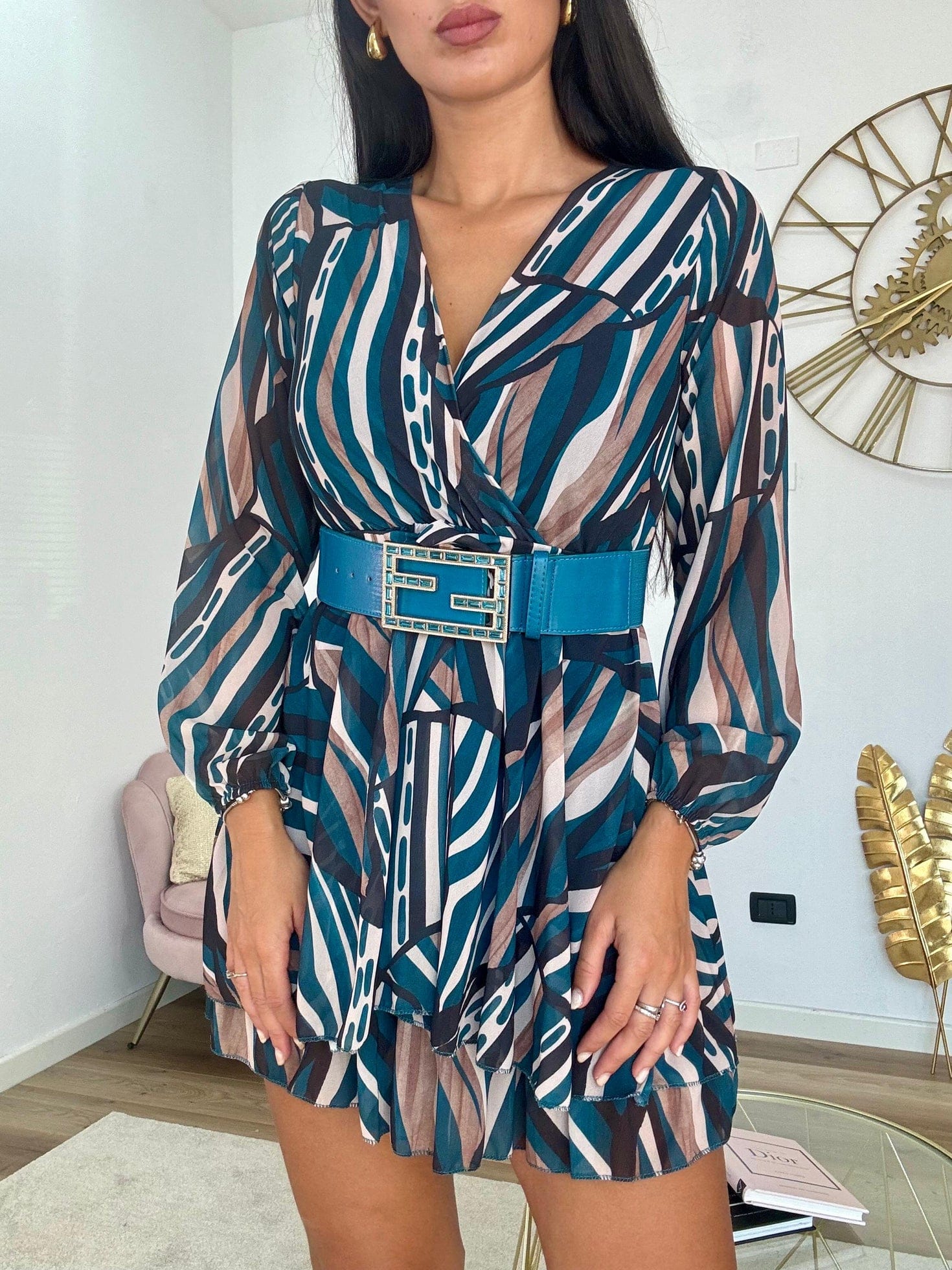 Abito in tessuto strutturato con fantasia astratta, elastico in vita e balze, cinturino in tinta incluso. Fabbricato in Italia.