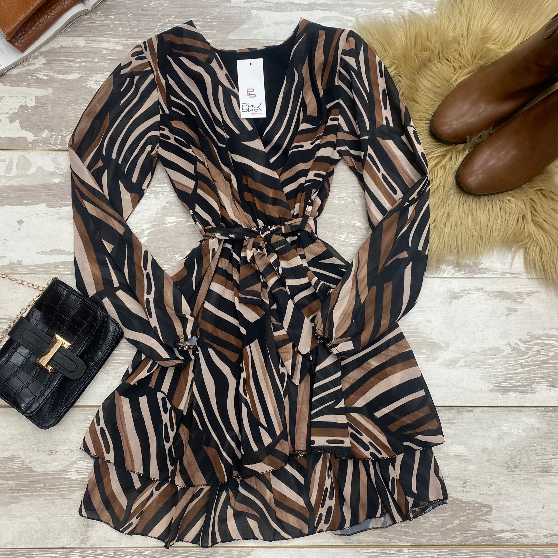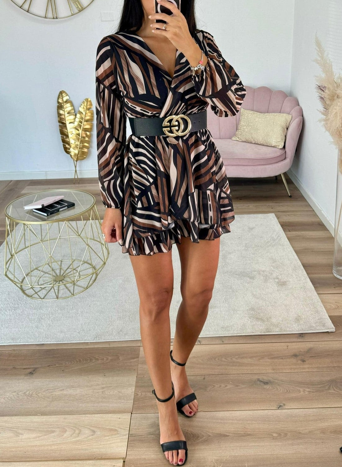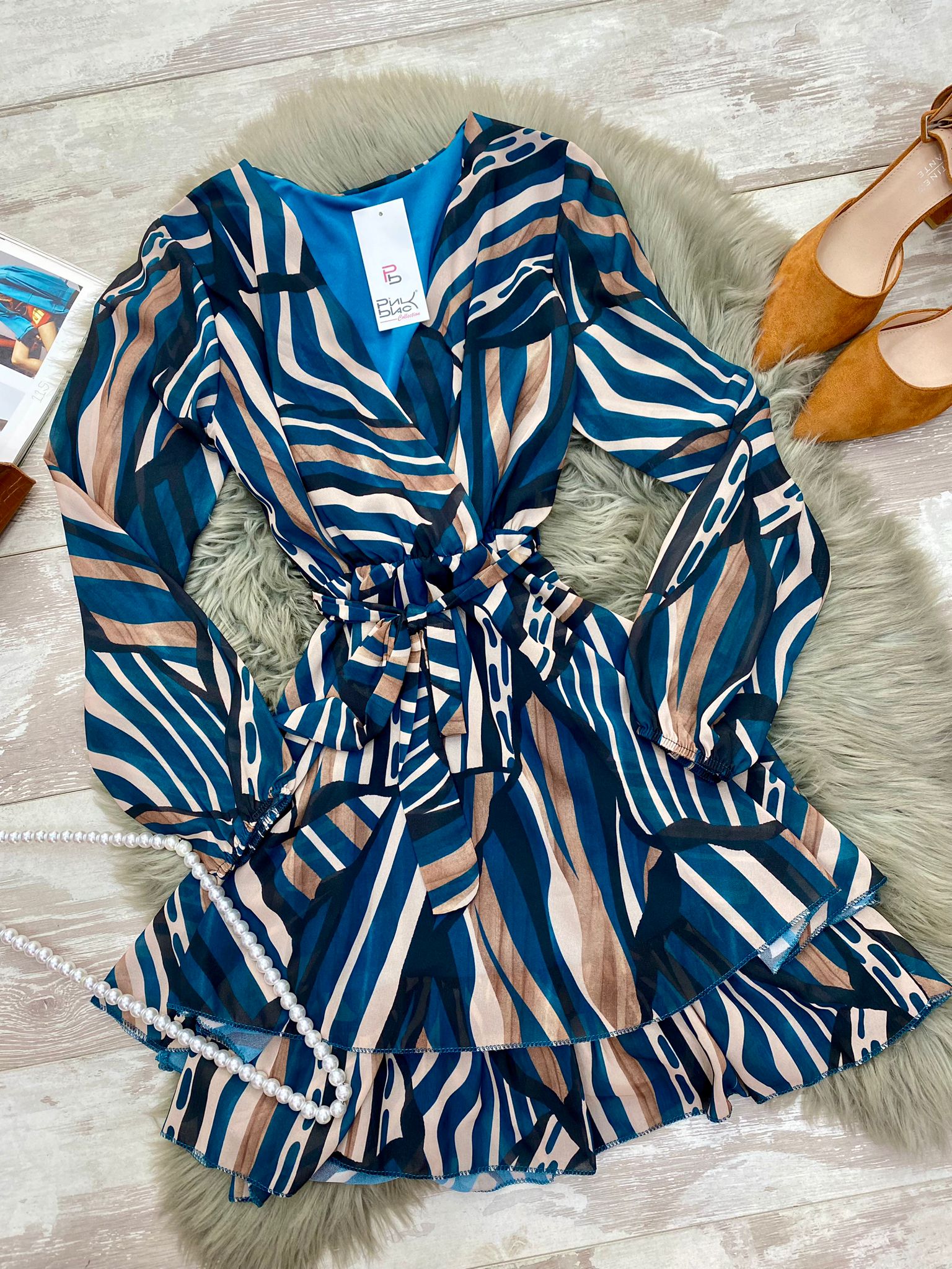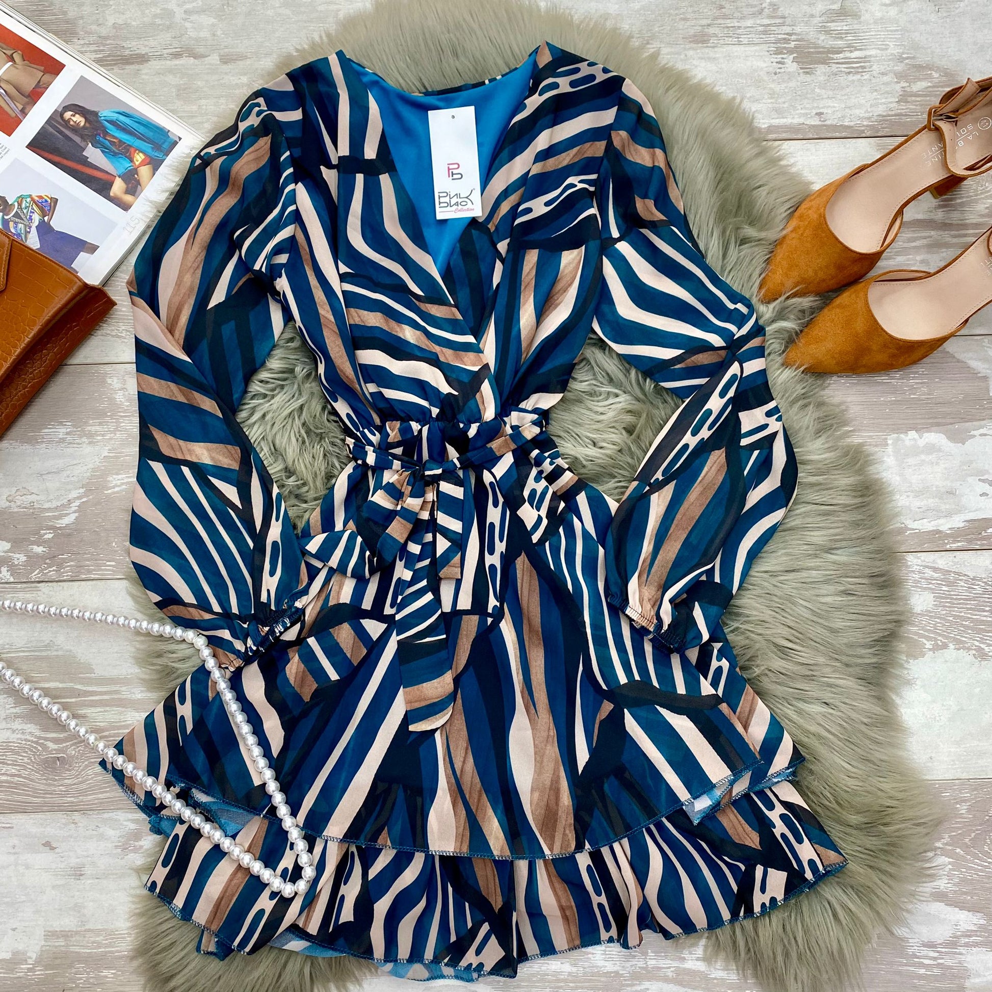 Abito in tessuto strutturato con fantasia astratta, elastico in vita e balze, cinturino in tinta incluso. Fabbricato in Italia.