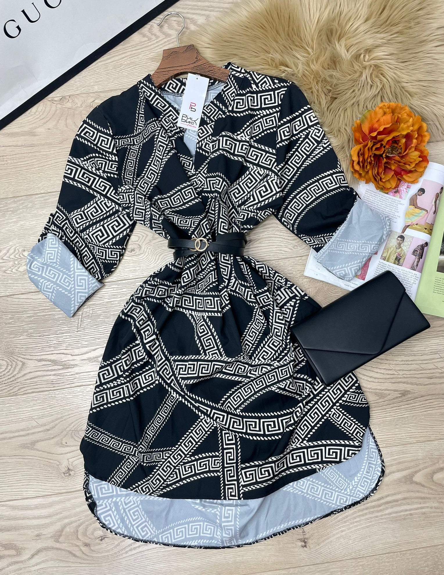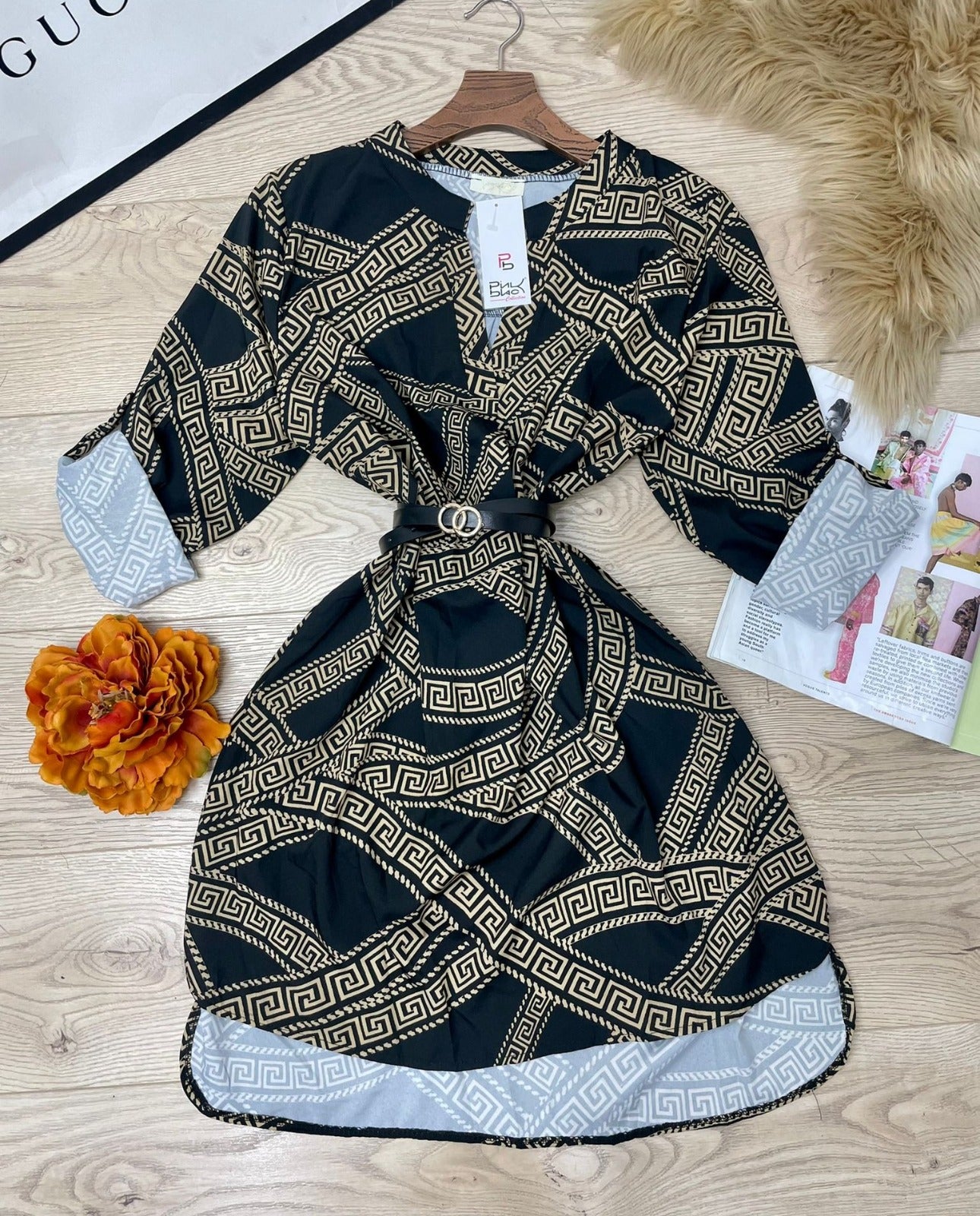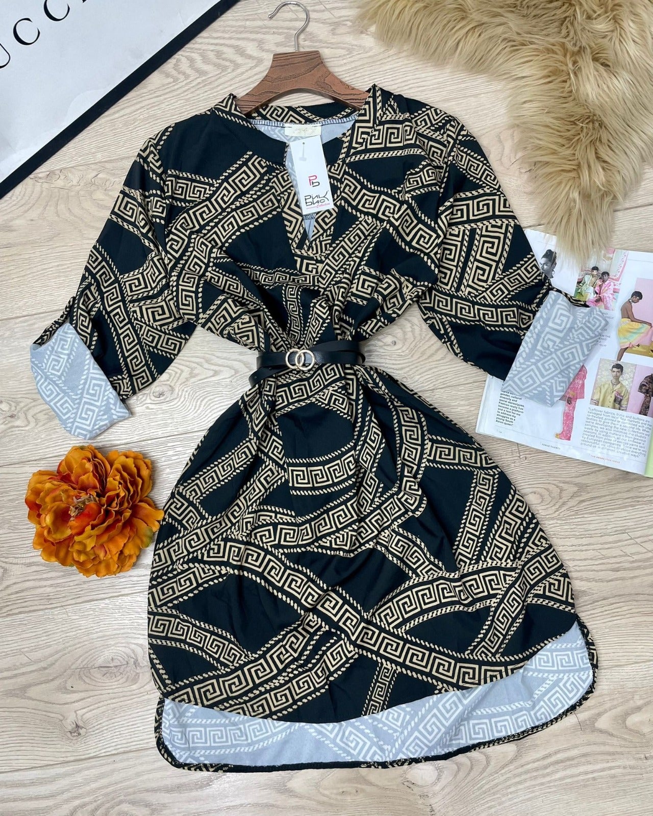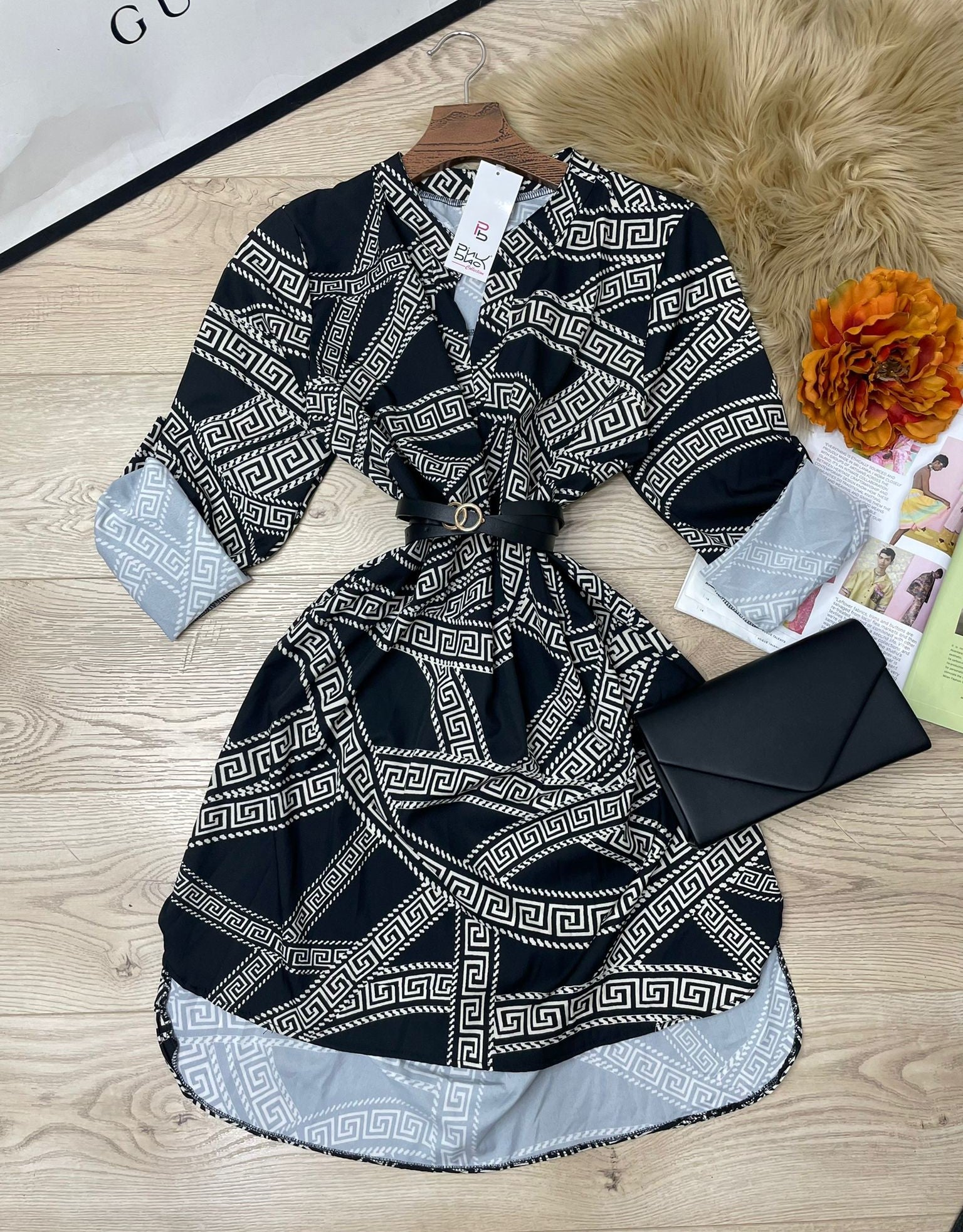 Abito in leggero tessuto strutturato con fantasia astratta, manica lunga con risvolto e cintura inclusa. Fabbricato in Italia.
