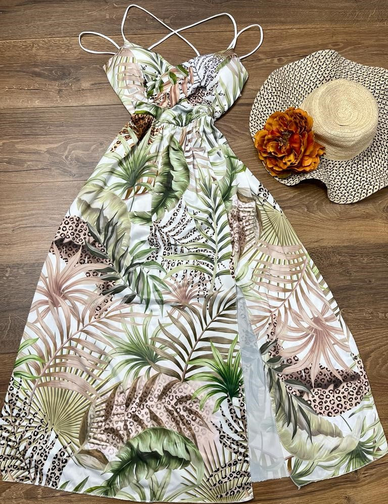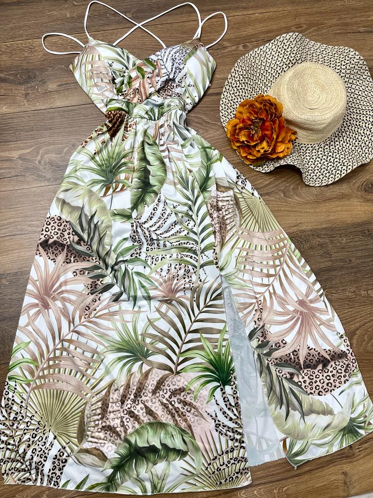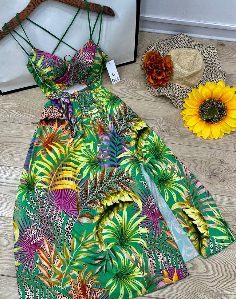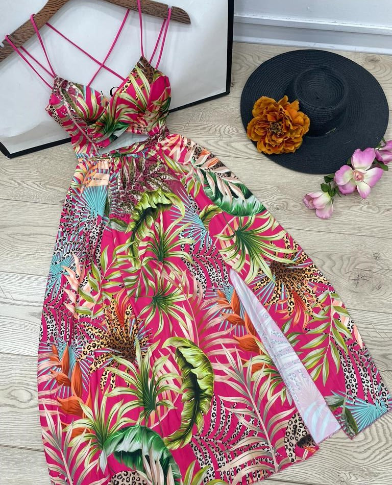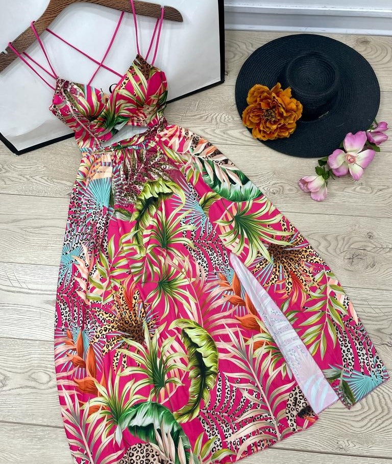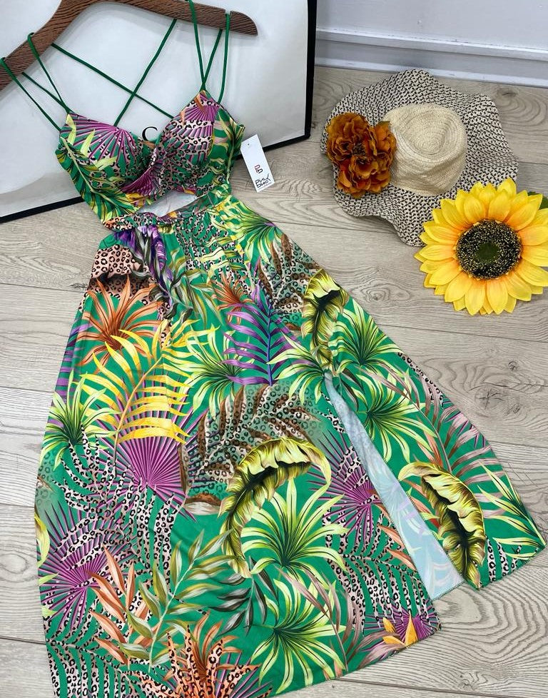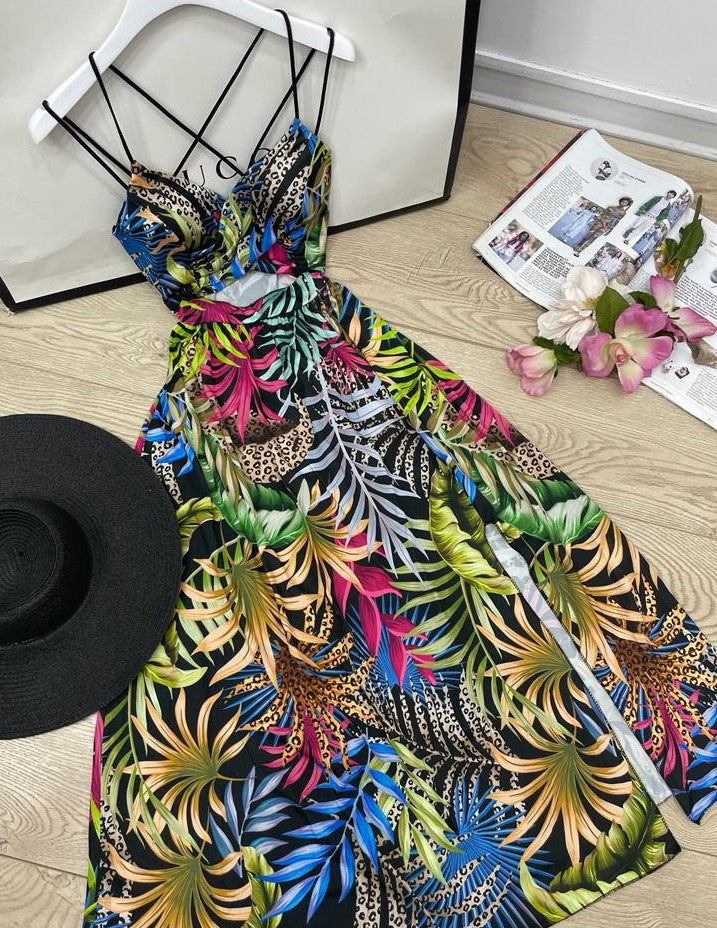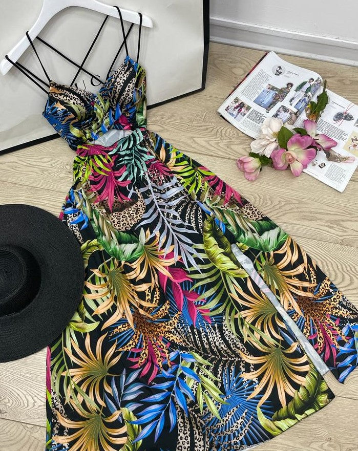 Abito effetto lycra con fantasia tropicale, coppe preformate, apertura centrale, elastico in vita e spacco. Fabbricato in Italia.