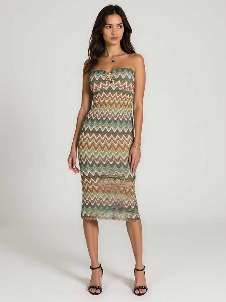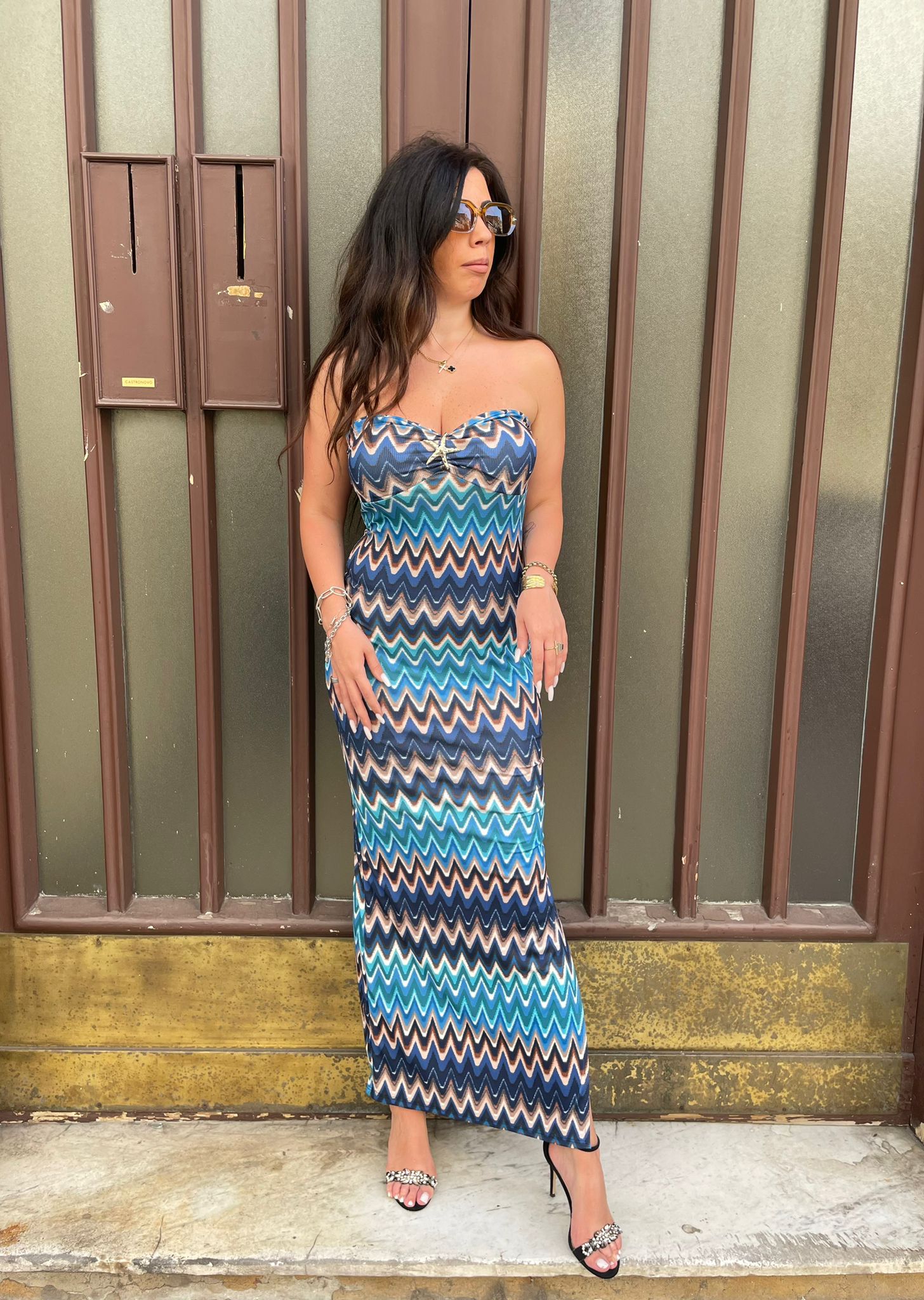 Abito lungo aderente ed elasticizzato con fantasia astratta con dettaglio a forma di stella colore oro nella parte centrale della scollatura