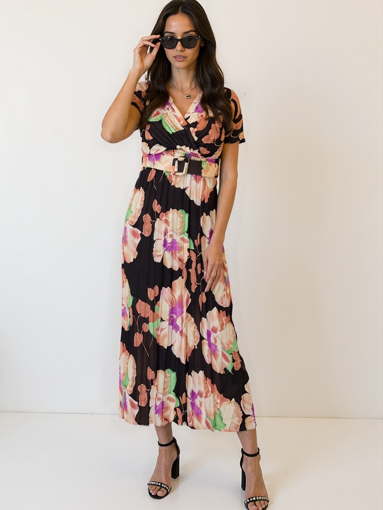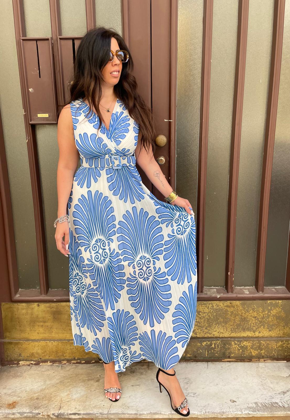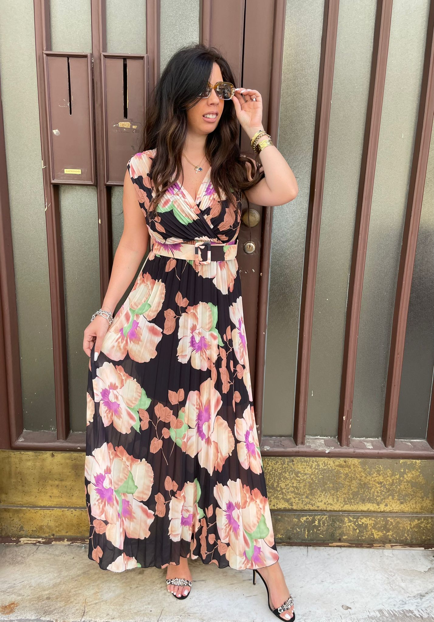 Abito lungo smanicato con fantasia floreale, elastico in vita e cinturino incluso.