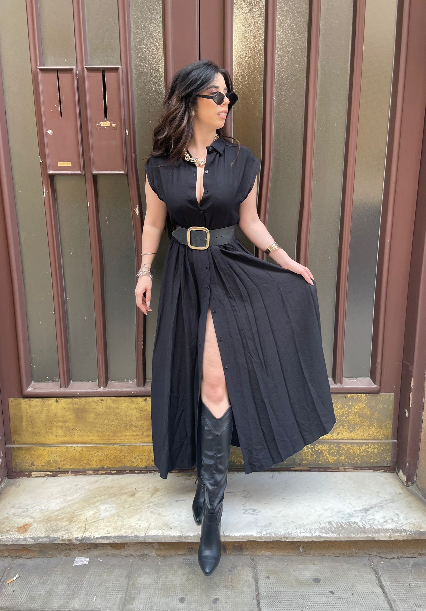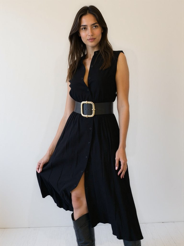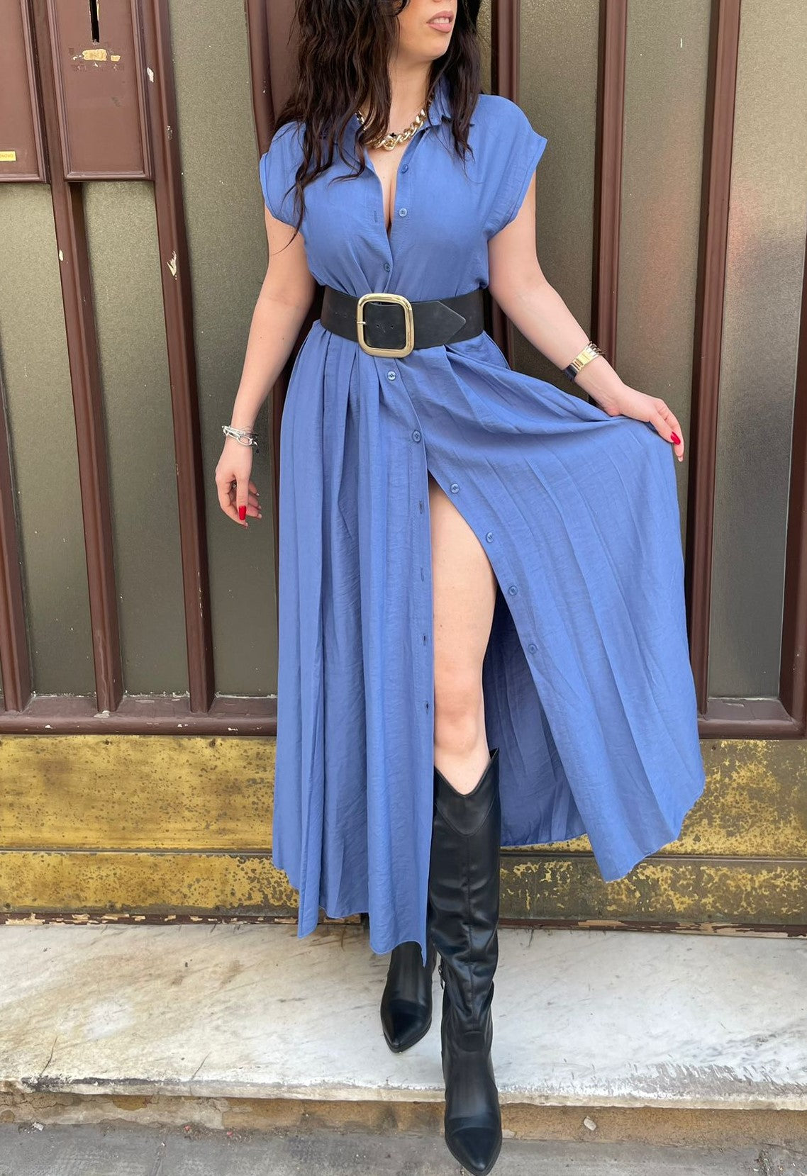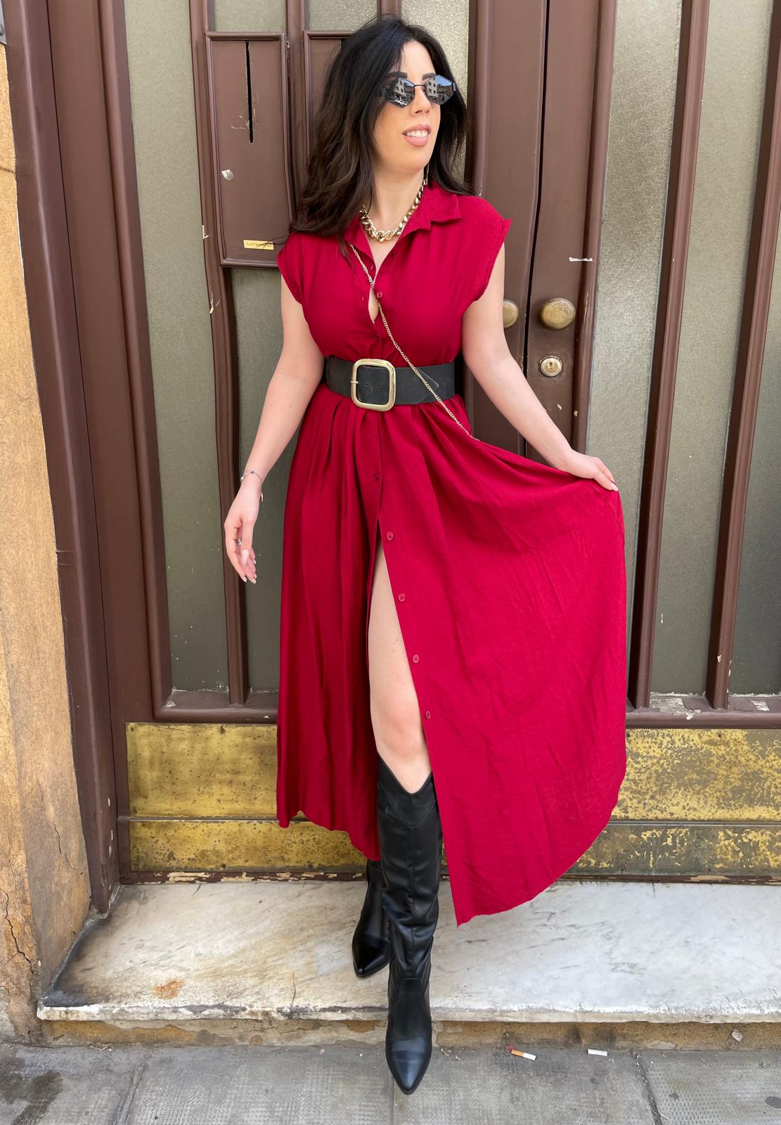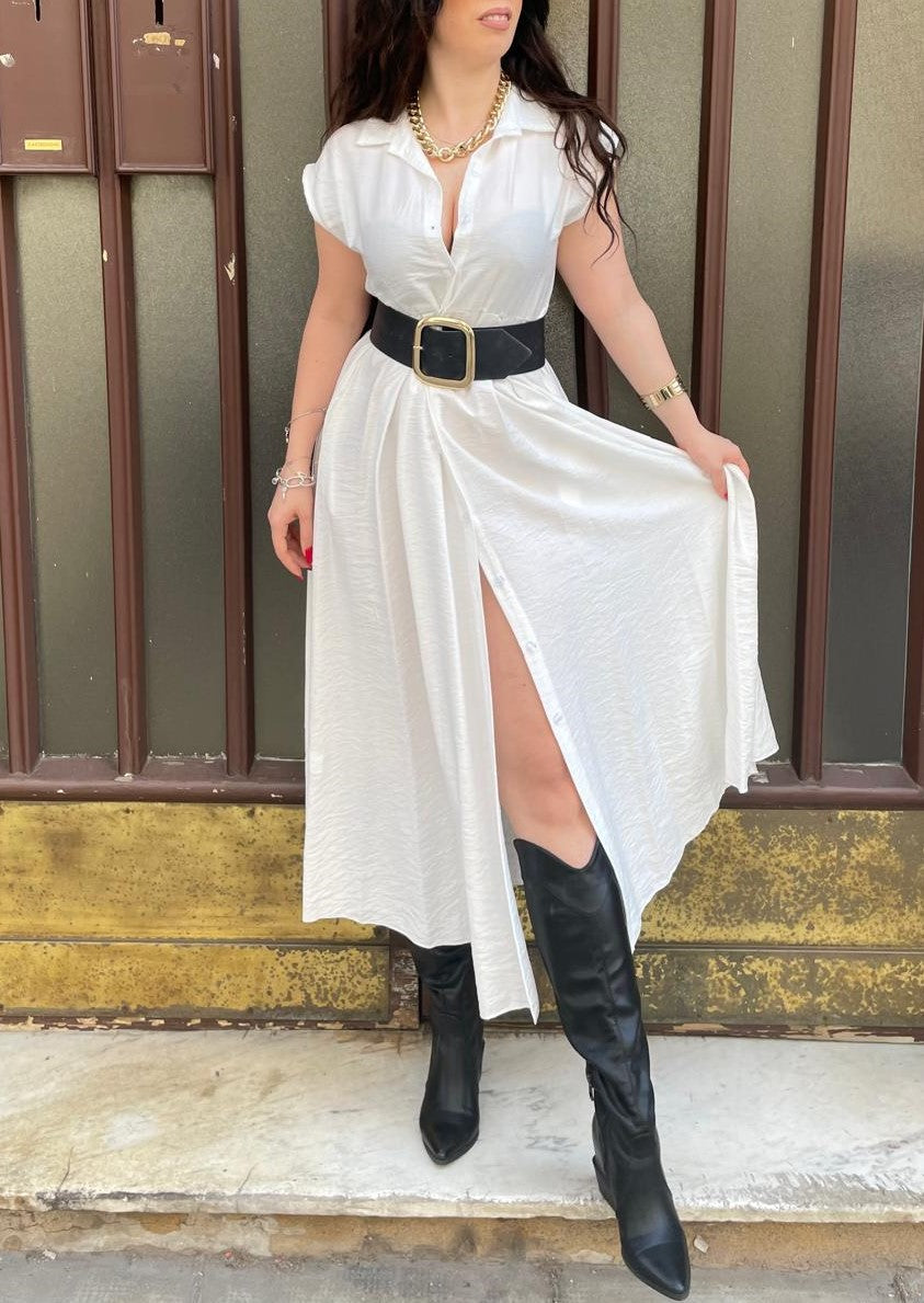 Abito lungo modello camicione con bottoni centrali e cinturino in tessuto incluso.