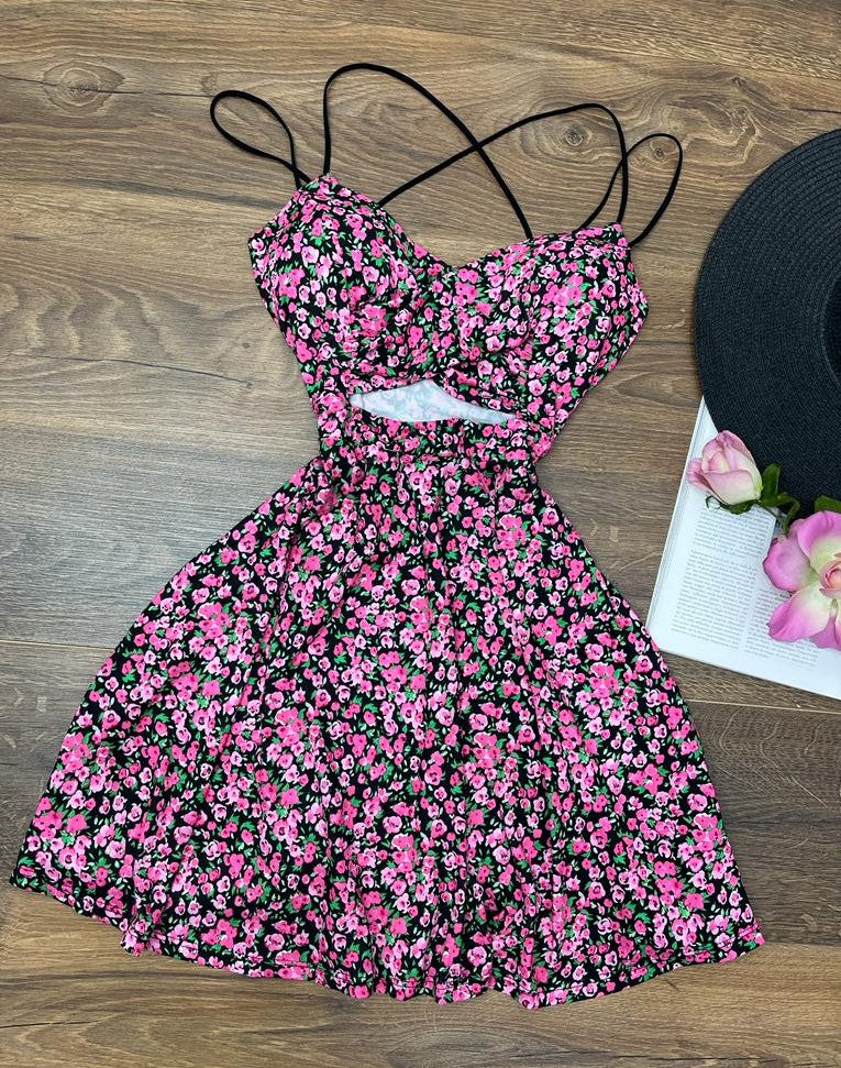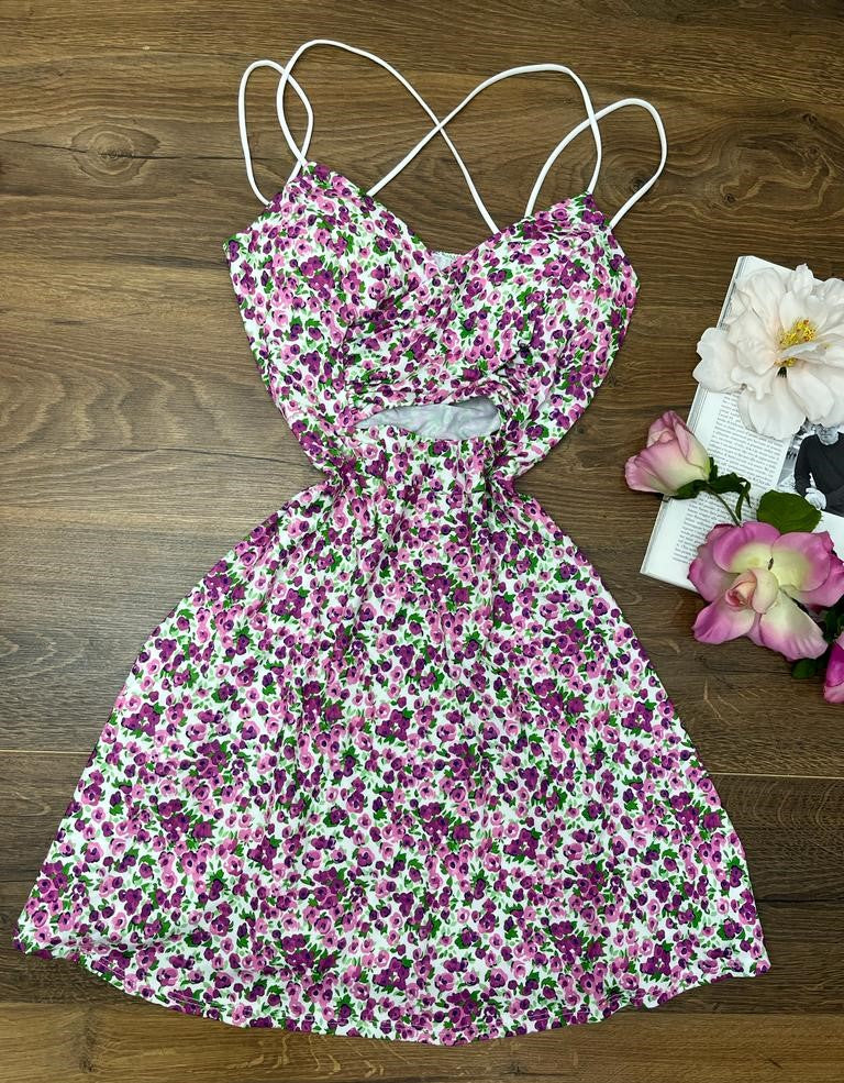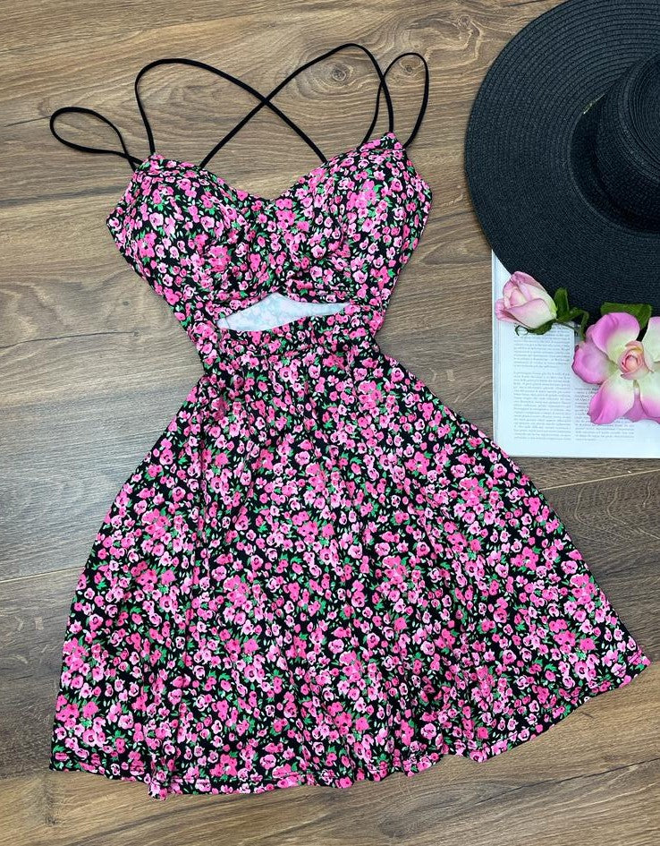Abito in lycra con fantasia floreale, coppe preformate, apertura e spalline ad incrocio. Fabbricato in Italia.