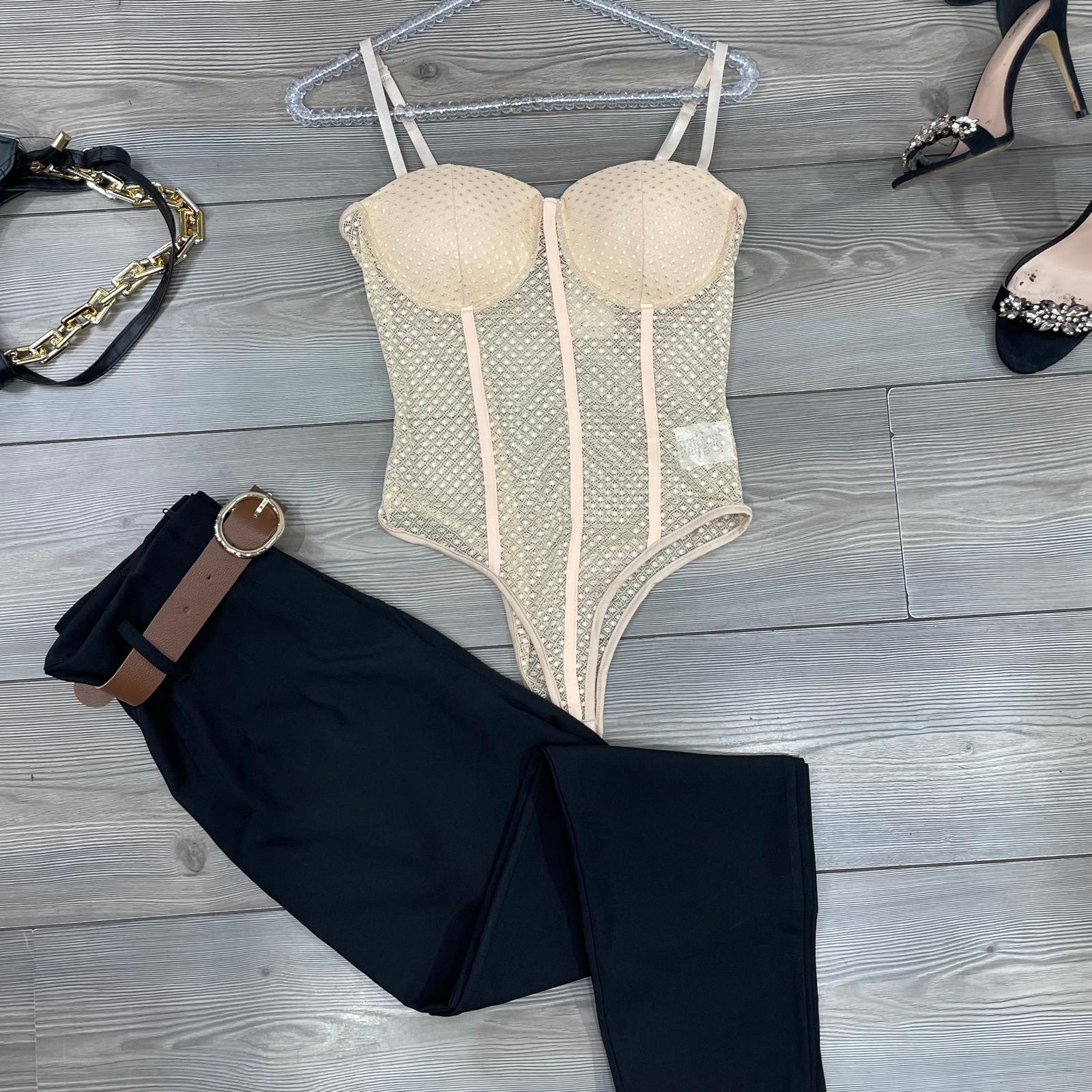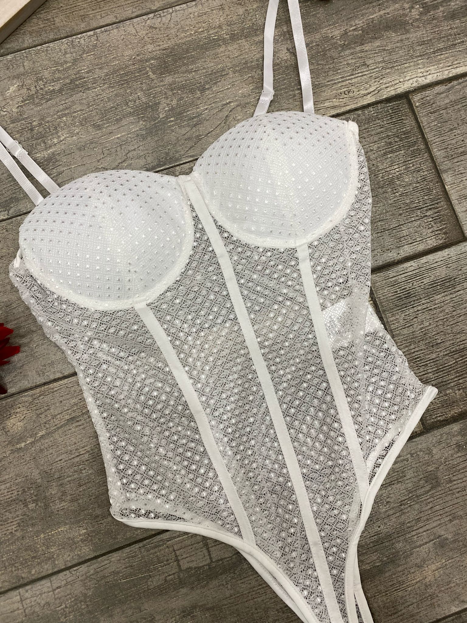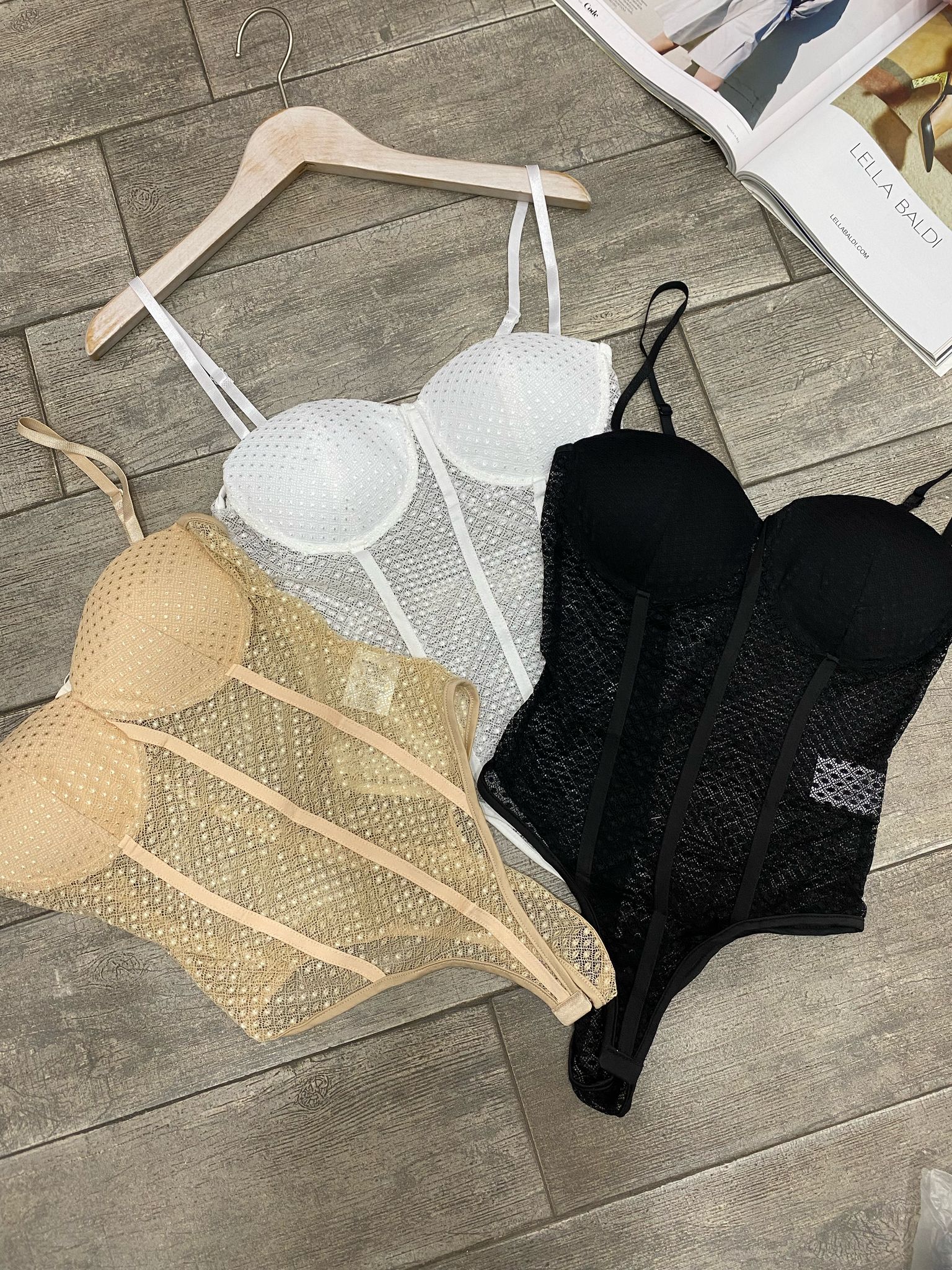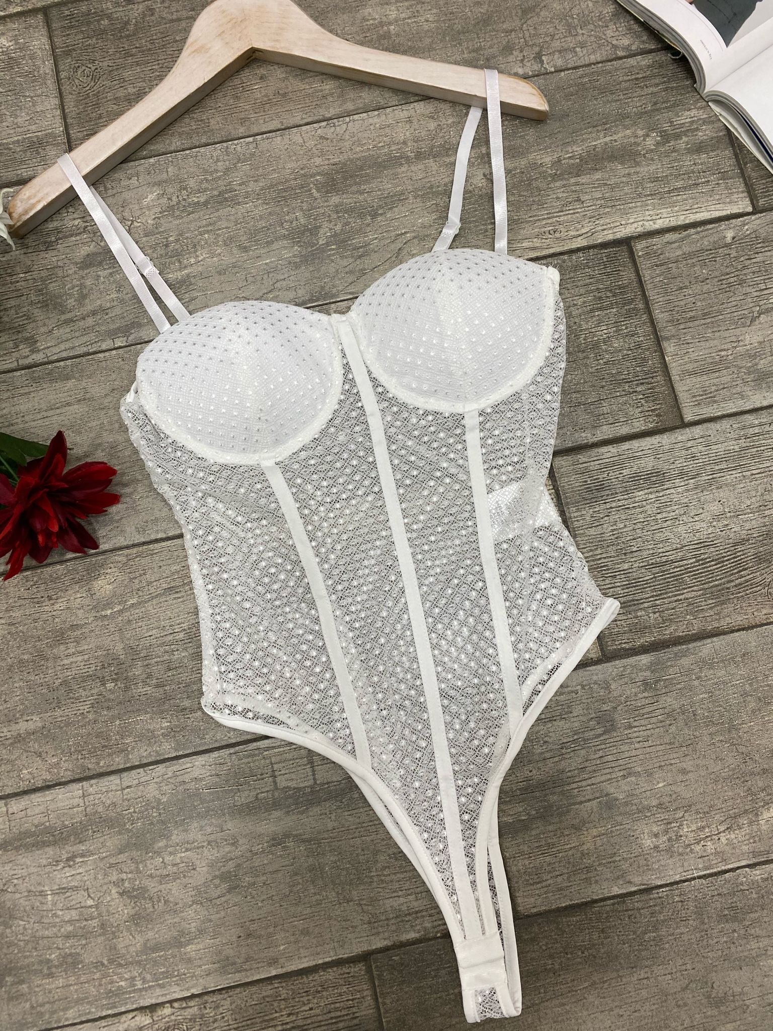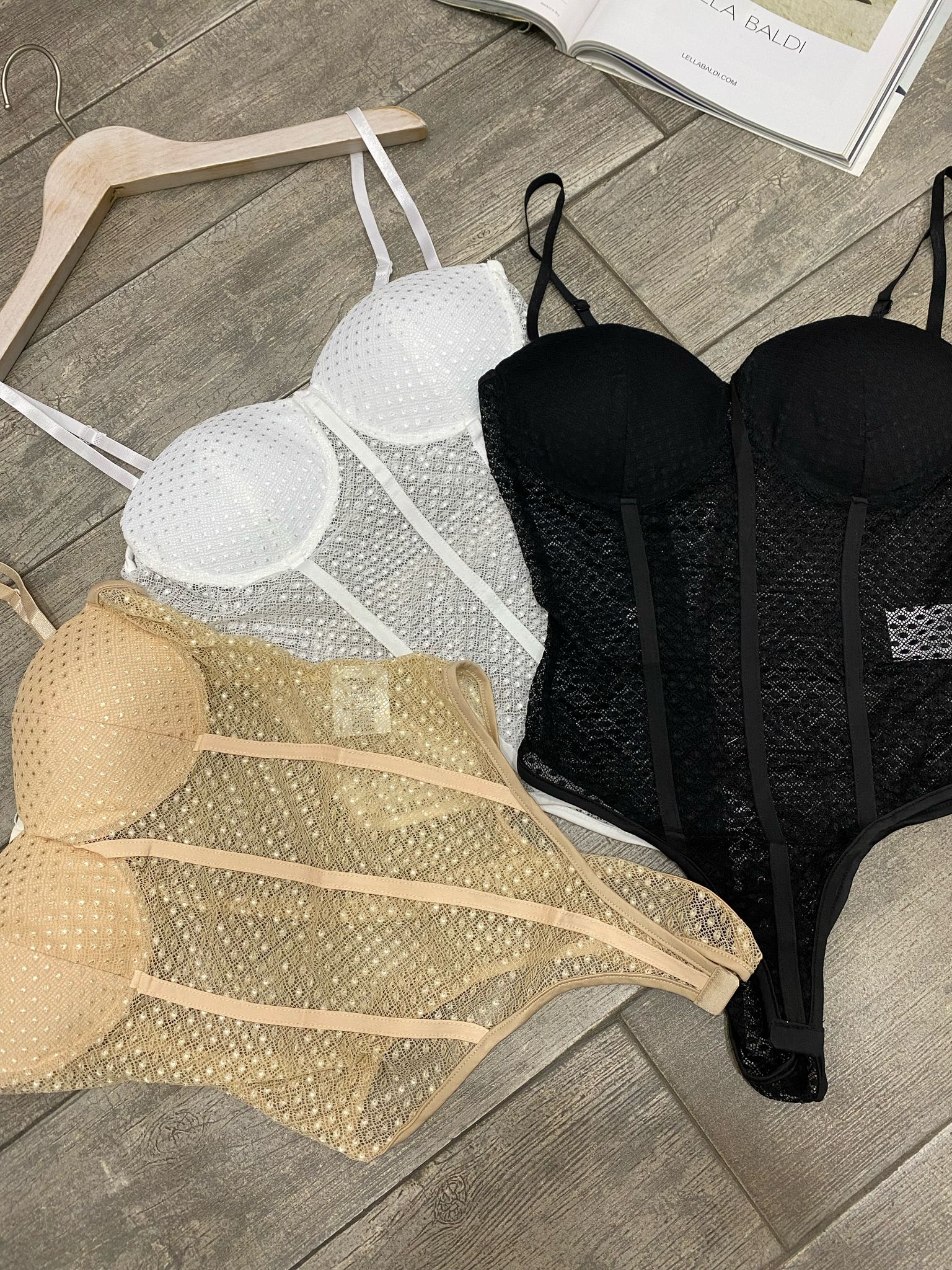 Body in pizzo con scollo a V, coppe preformate, spalline regolabili e chiusura con ganci sul cavallo. Chic, risalta la silhouette e il dècollettè per un look seducente e raffinato e una vestibilità ottimale e alla moda.