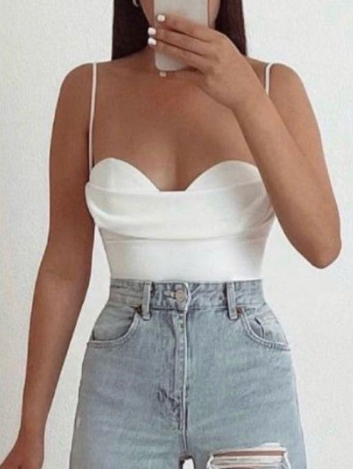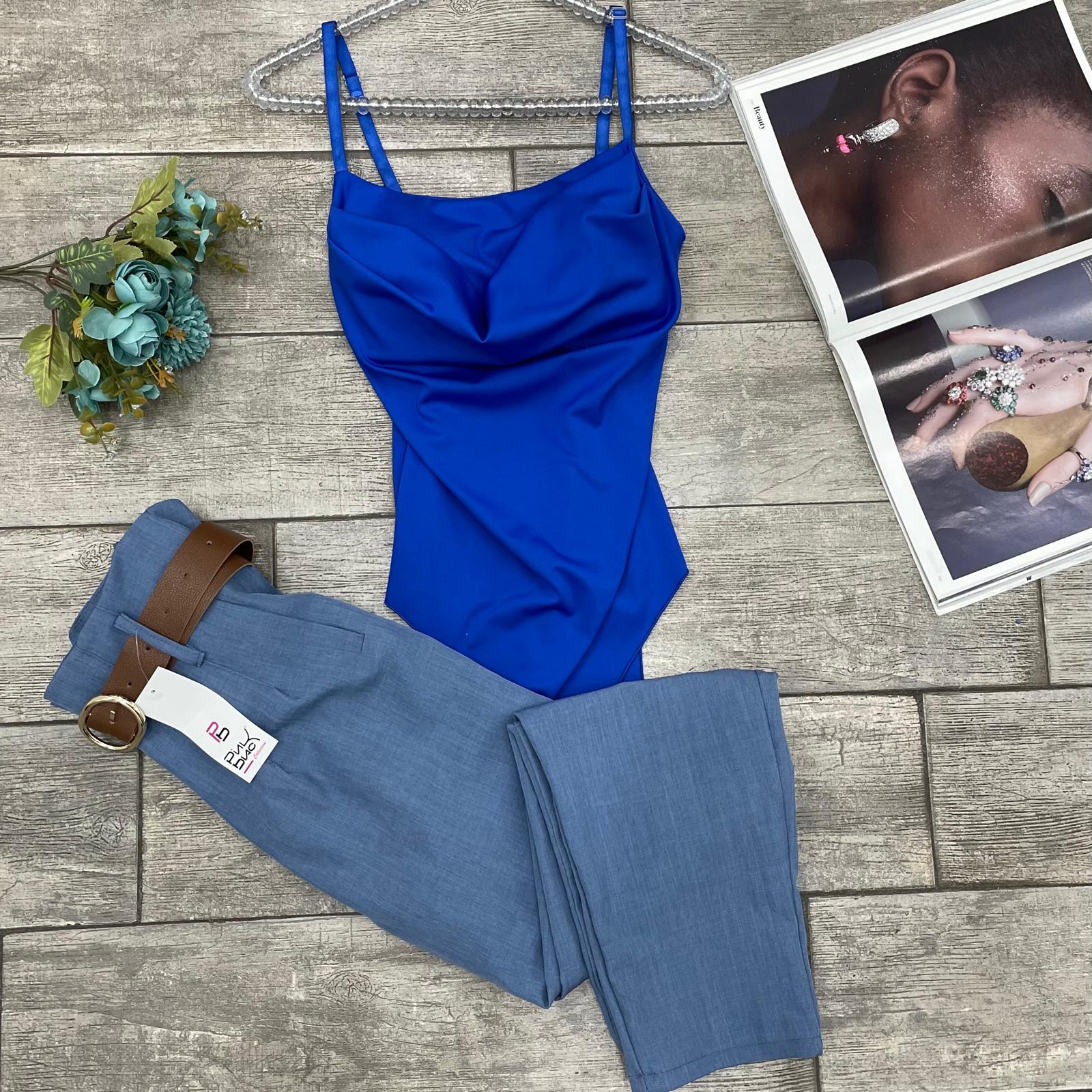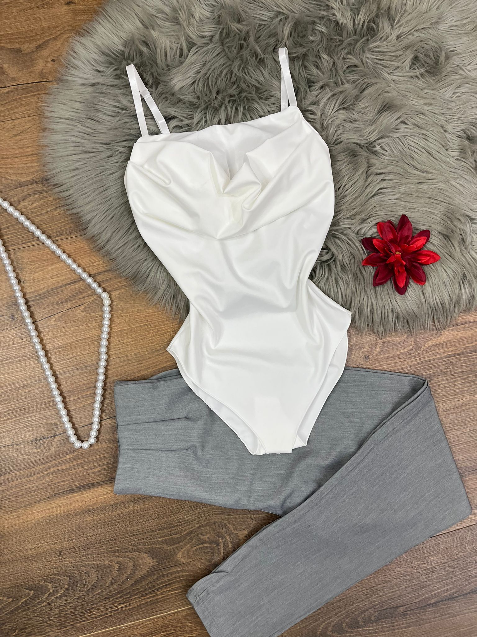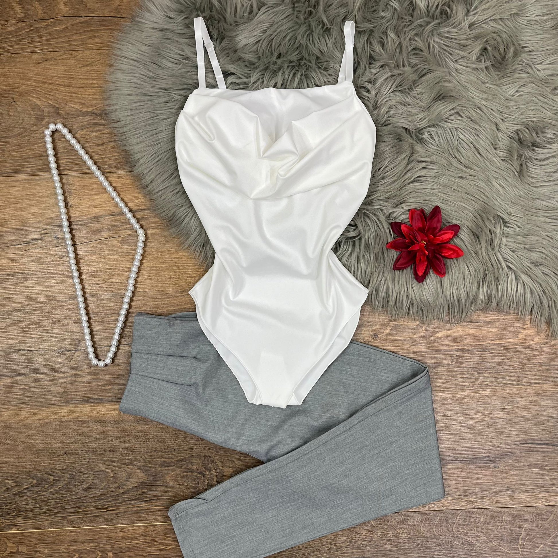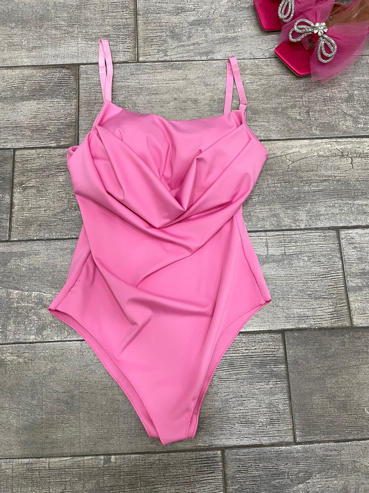 Body effetto lycra con balza, coppe preformate e chiusura ganci sul cavallo. Fabbricato in Italia.
