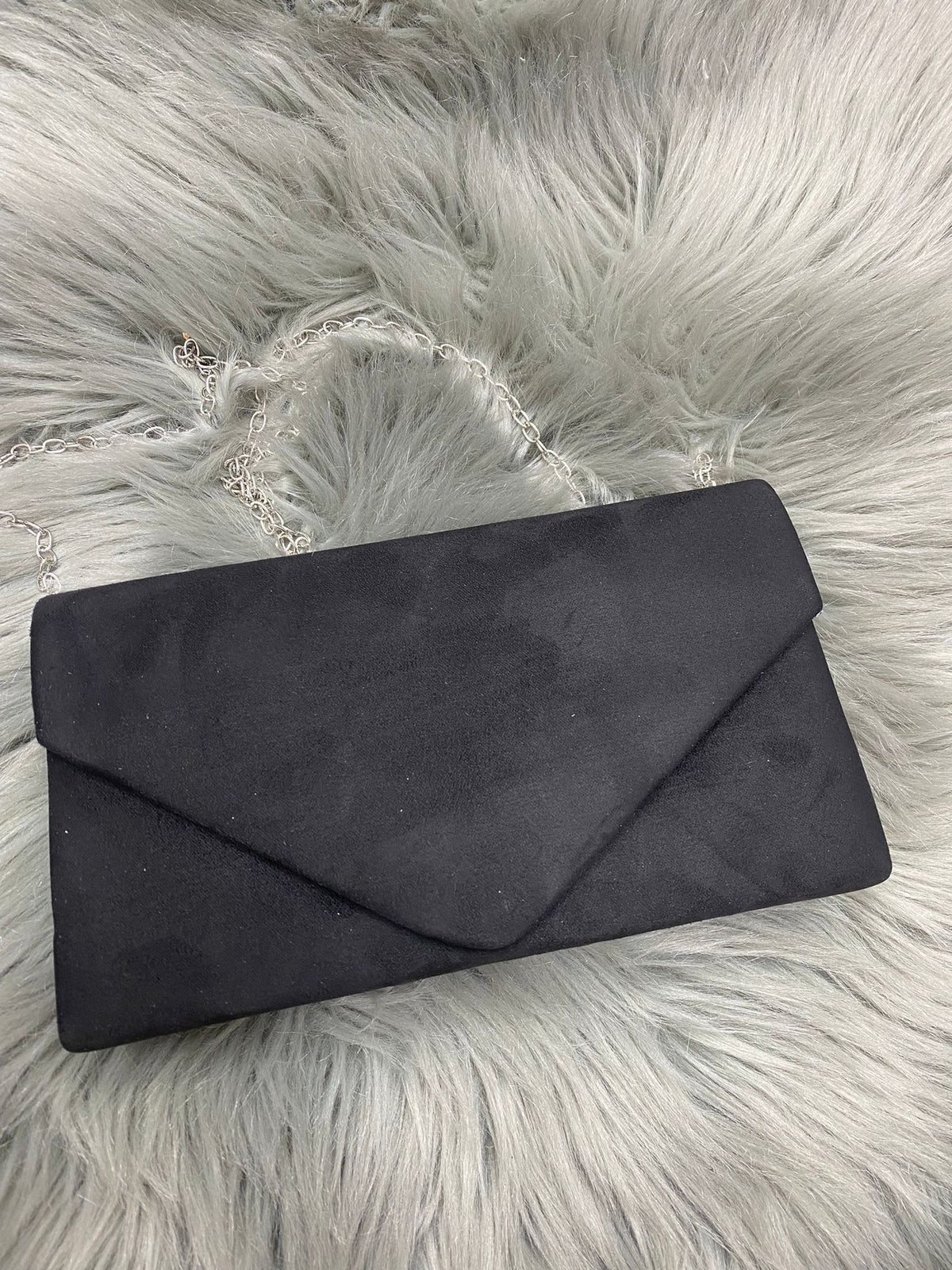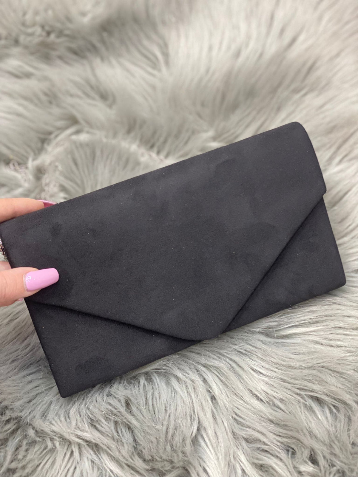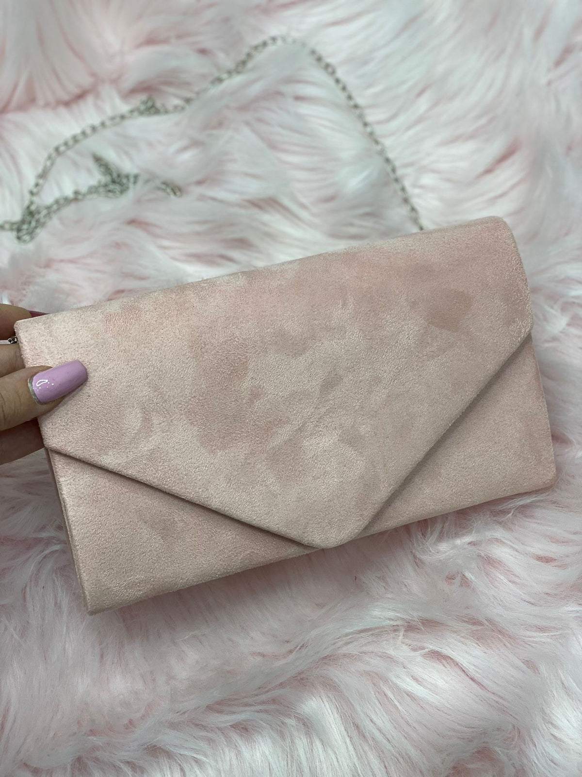 Pochette rettangolare effetto scamosciato, tracolla in catena removibile e chiusura magnetica.