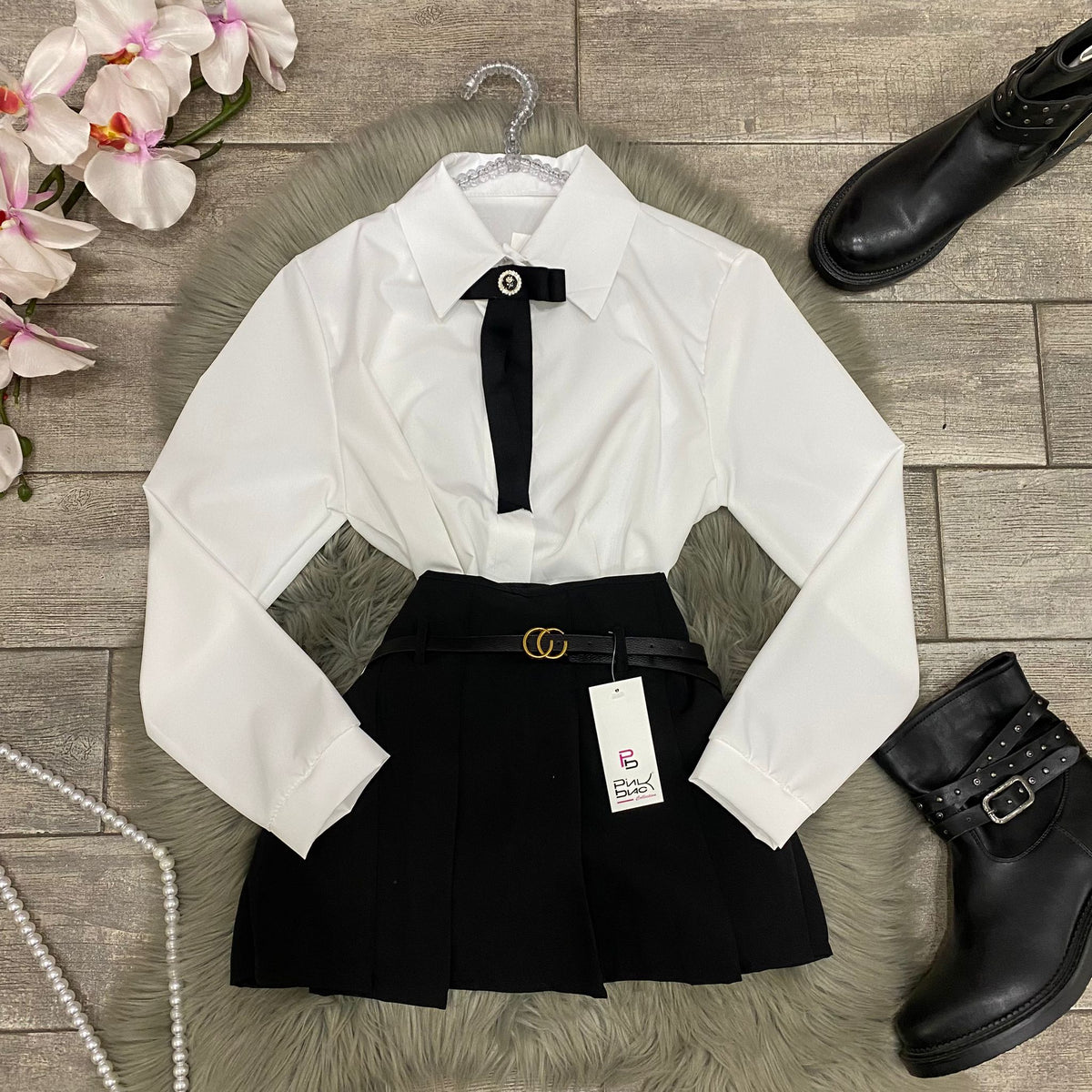 Camicia con bottoni centrali e spilla con fiocco in tessuto centrale removibile
