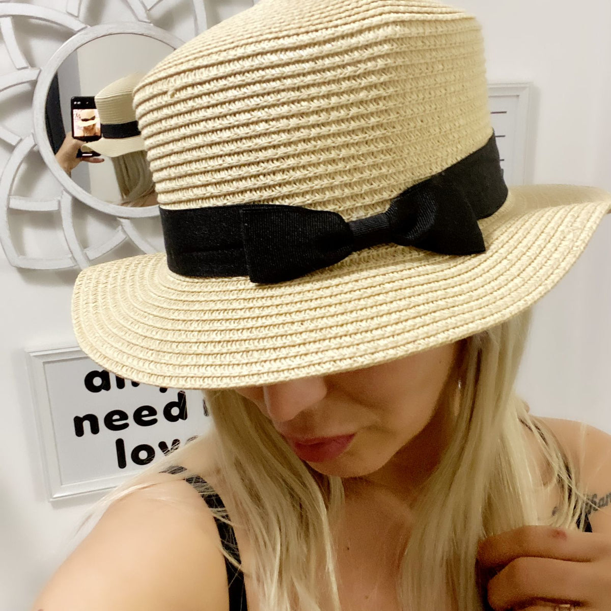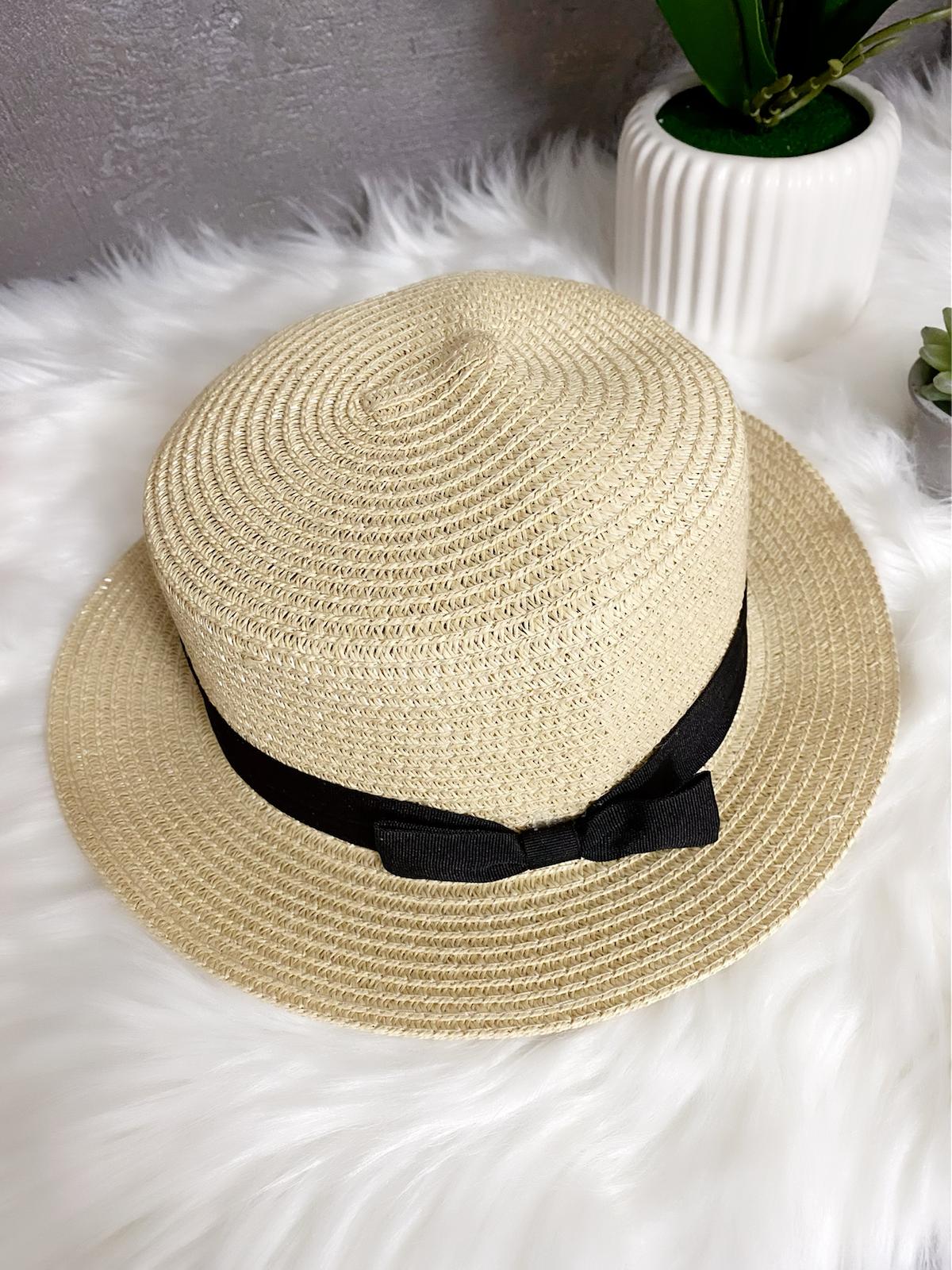 Perforierter Strohhut mit enger Klappe und Farbband.
