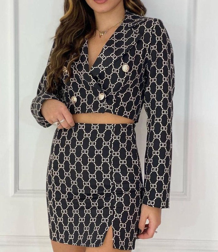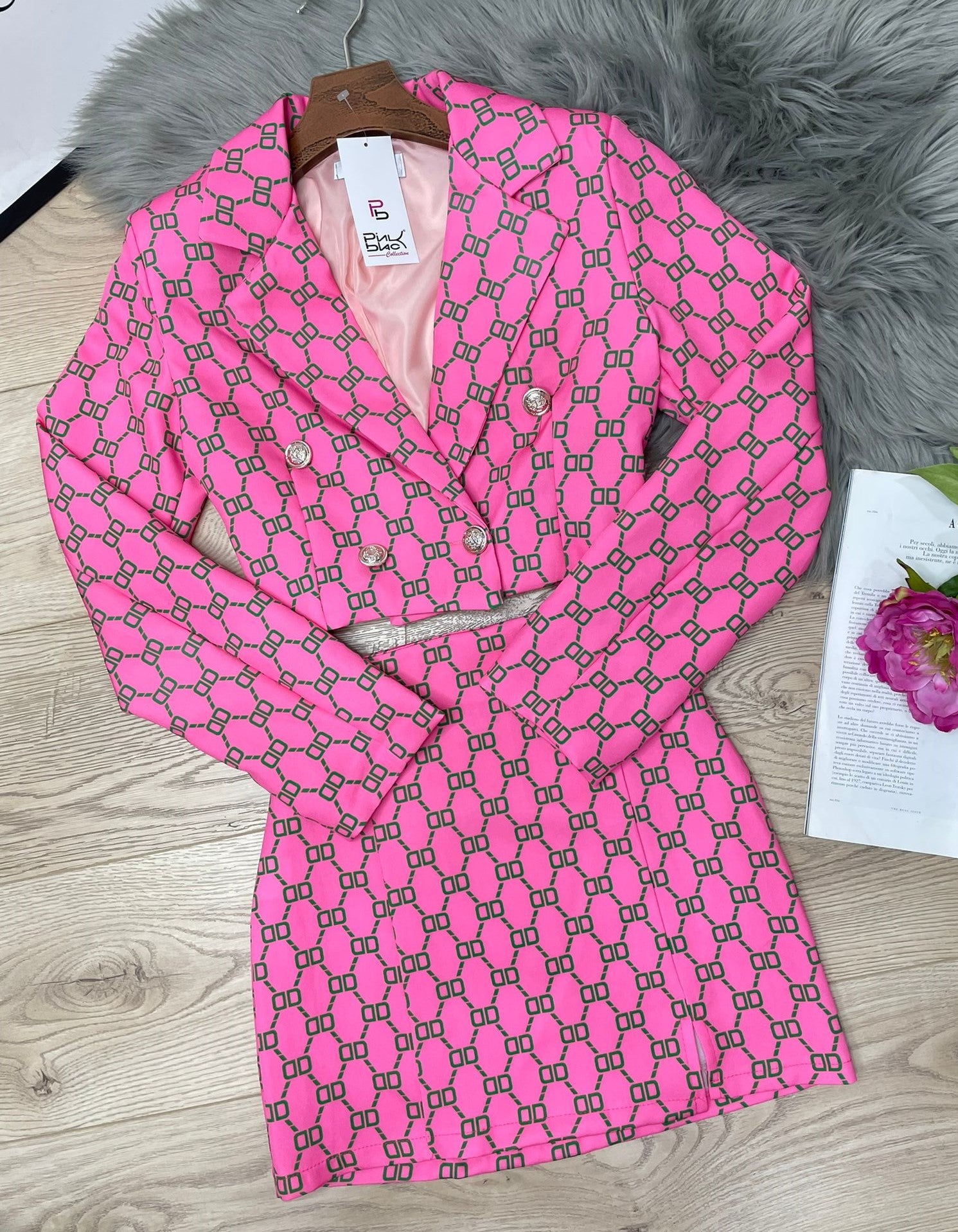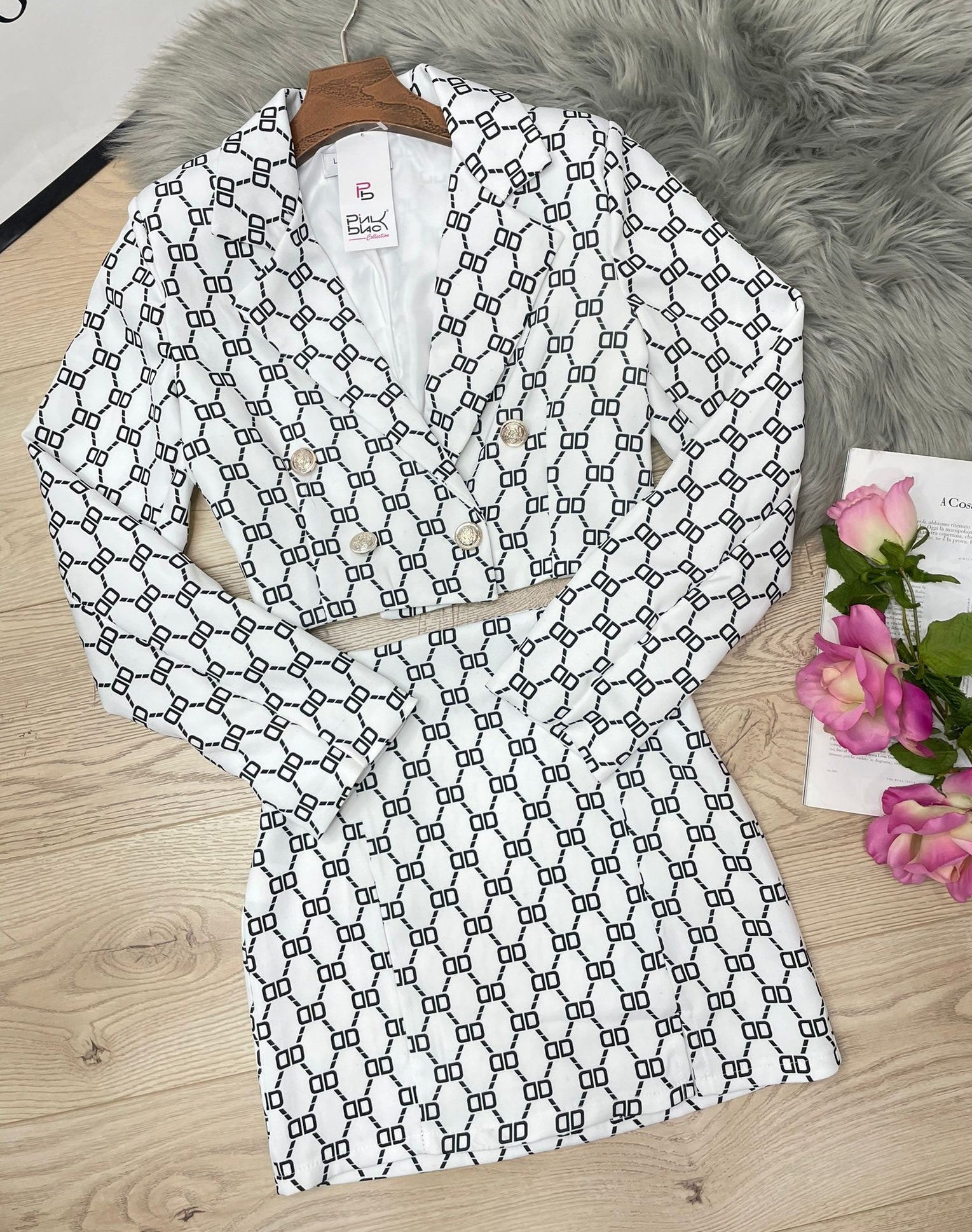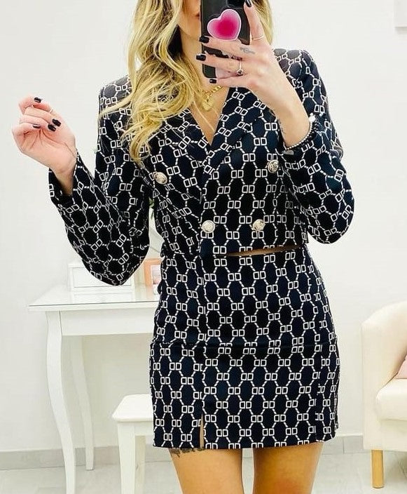 Komplette Jacke - strukturierter Stoffrock mit abstrakter Fantasie. Kurzmodelljacke mit klassischem Rever, Kreuzkreuz, Knöpfe und Langarm mit gepolsterten Innen-Schultergurten; Minirock mit kleinem Schlitz und Seitenverschluss mit Reißverschluss. Glamour, passt sich an verschiedene Anlässe an, für ein vielseitiges und modisches Look. Die Anpassung von Größen ist regelmäßig. Hergestellt in Italien.