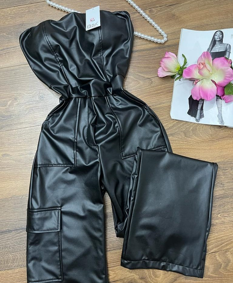Tuta in ecopelle con coppe preformate, spalline regolabili, pantalone a zampa con tasconi e chiusura con cerniera. Fabbricato in Italia.