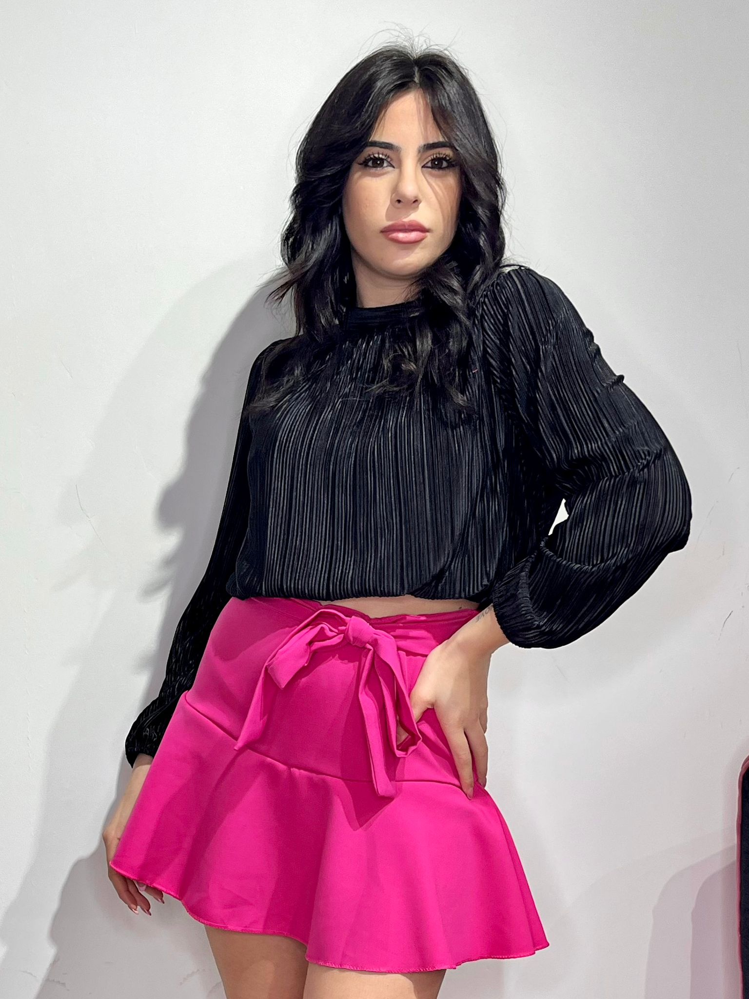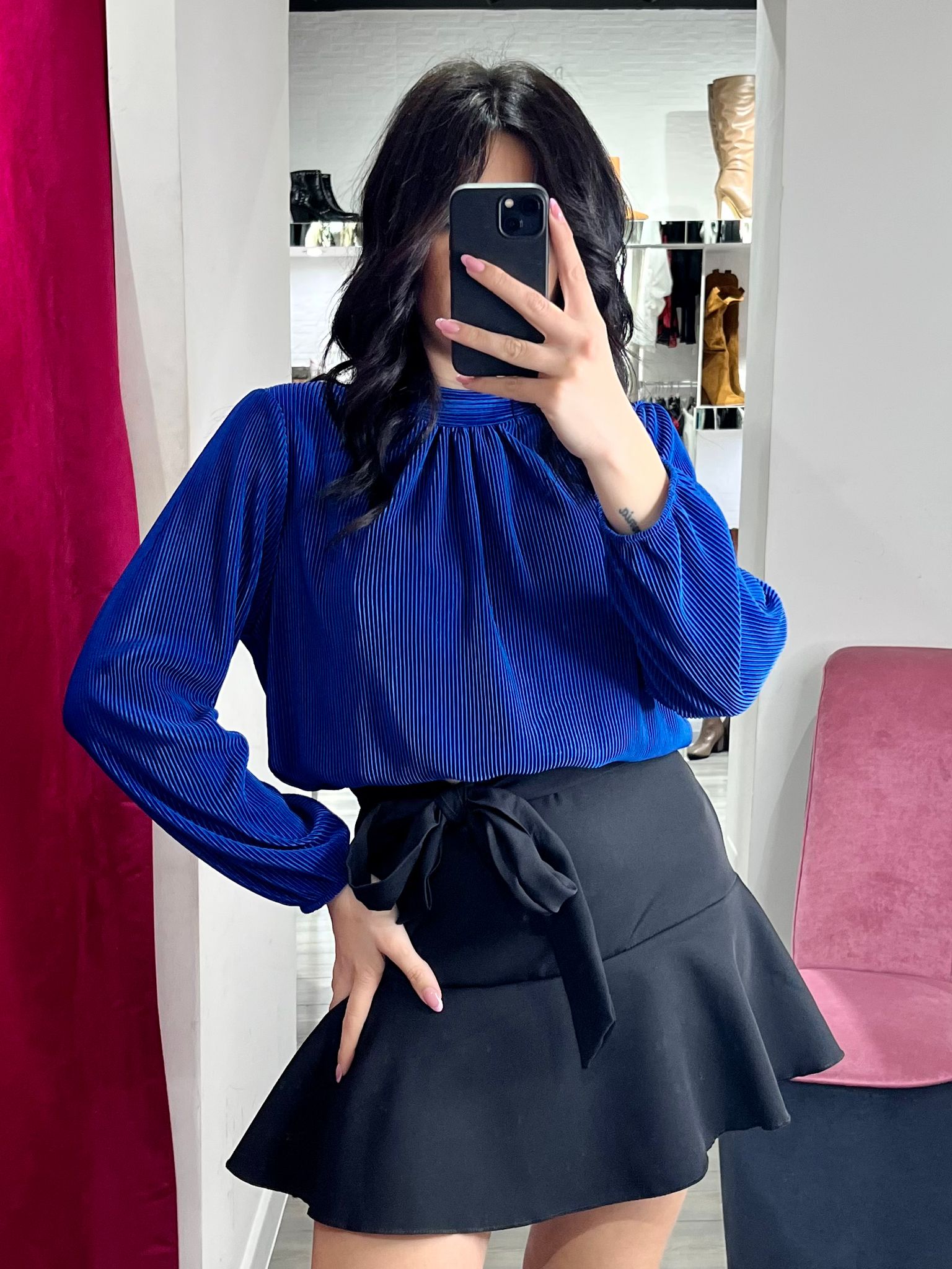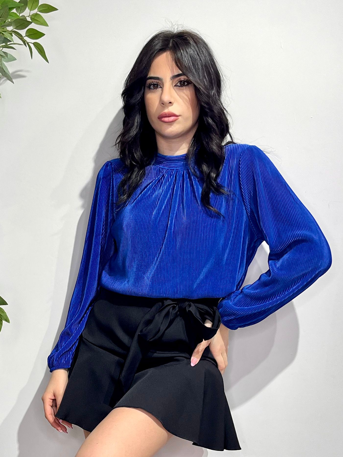 Maglia plissettata con manica lunga a palloncino. Fabbricato in Italia.