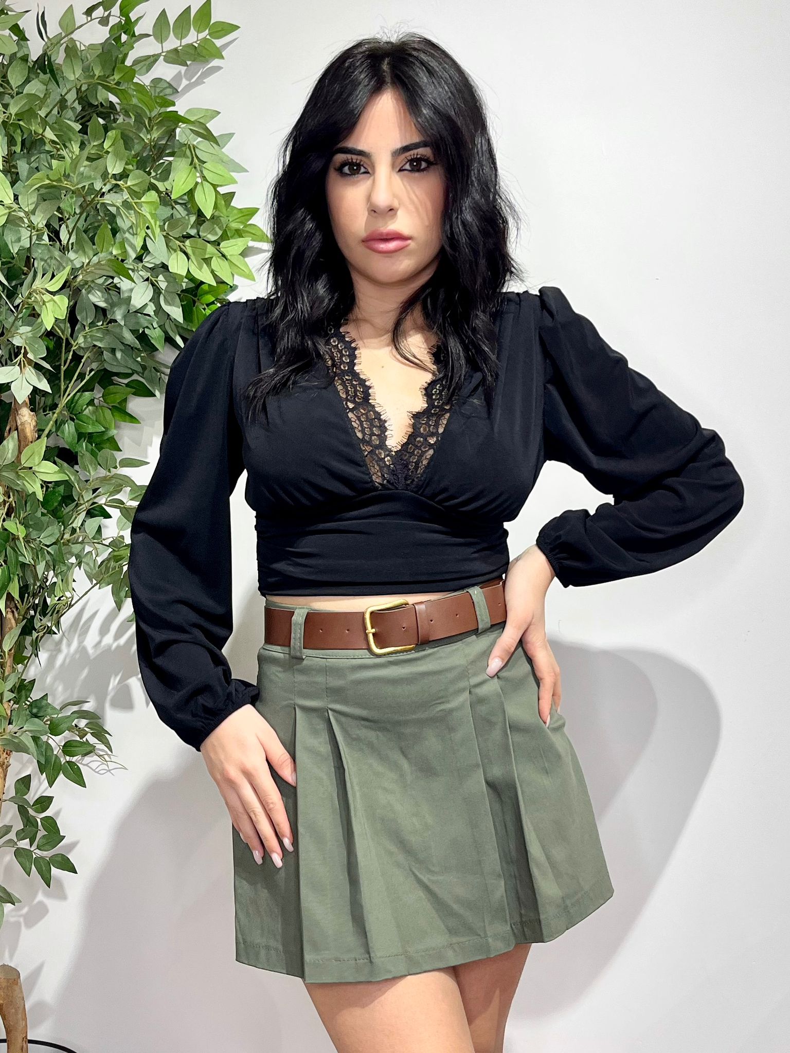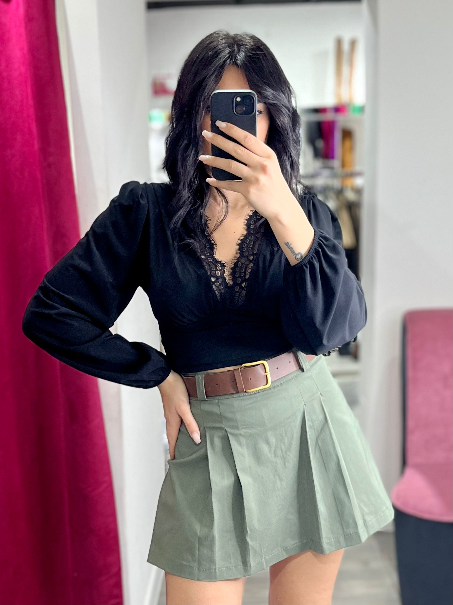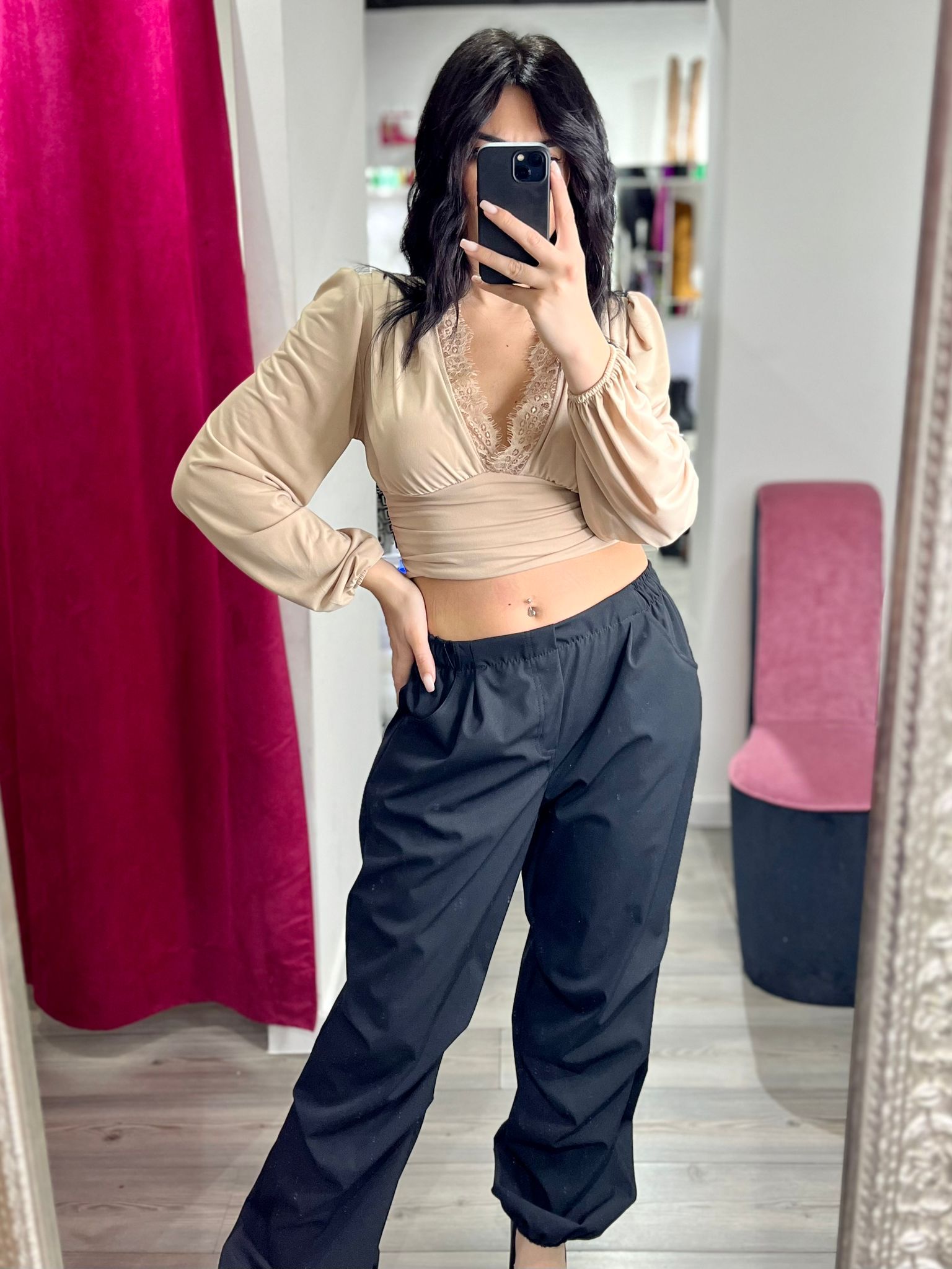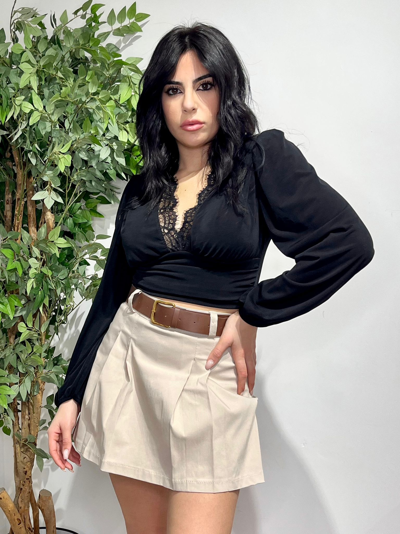 Maglia in tessuto strutturato con ricamo in pizzo, coppe preformate e manica a palloncino. Fabbricato in Italia.