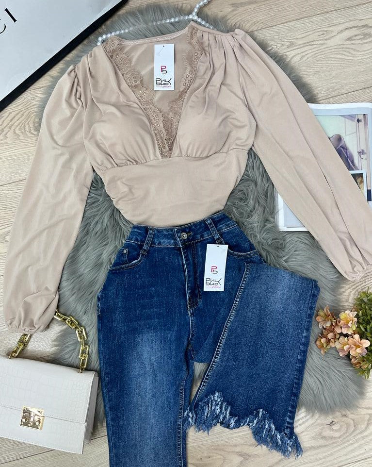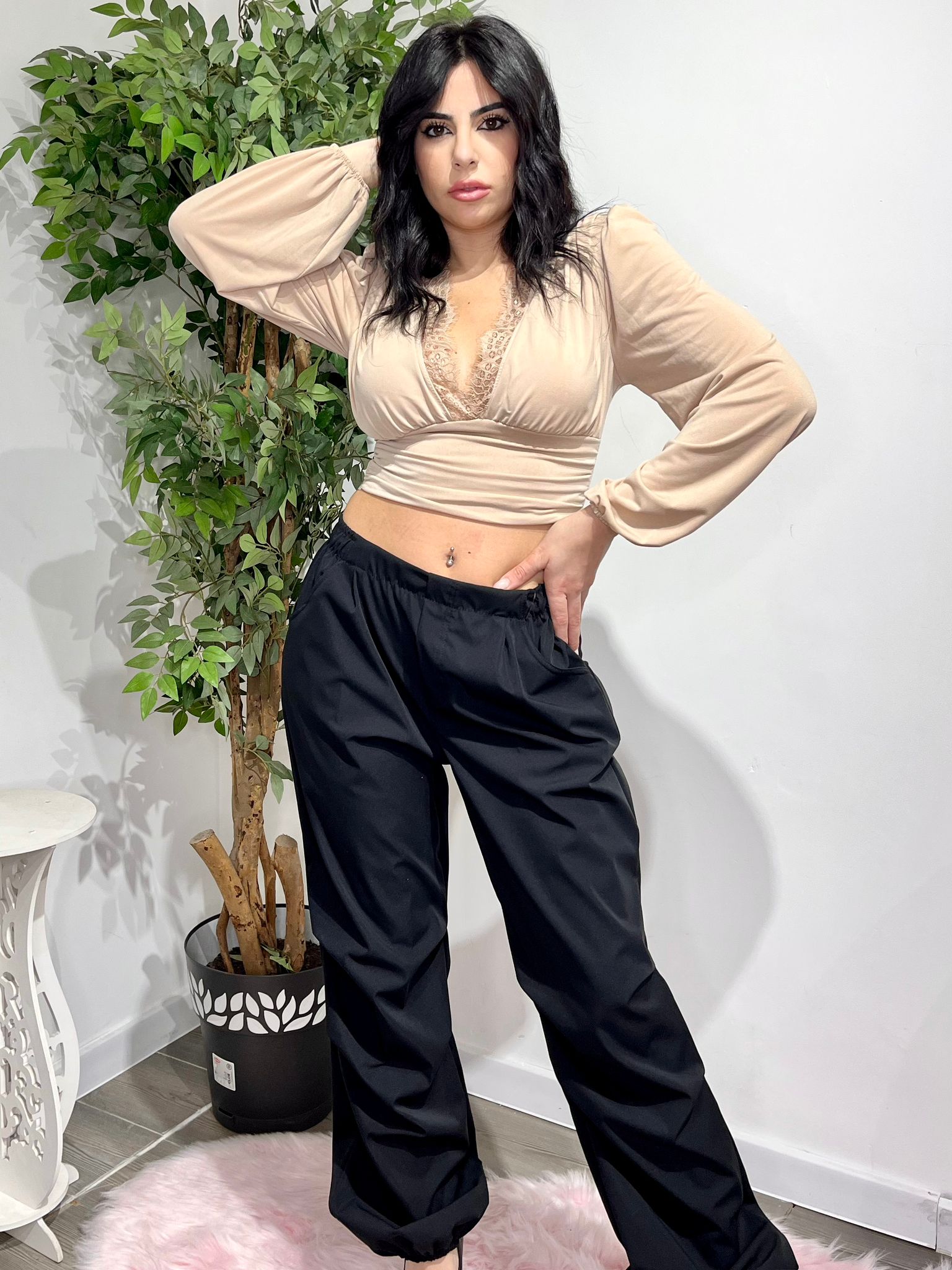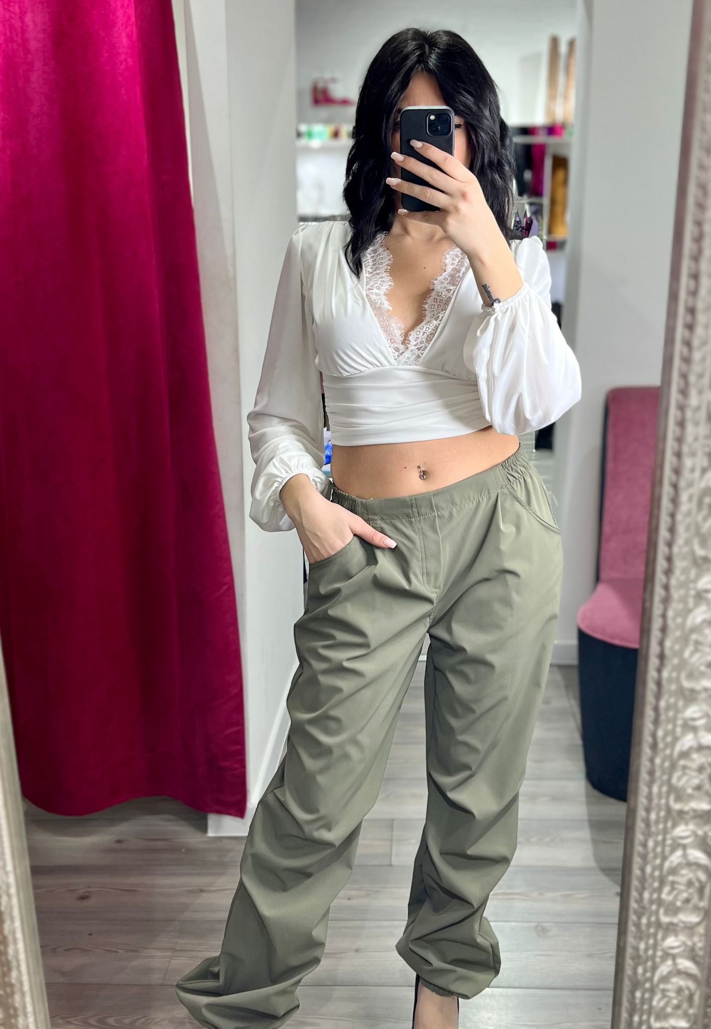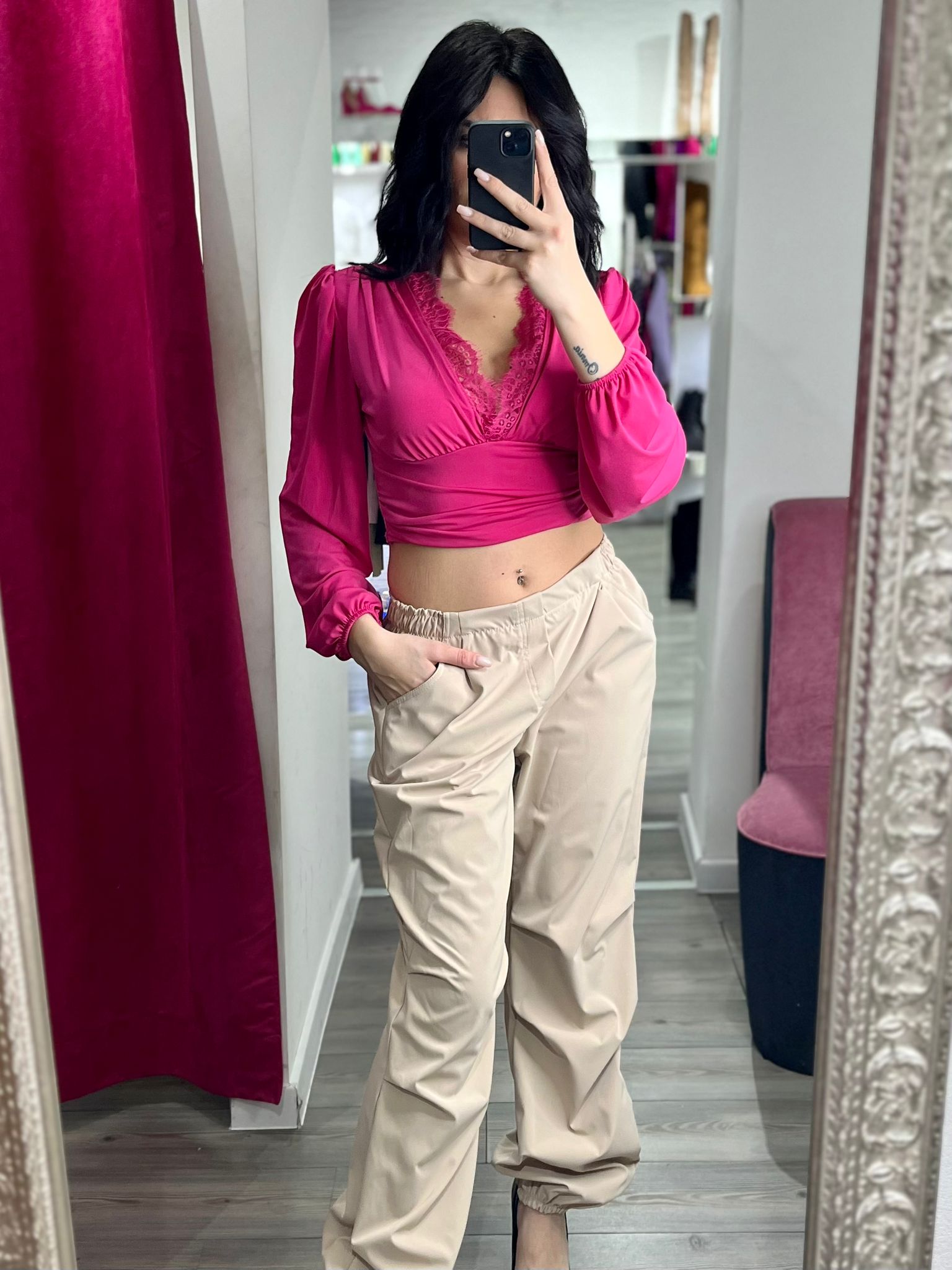 Maglia in tessuto strutturato con ricamo in pizzo, coppe preformate e manica a palloncino. Fabbricato in Italia.