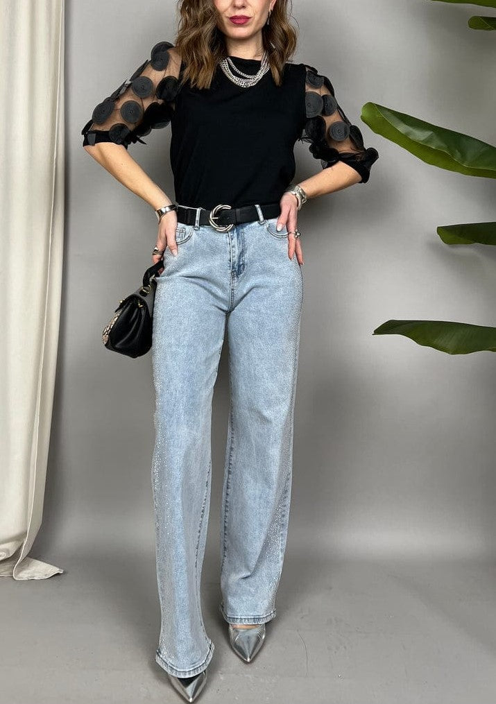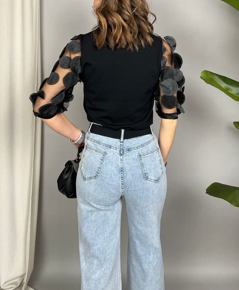 Maglia elasticizzata con maniche corte in tulle e petali in rilievo