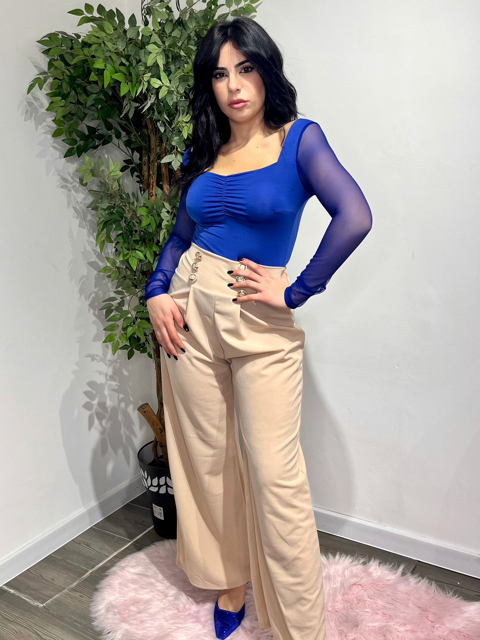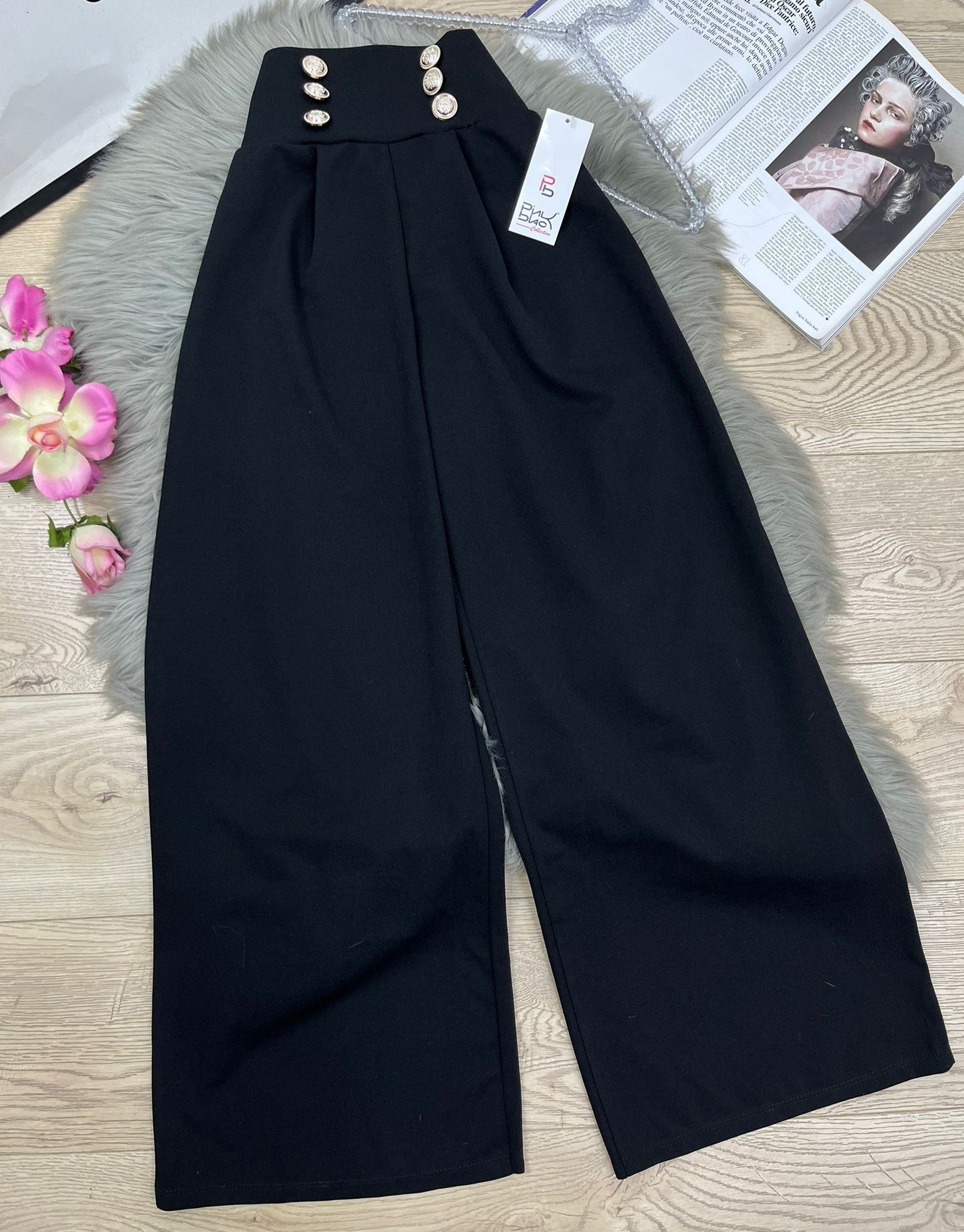 Pantalone palazzo in tessuto scuba crepe con fascia elastica e bottoni. Fabbricato in Italia.
