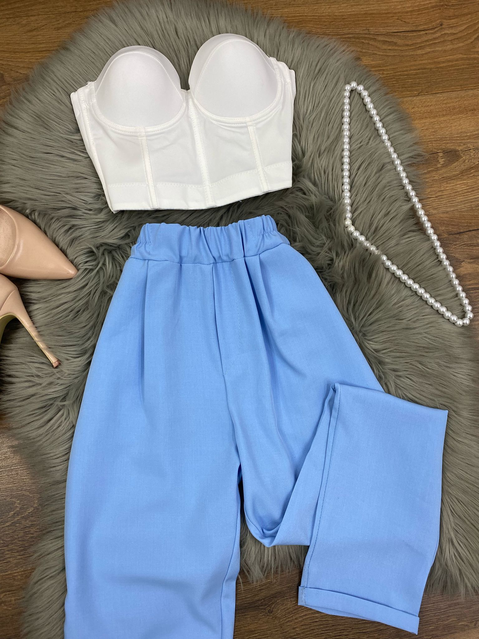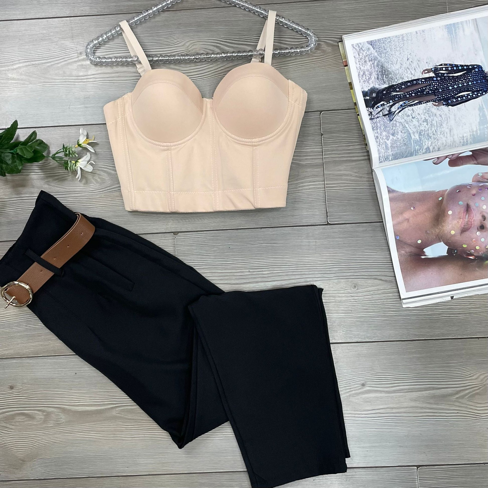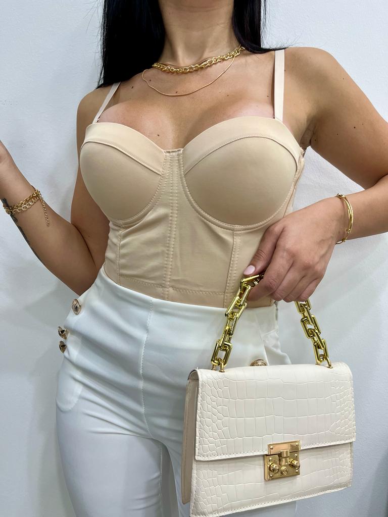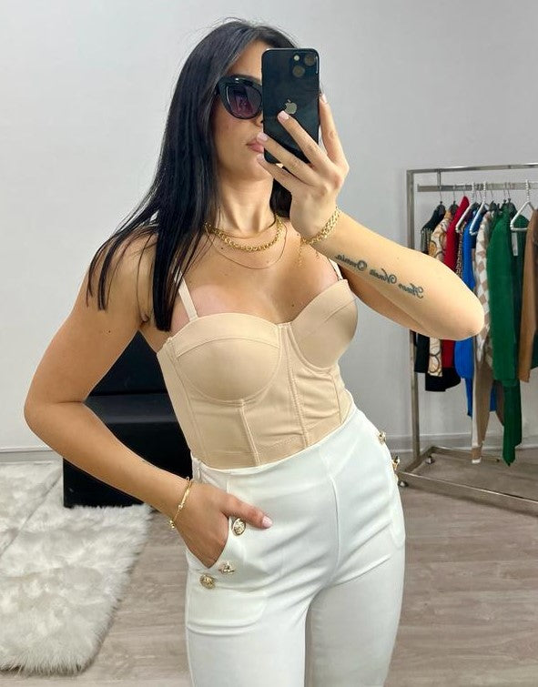 Top a corpetto con coppe preformate, spalline regolabili e chiusura con gancetti sul retro.