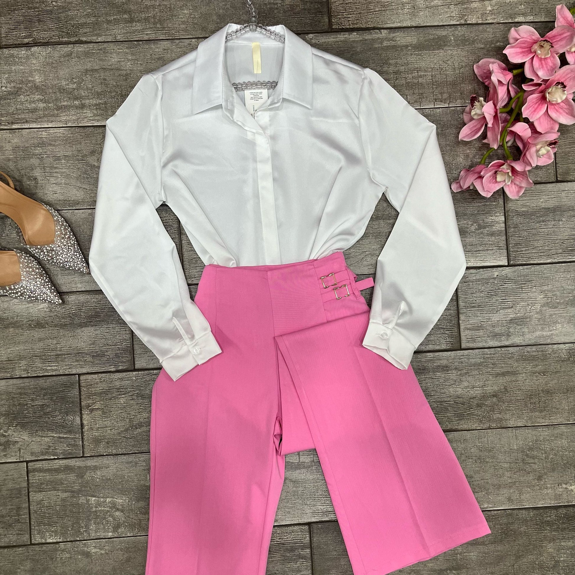 Pantalone modello palazzo a vita alta ,a zampa con fibbie laterali.