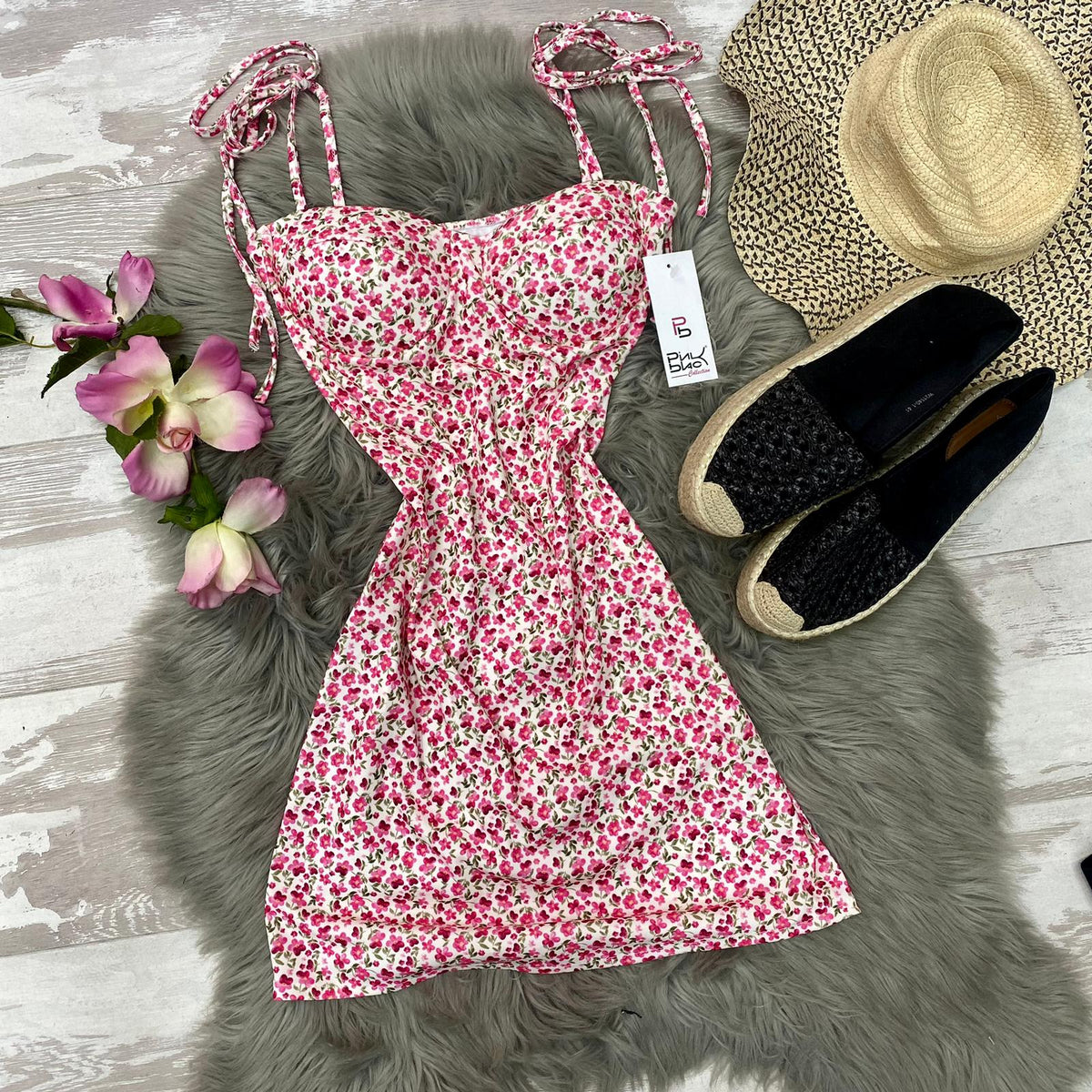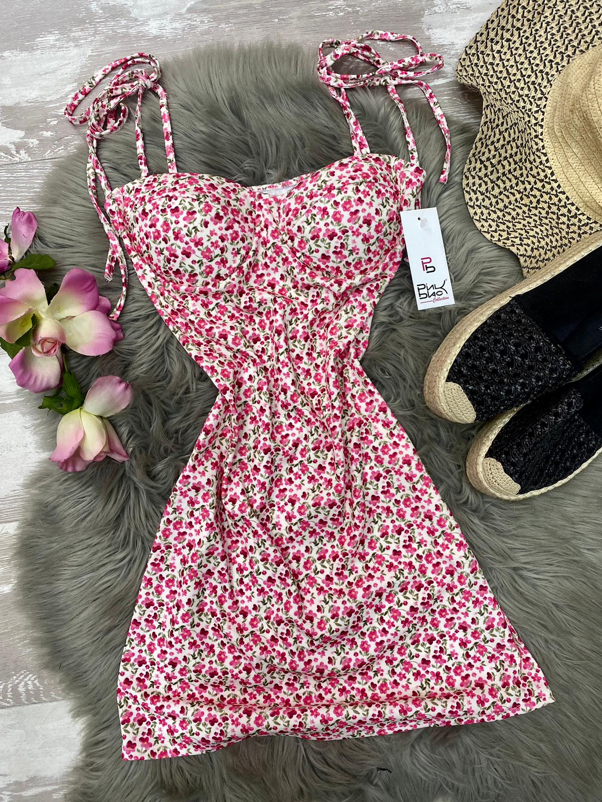 Abito in tessuto strutturato, modello sagomato con fantasia floreale e spalline regolabili Fabbricato in Italia.