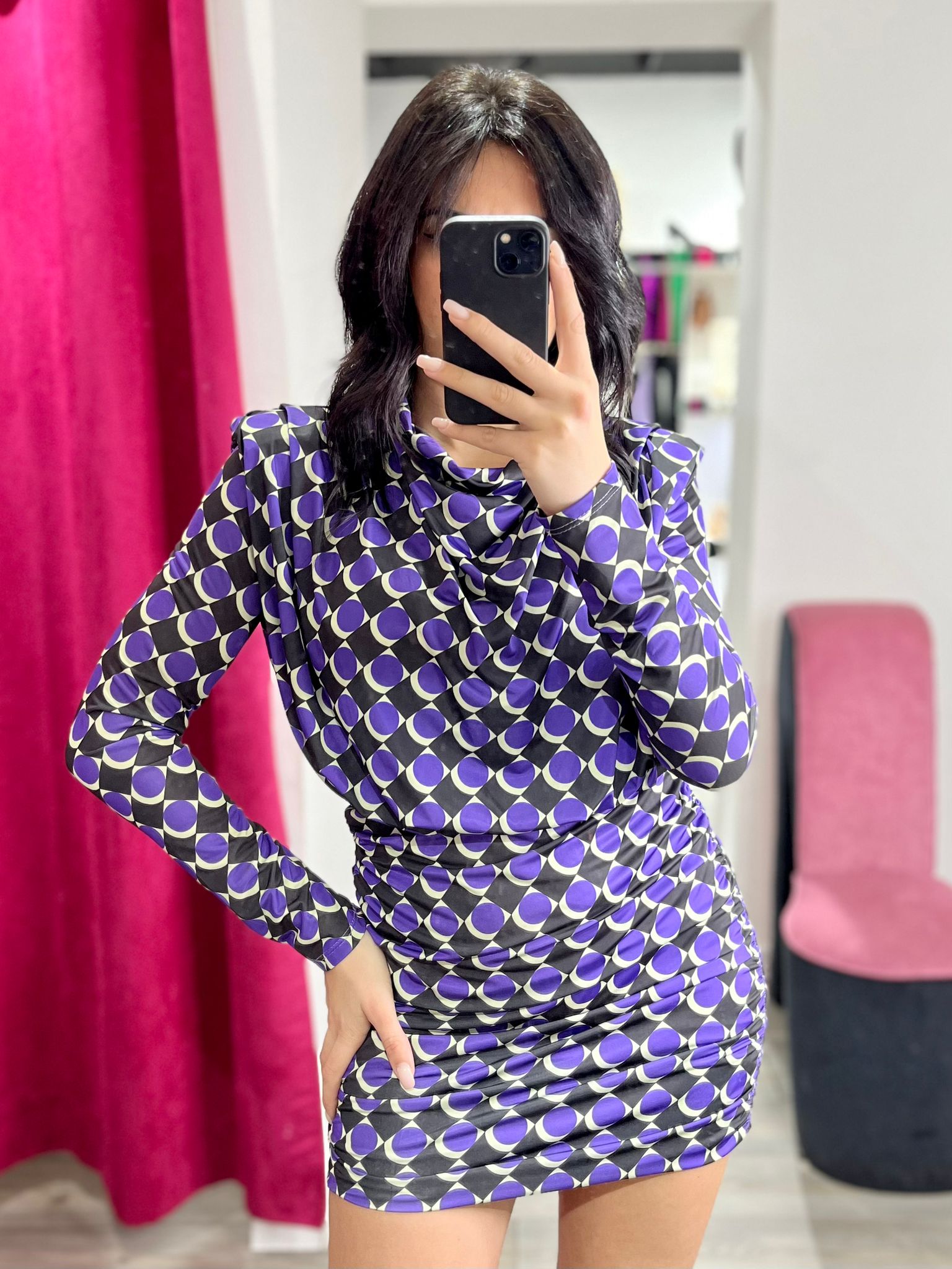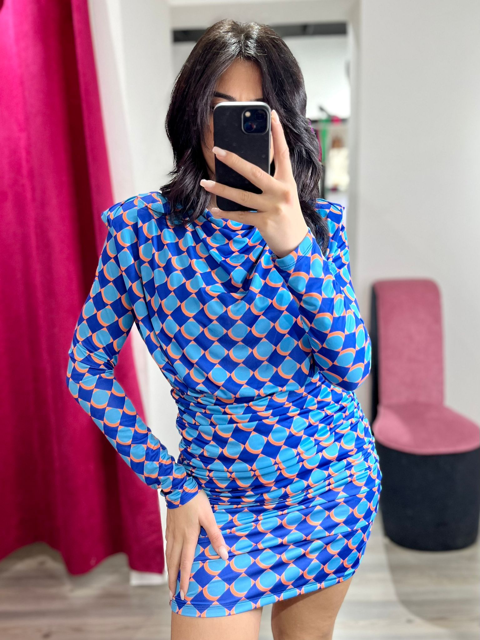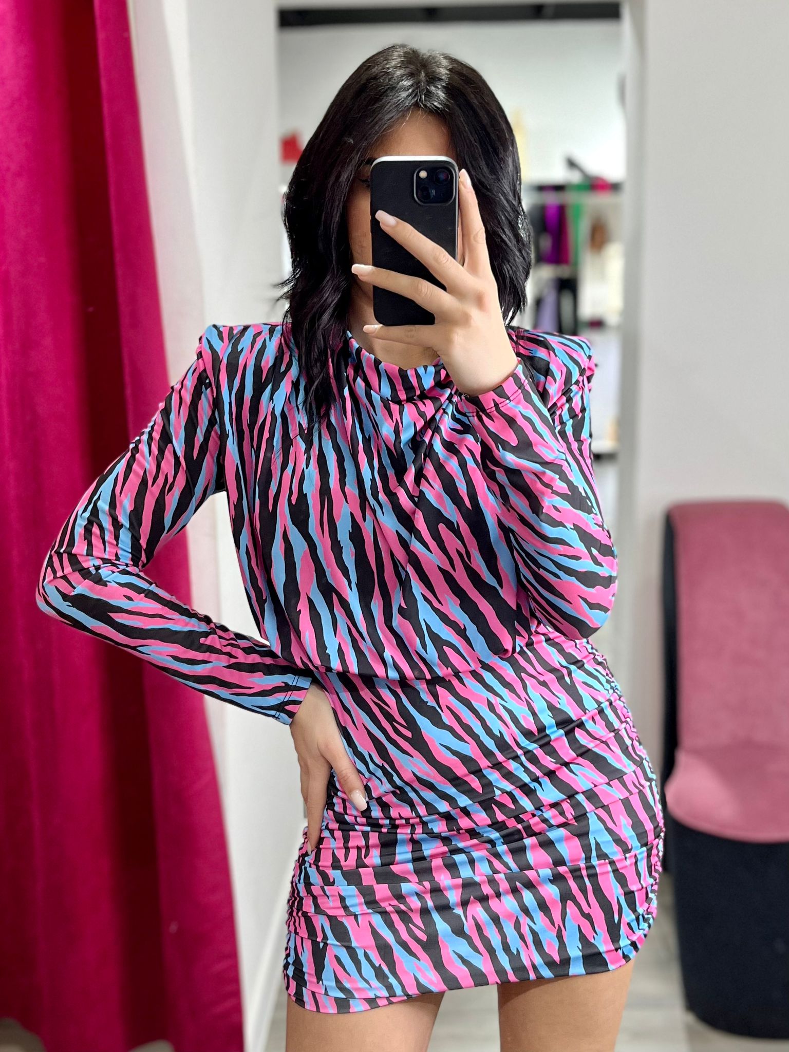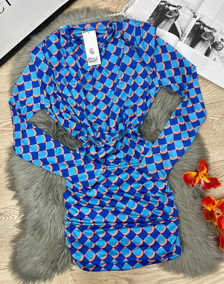 Abito effetto lycra con diverse fantasie. Spalline imbottite, elastico in vita e gonna con drappeggio laterale. Fabbricato in Italia.
