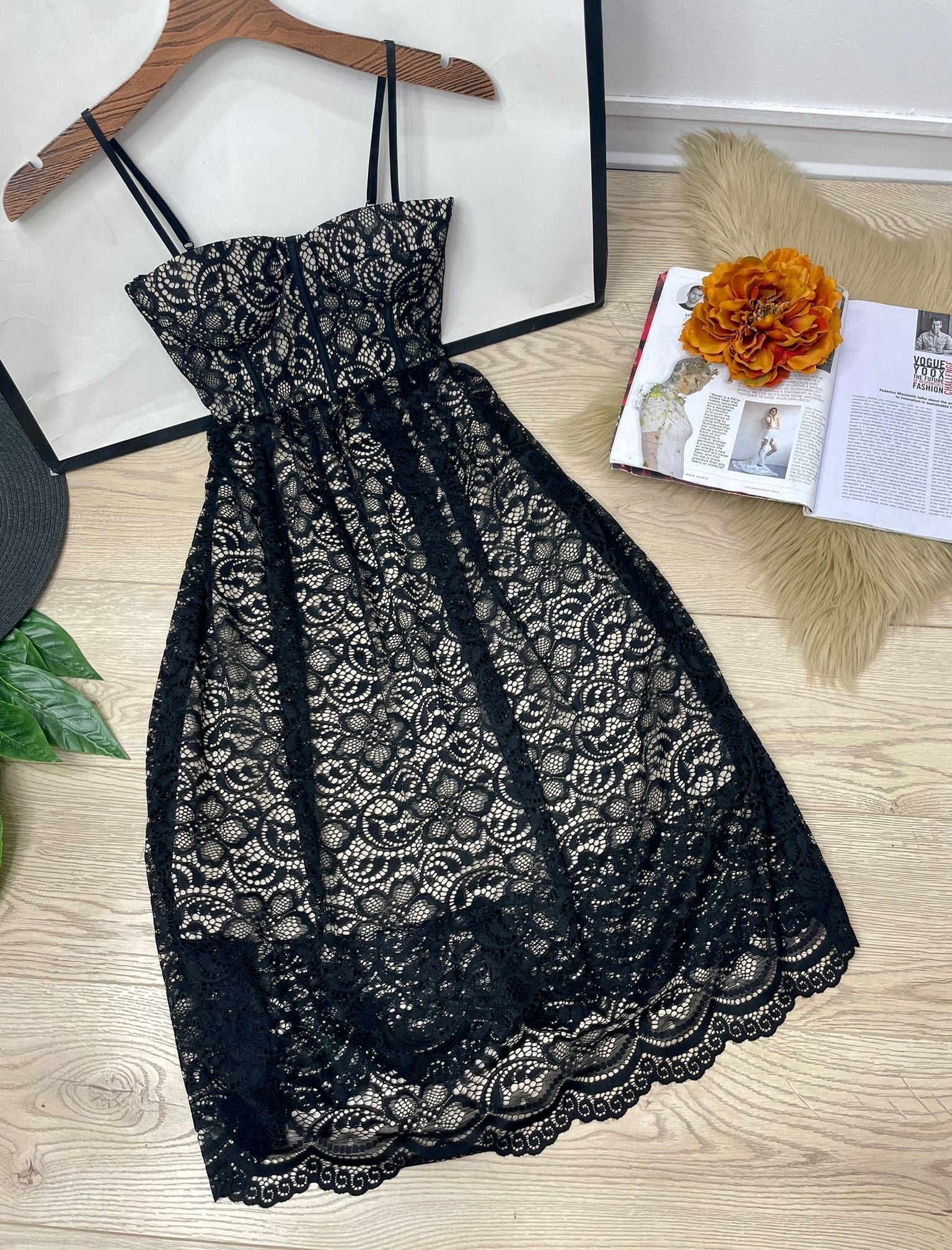 Long dress worked on elasticated knit with lace embroidery, preformed cups, adjustable shoulder straps and rear zip closure. Made in Italy.