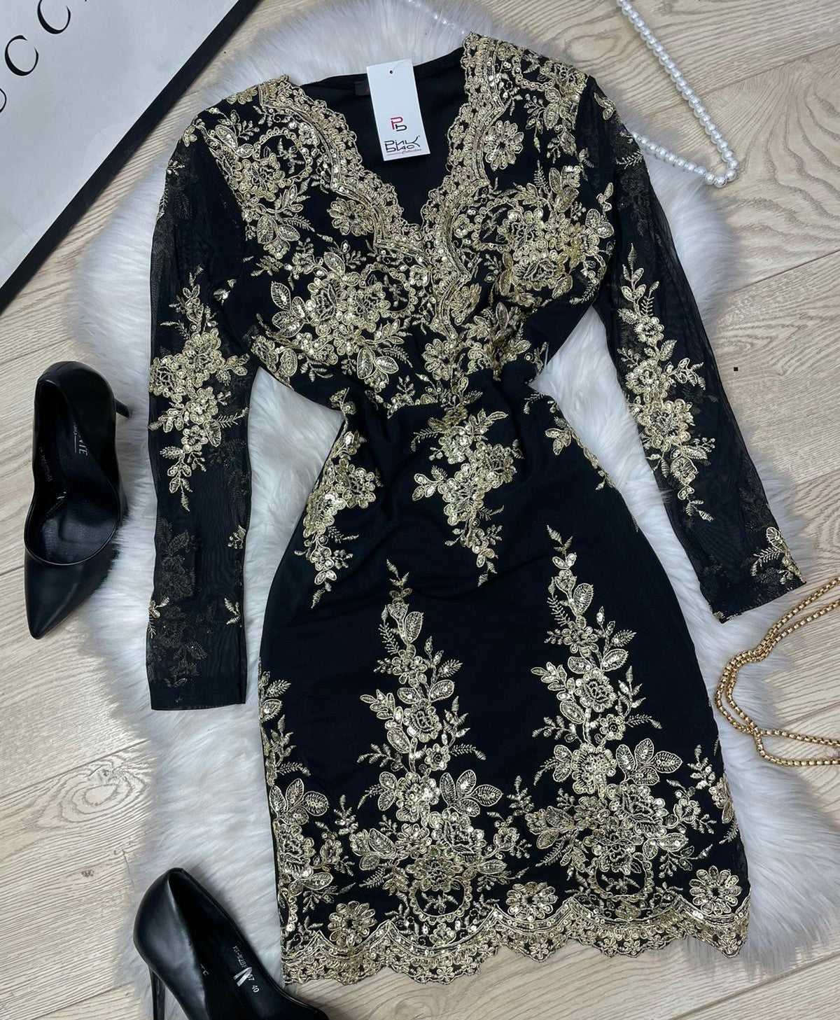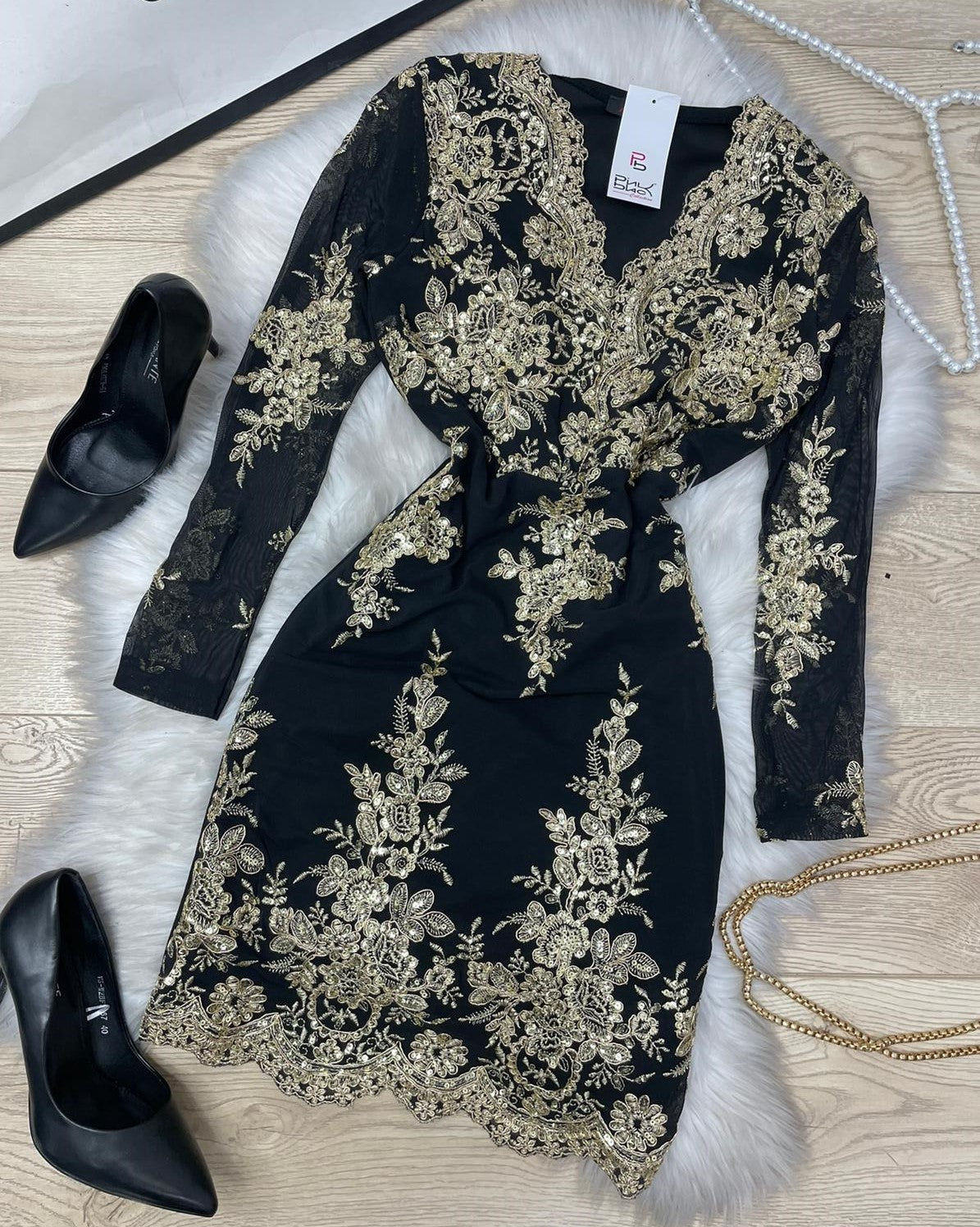 Abito in tessuto scuba crepe con velo di tulle, ricami floreali in rilievo e maniche velate. Fabbricato in Italia.