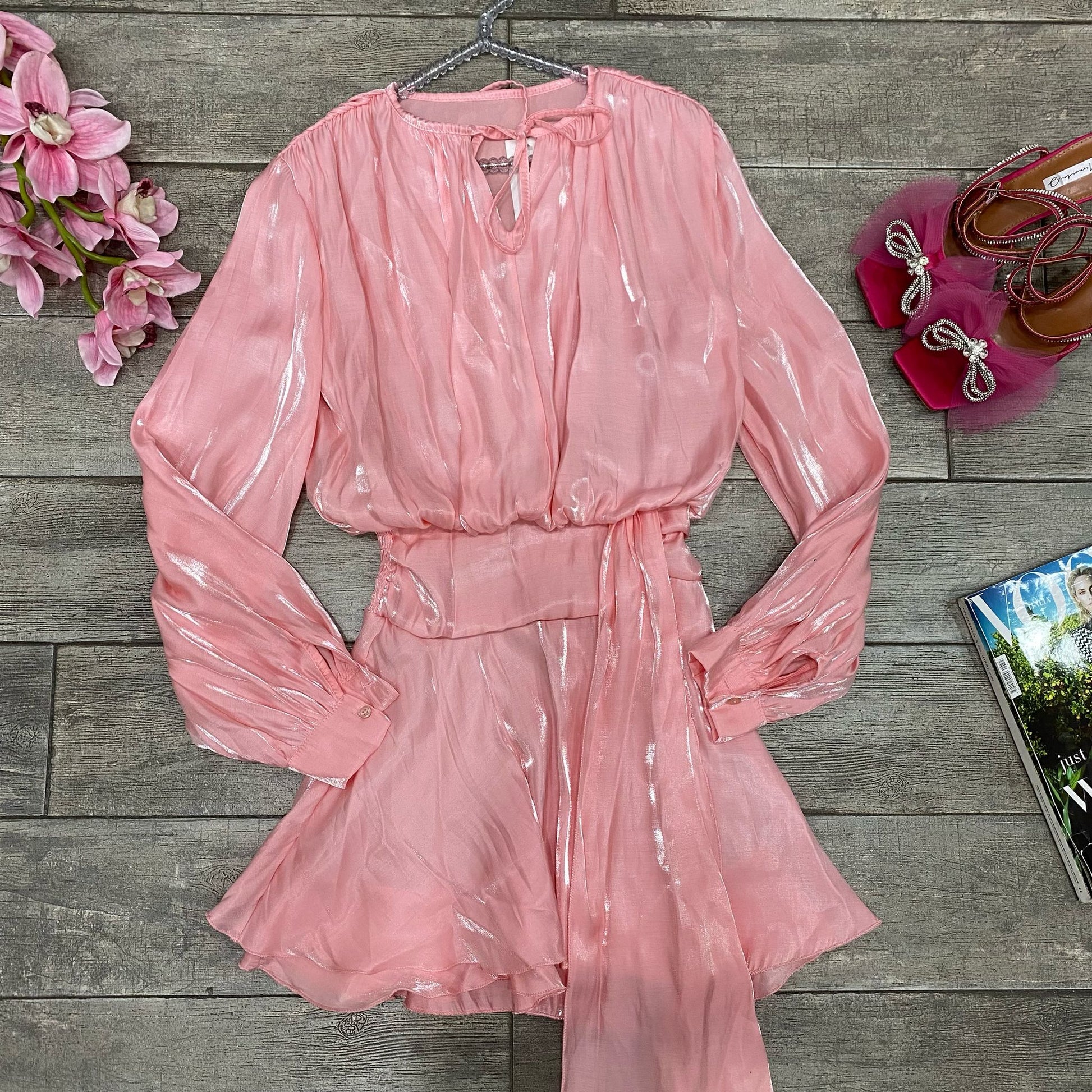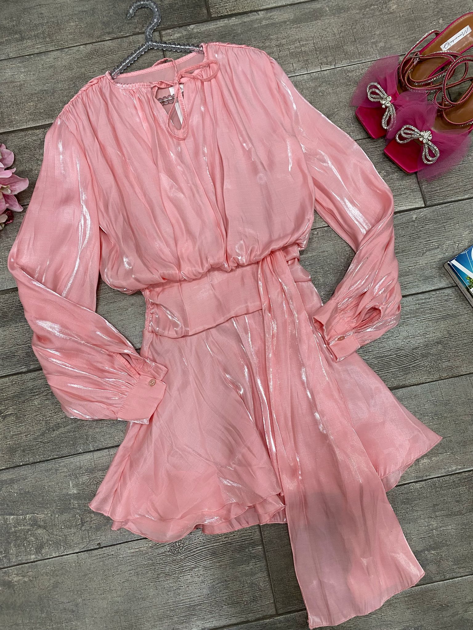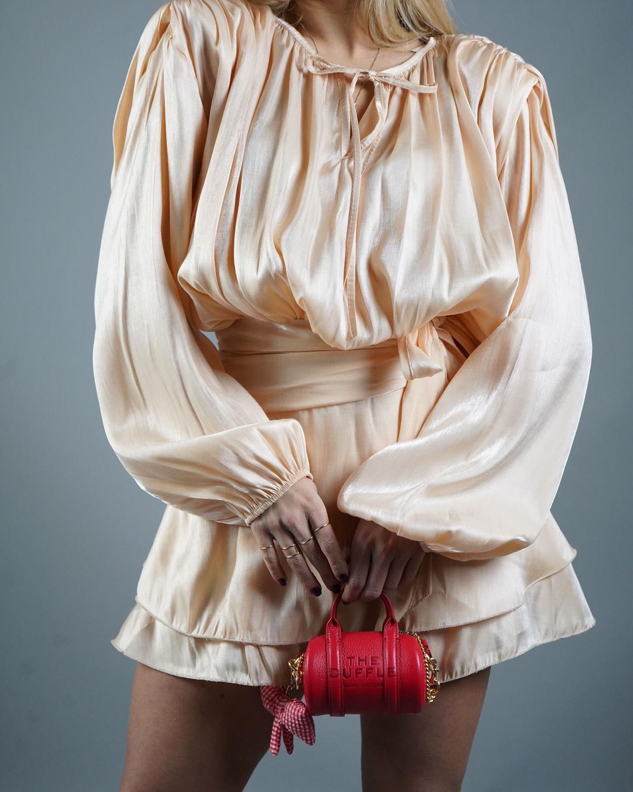 Abito effetto raso sgualcito con gonna morbida a balze, unica tinta