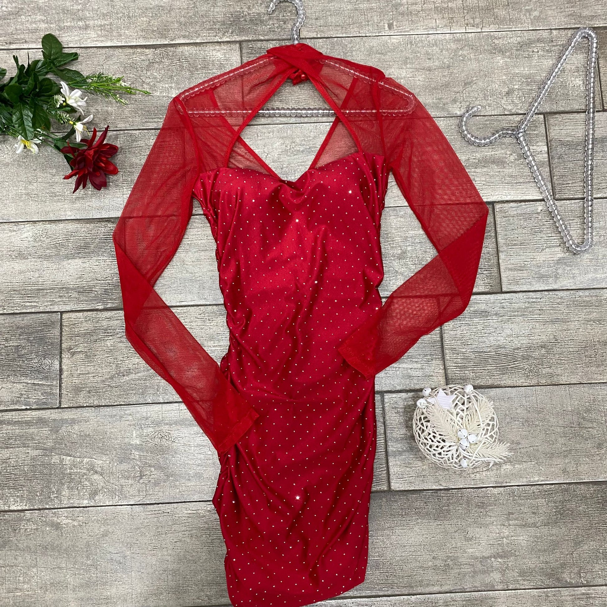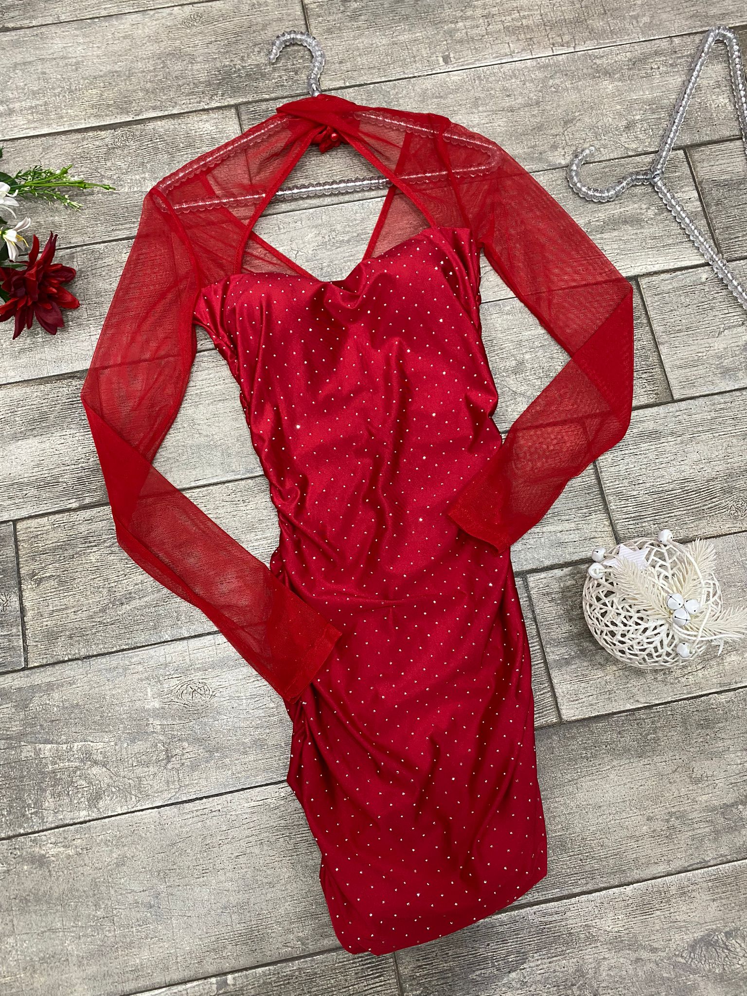 Abito in raso con brillantini argentati e maniche in tulle con incrocio sul retro , coppe preformate interne.