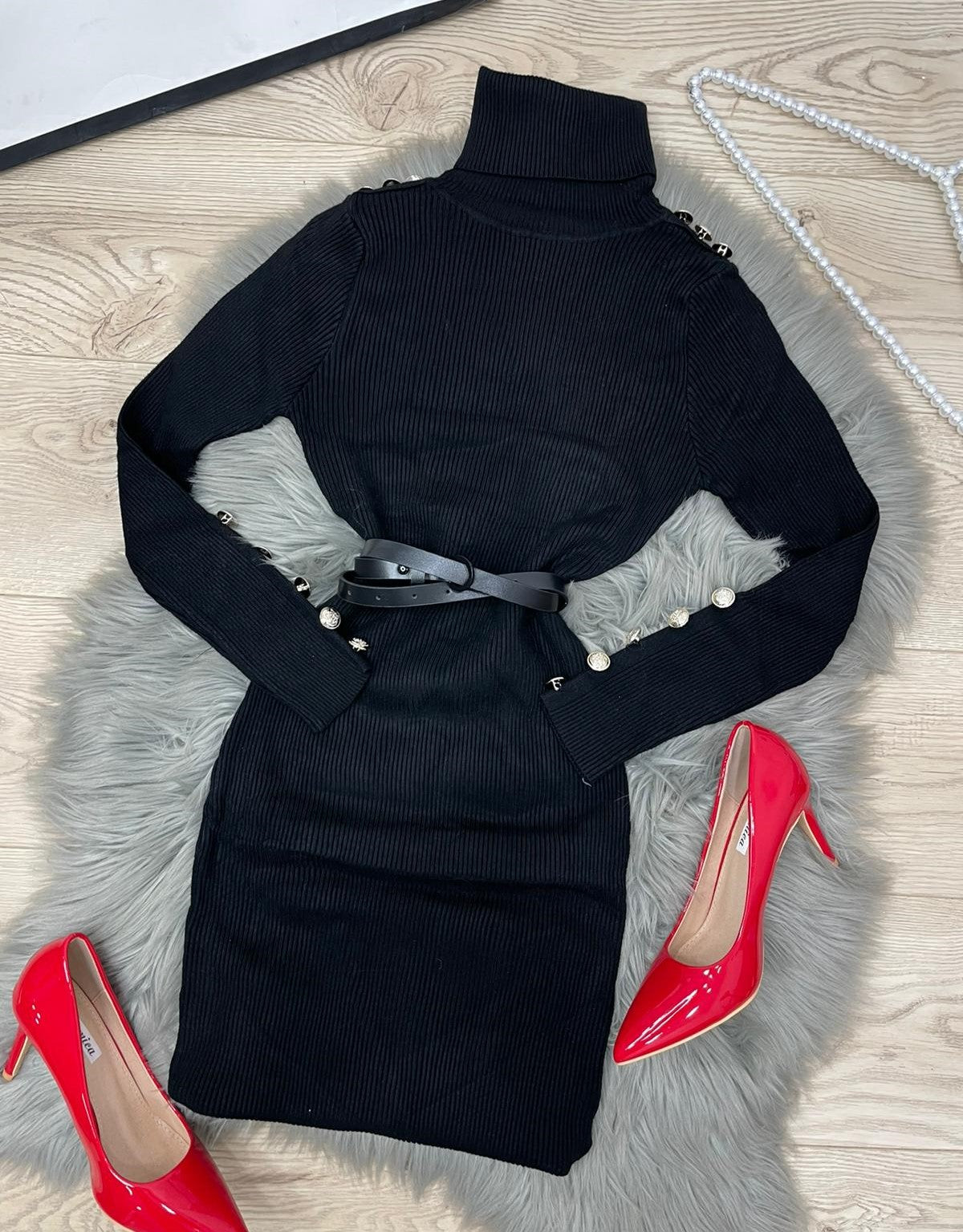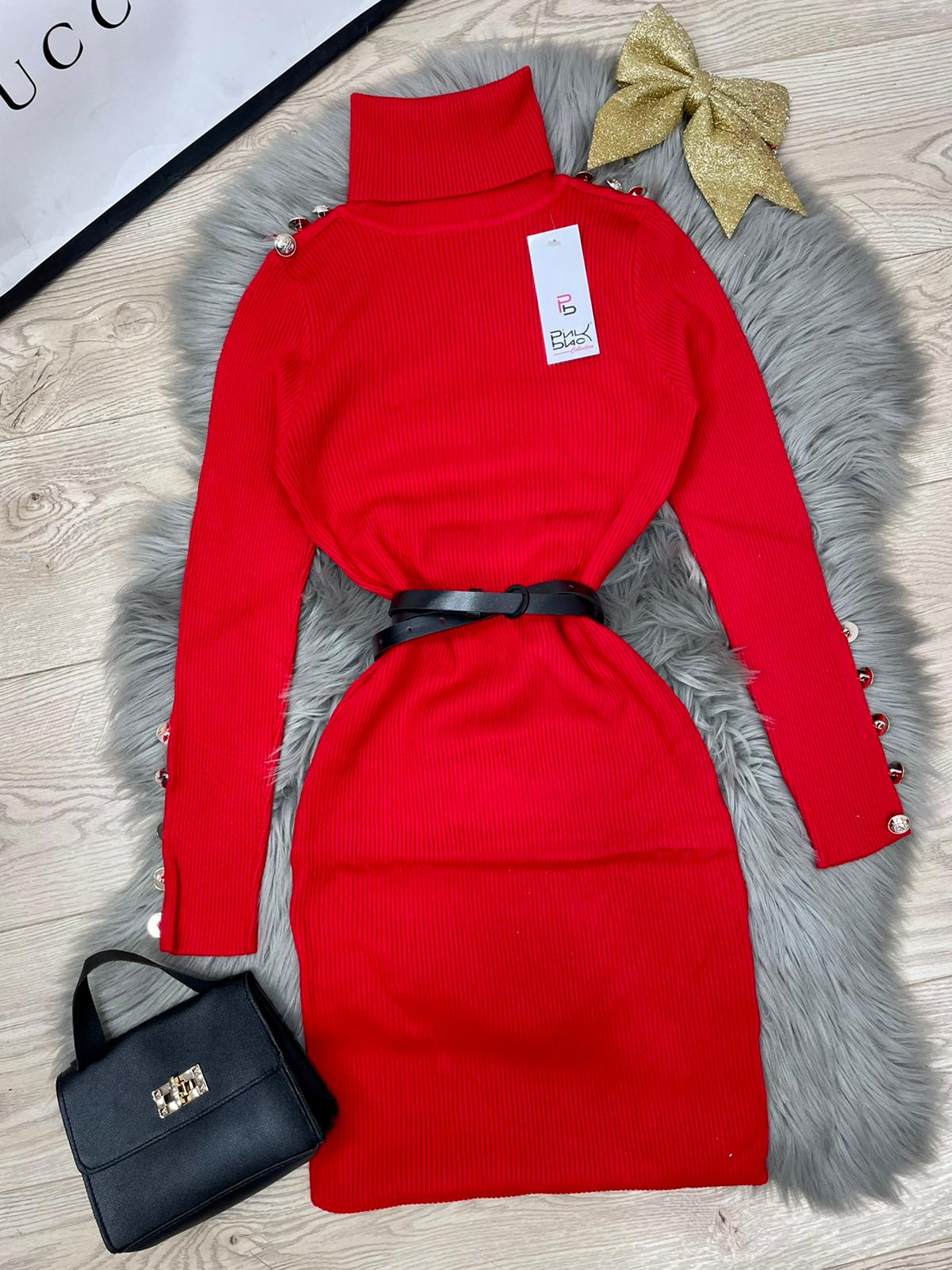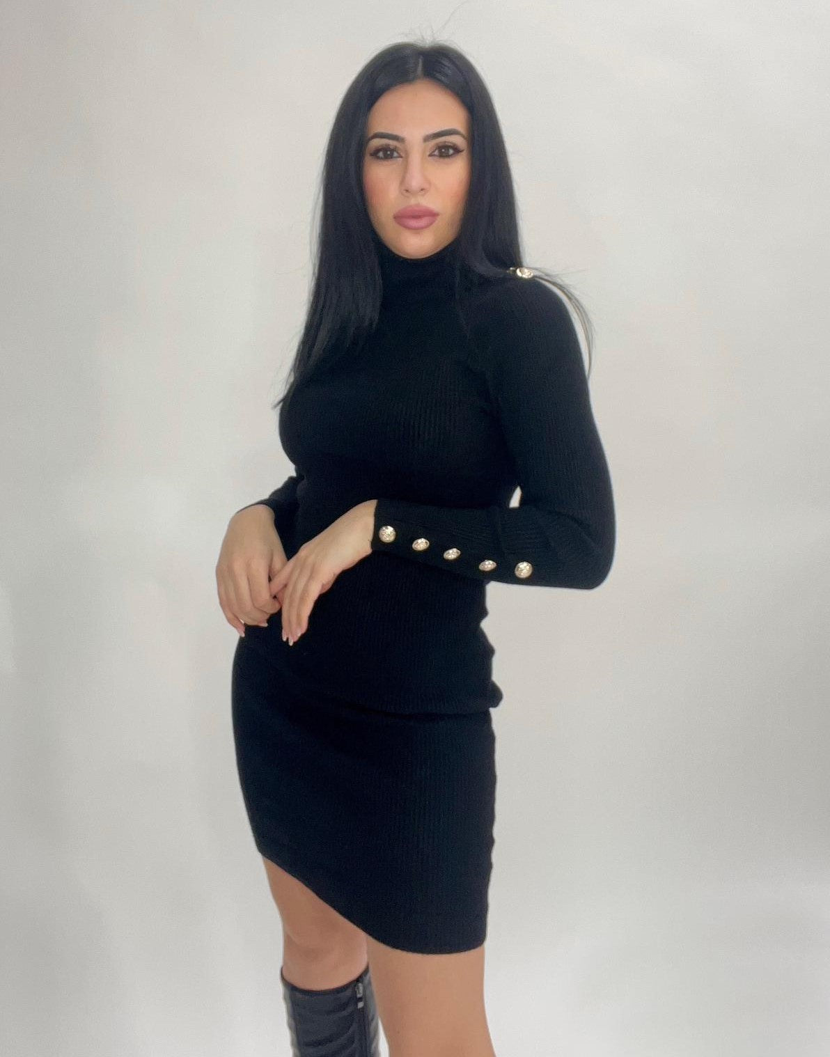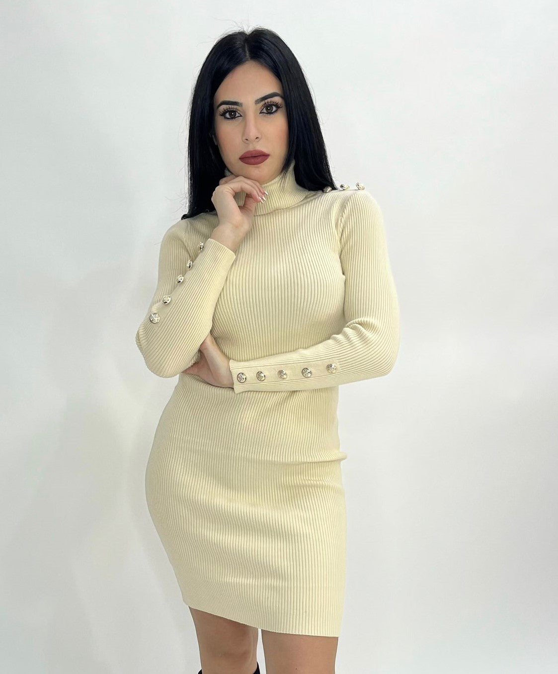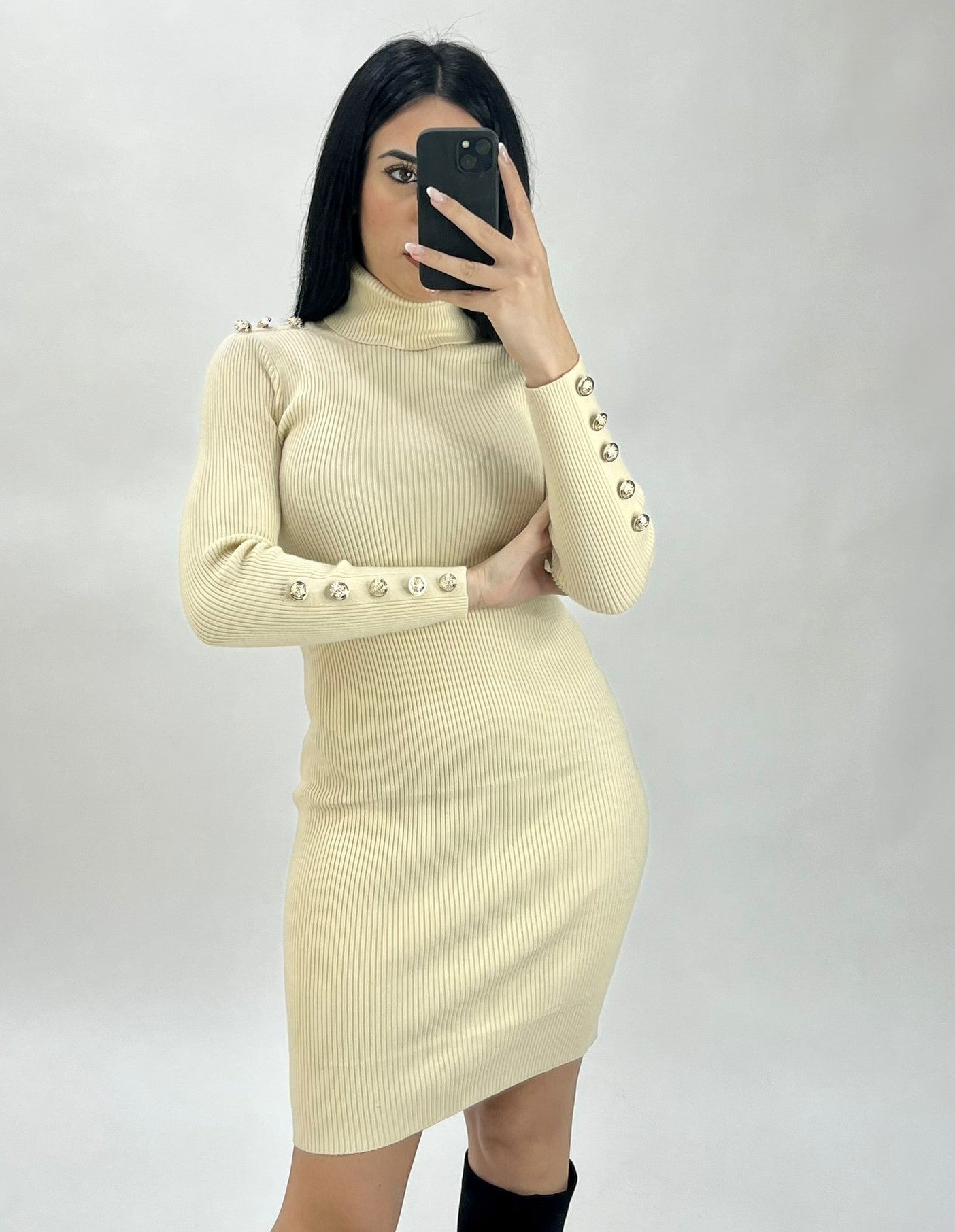 Abito a costine con applicazione di bottoni e collo alto. Fabbricato all'estero.