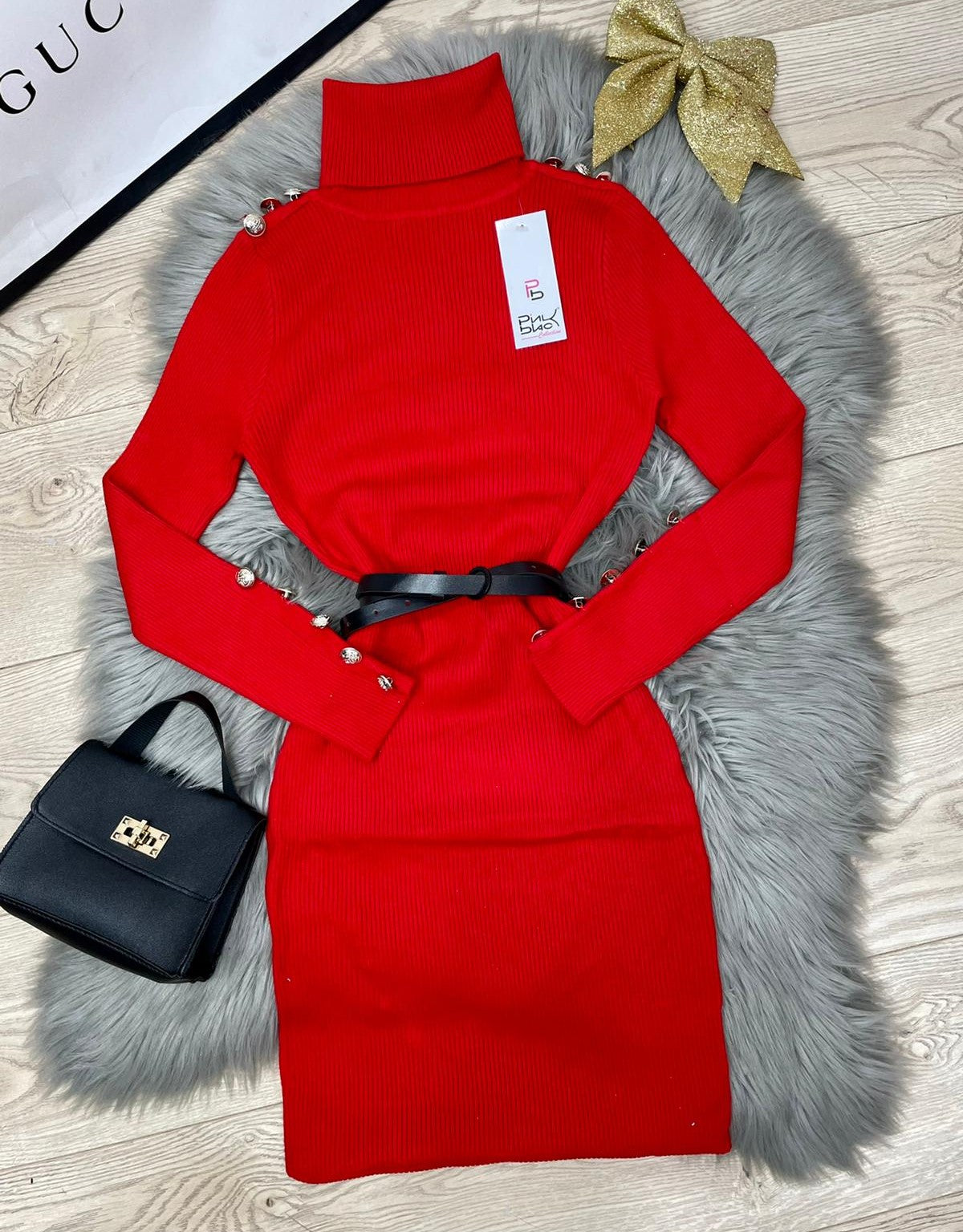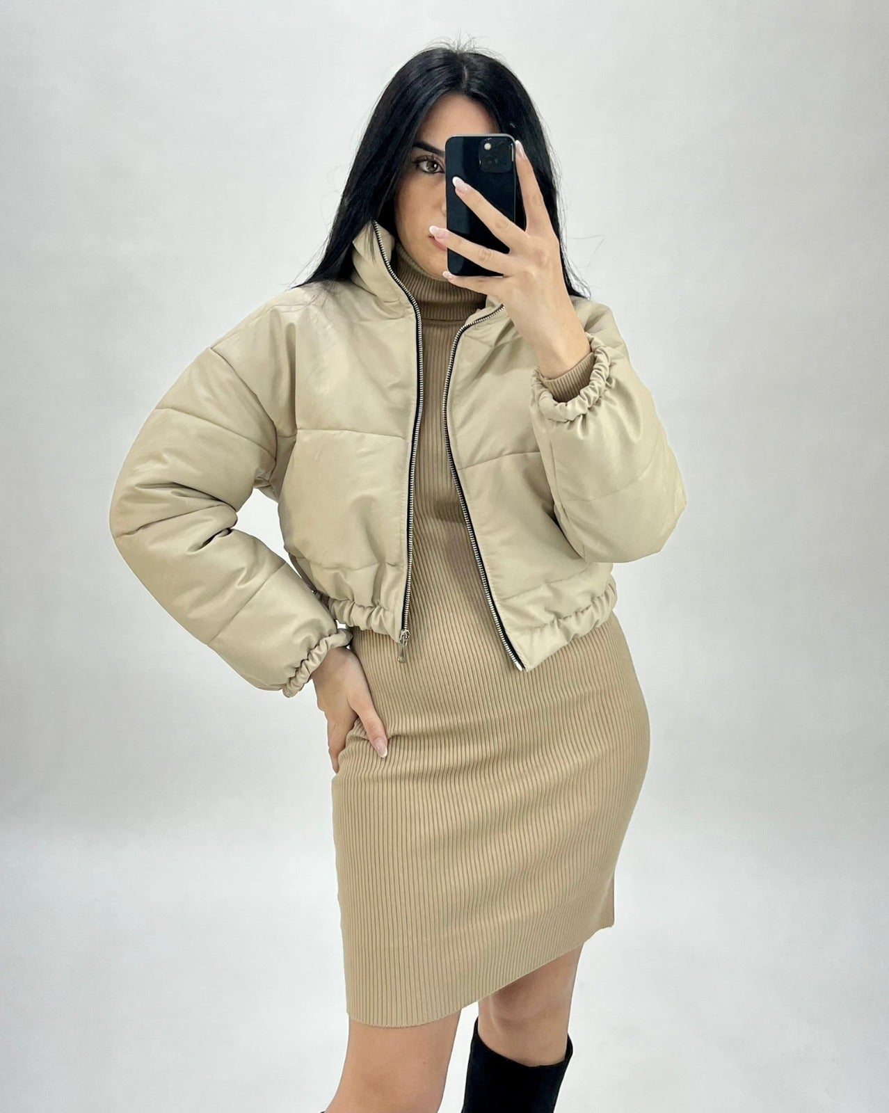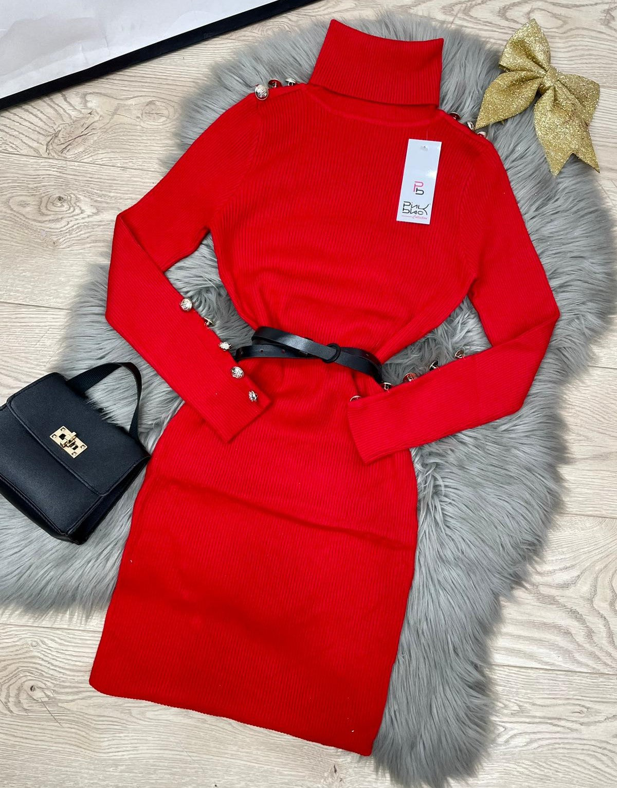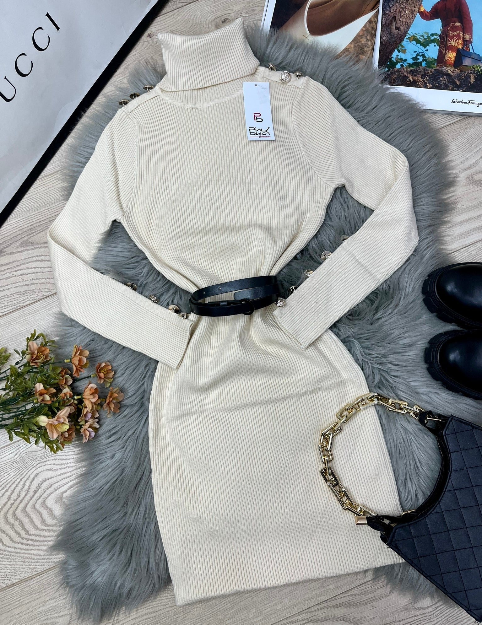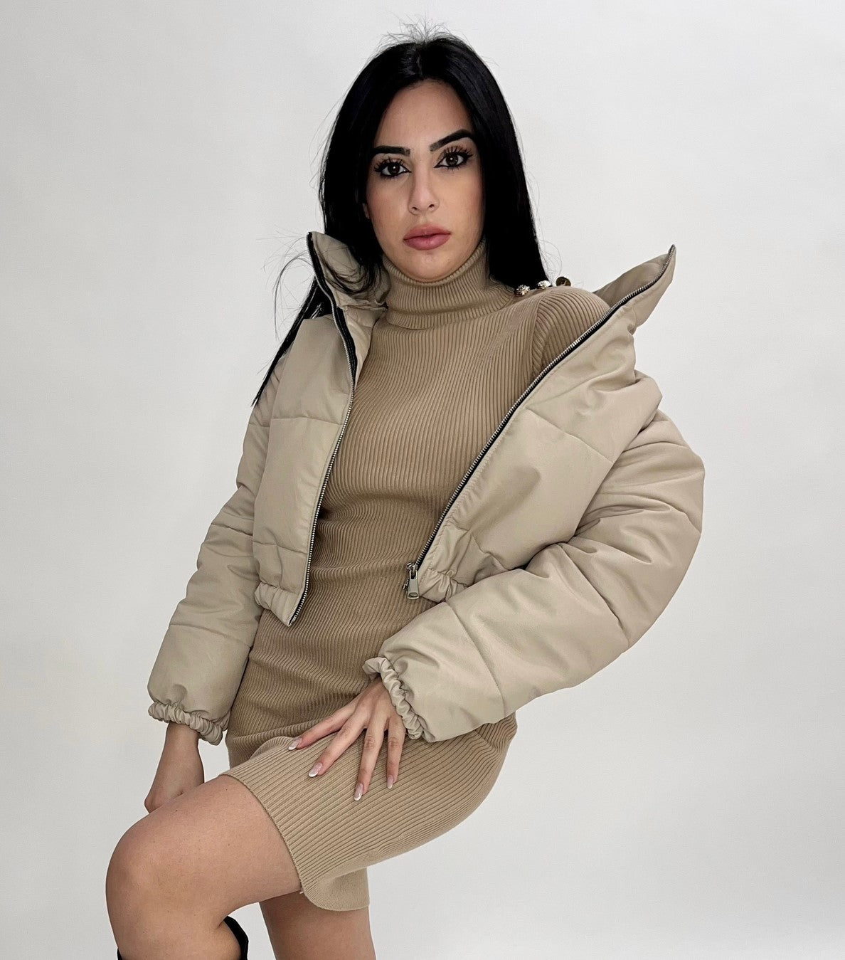Abito a costine con applicazione di bottoni e collo alto. Fabbricato all'estero.