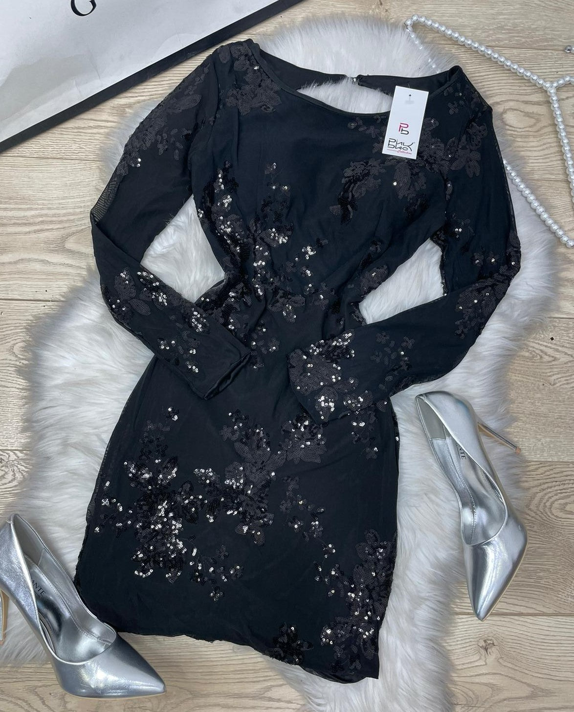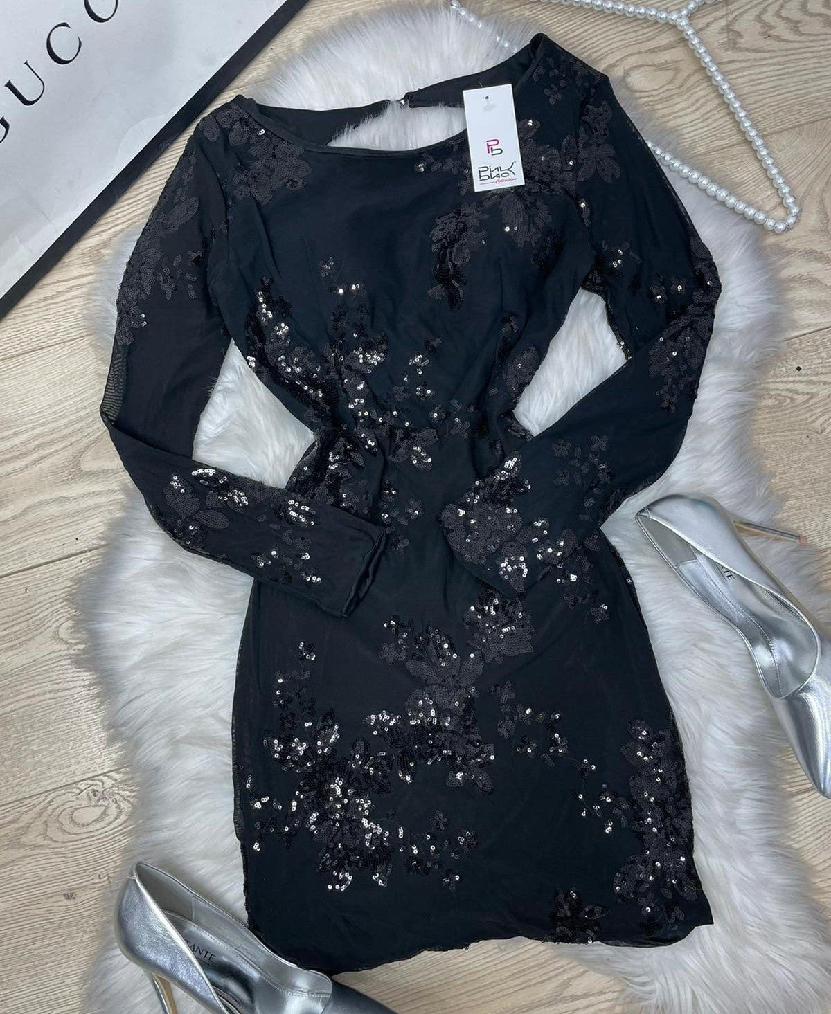 Abito in tessuto scuba crepe con velo di tulle, ricami floreali di paillettes, scollatura sulla schiena e cerniera. Fabbricato in Italia.