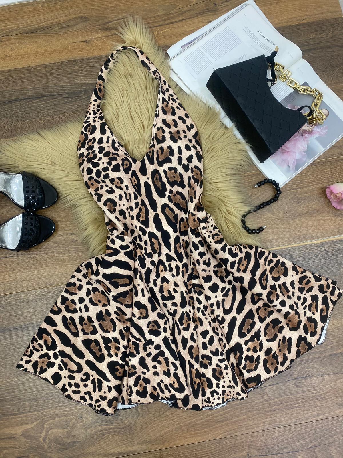 Abito in tessuto strutturato con fantasia animalier , coppe preformate ,allacciatura al collo con bottoncini ed elastico sul retro . Fabbricato in Italia.