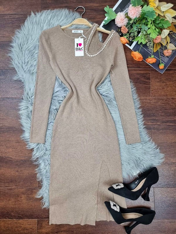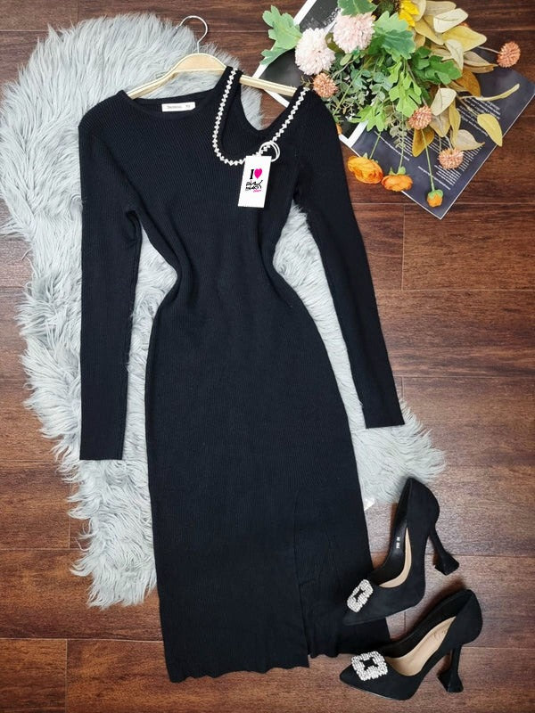 Abito longuette in viscosa a costine con strass e spacco. Fabbricato all'estero.