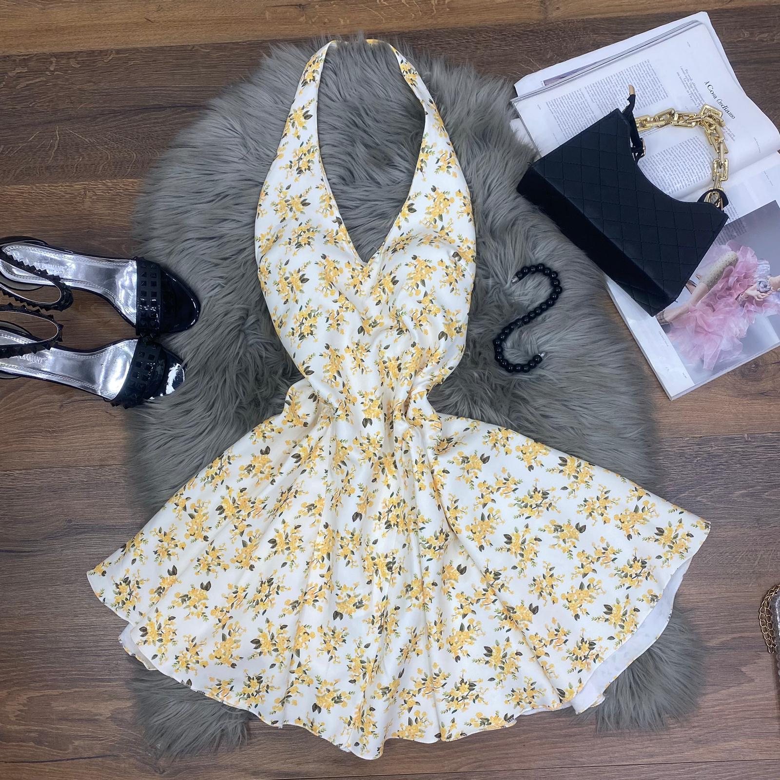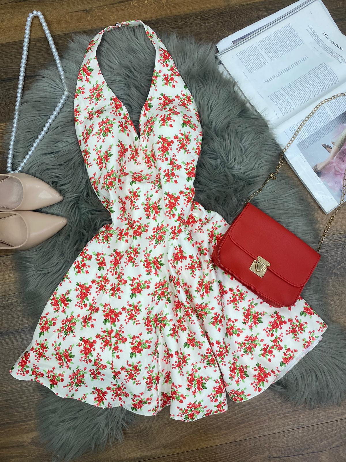 Abito in tessuto strutturato con fantasia floreale, coppe preformate ,allacciatura al collo con bottoncini ed elastico sul retro . Fabbricato in Italia.