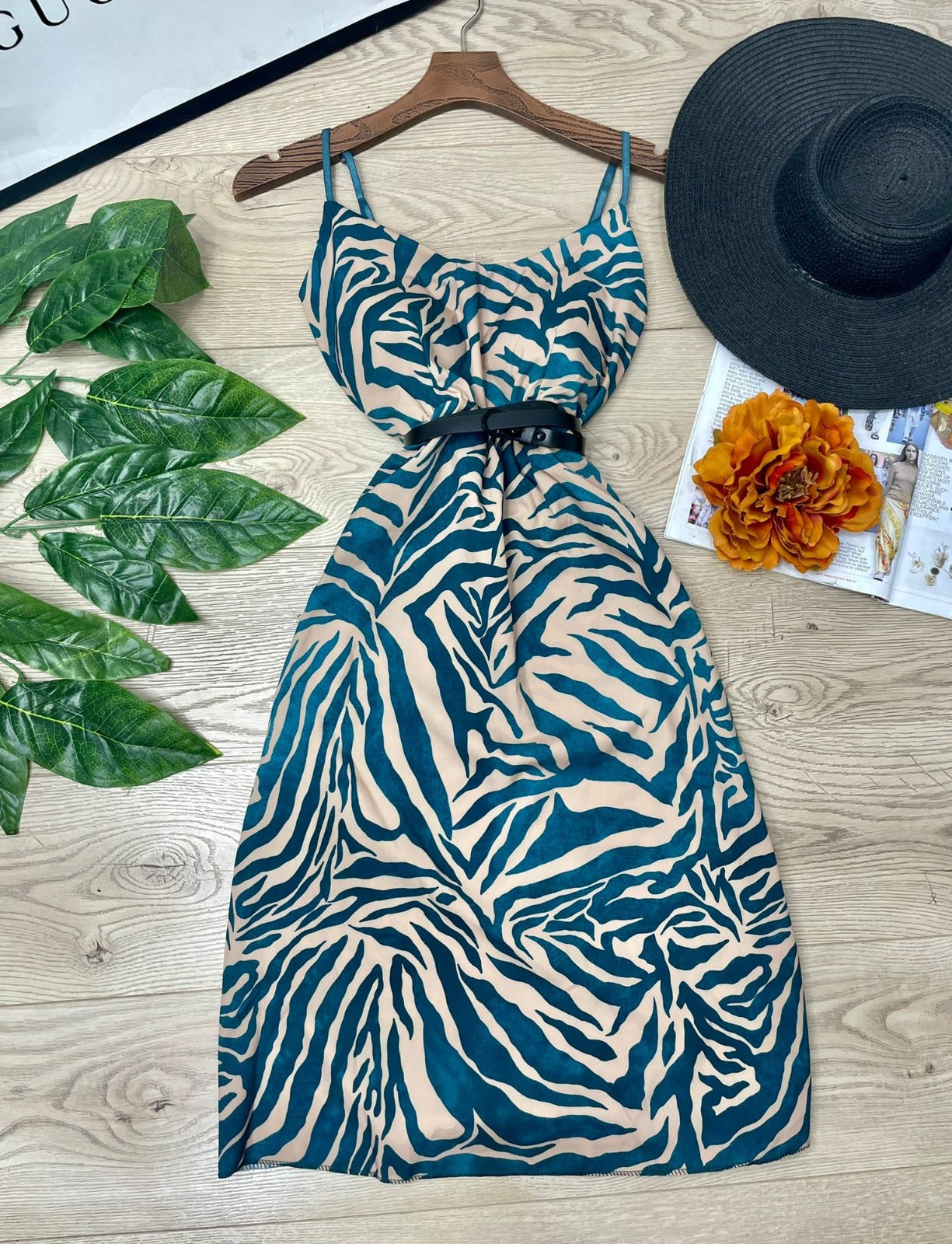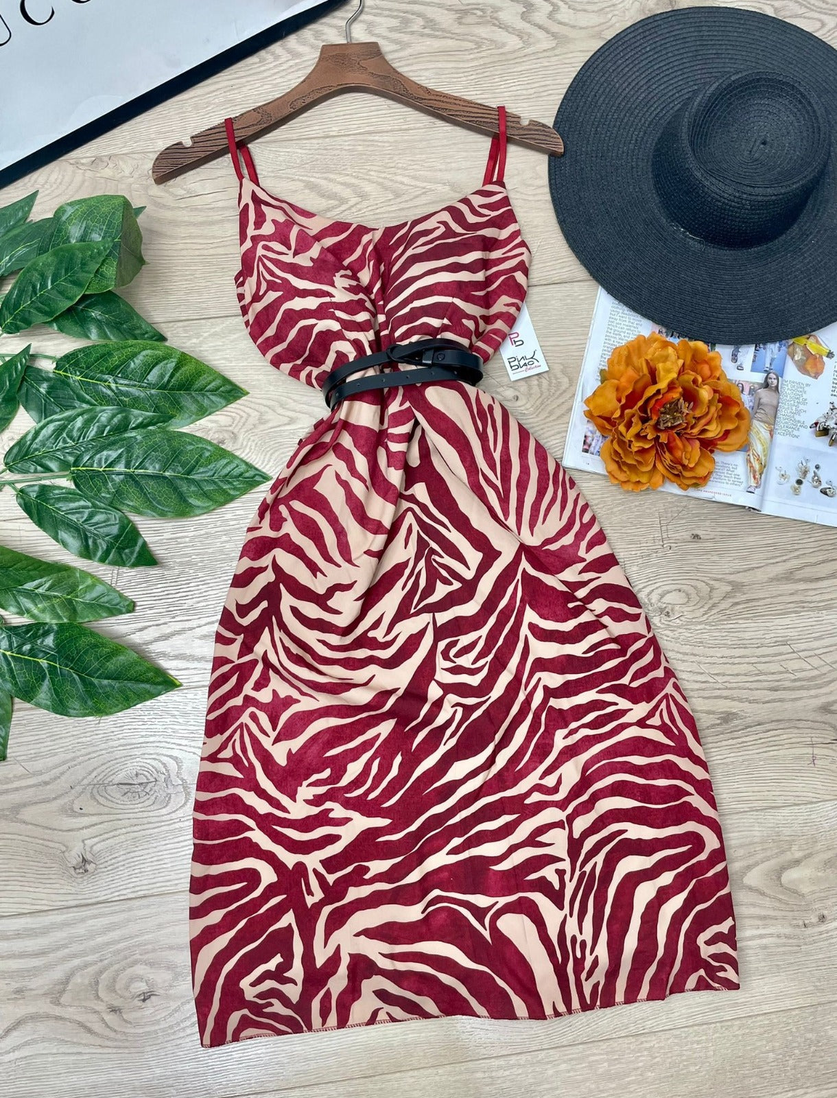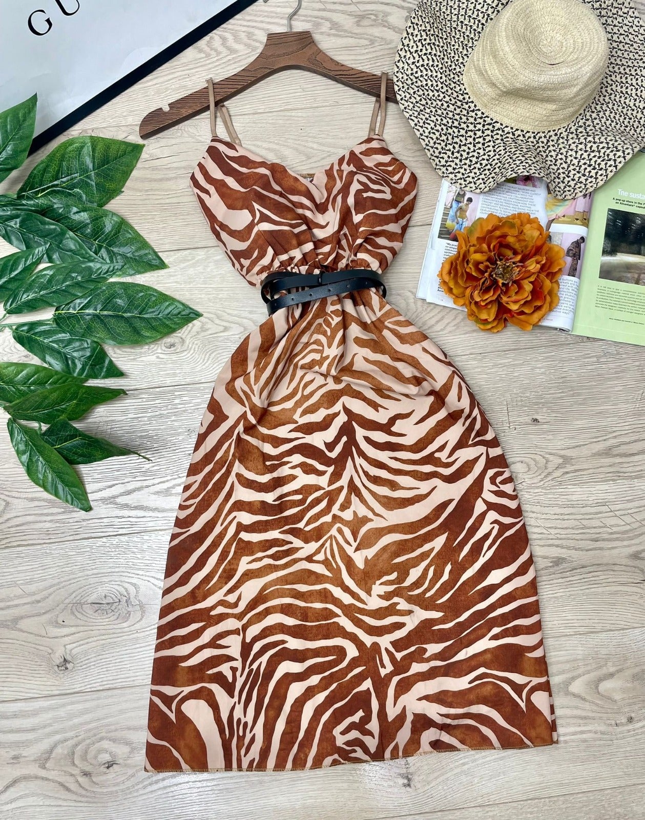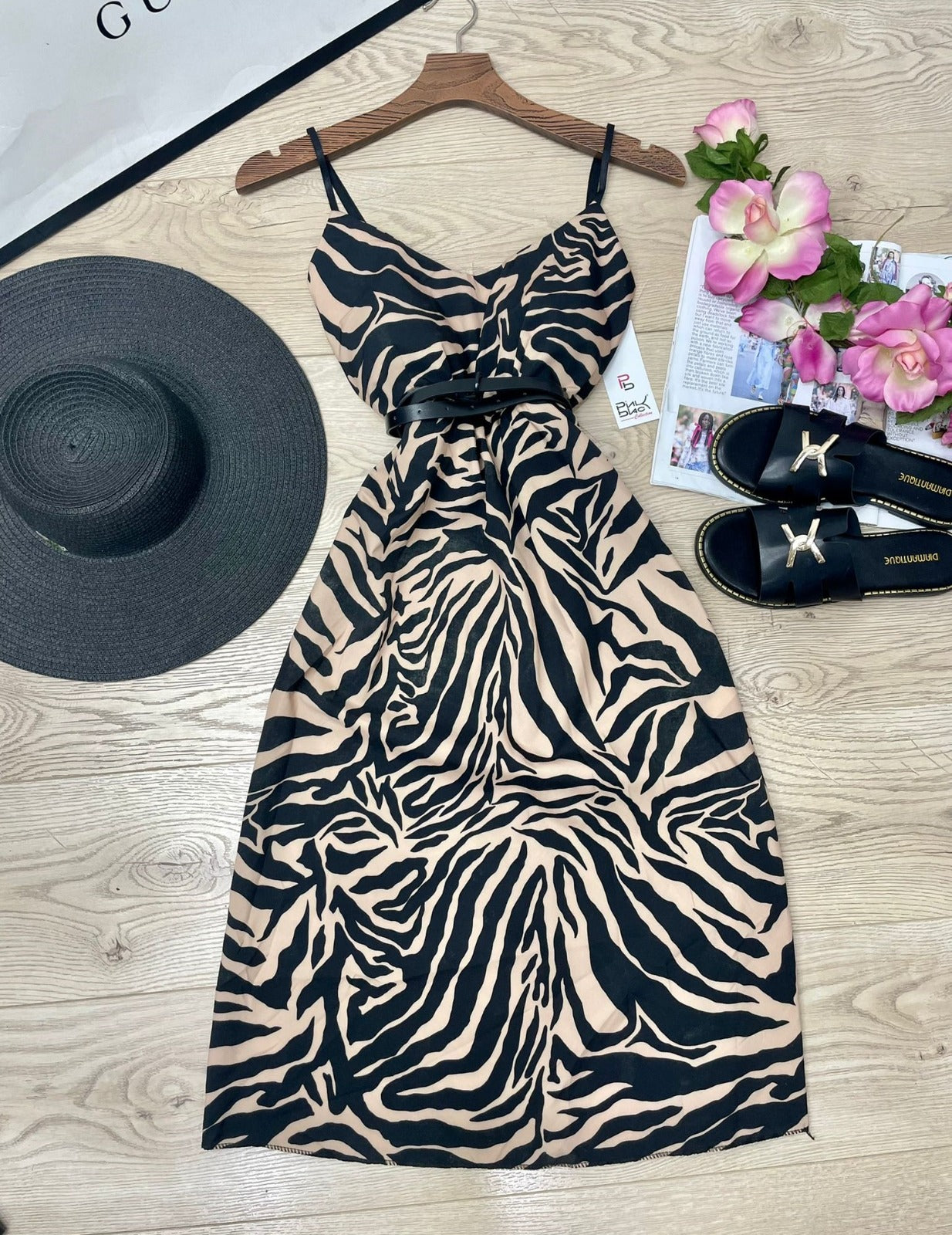 Abito in leggero tessuto strutturato con fantasia animalier, coppe preformate, spalline regolabili ed elastico in vita. Fabbricato in Italia.