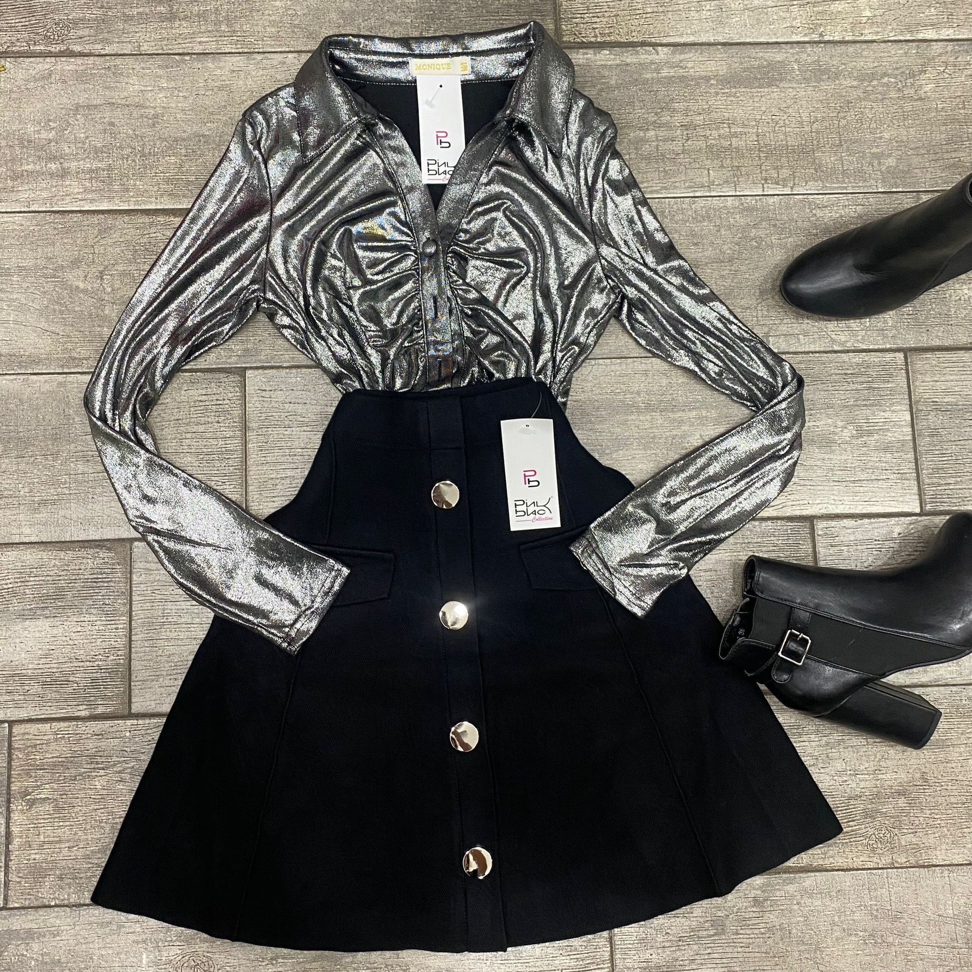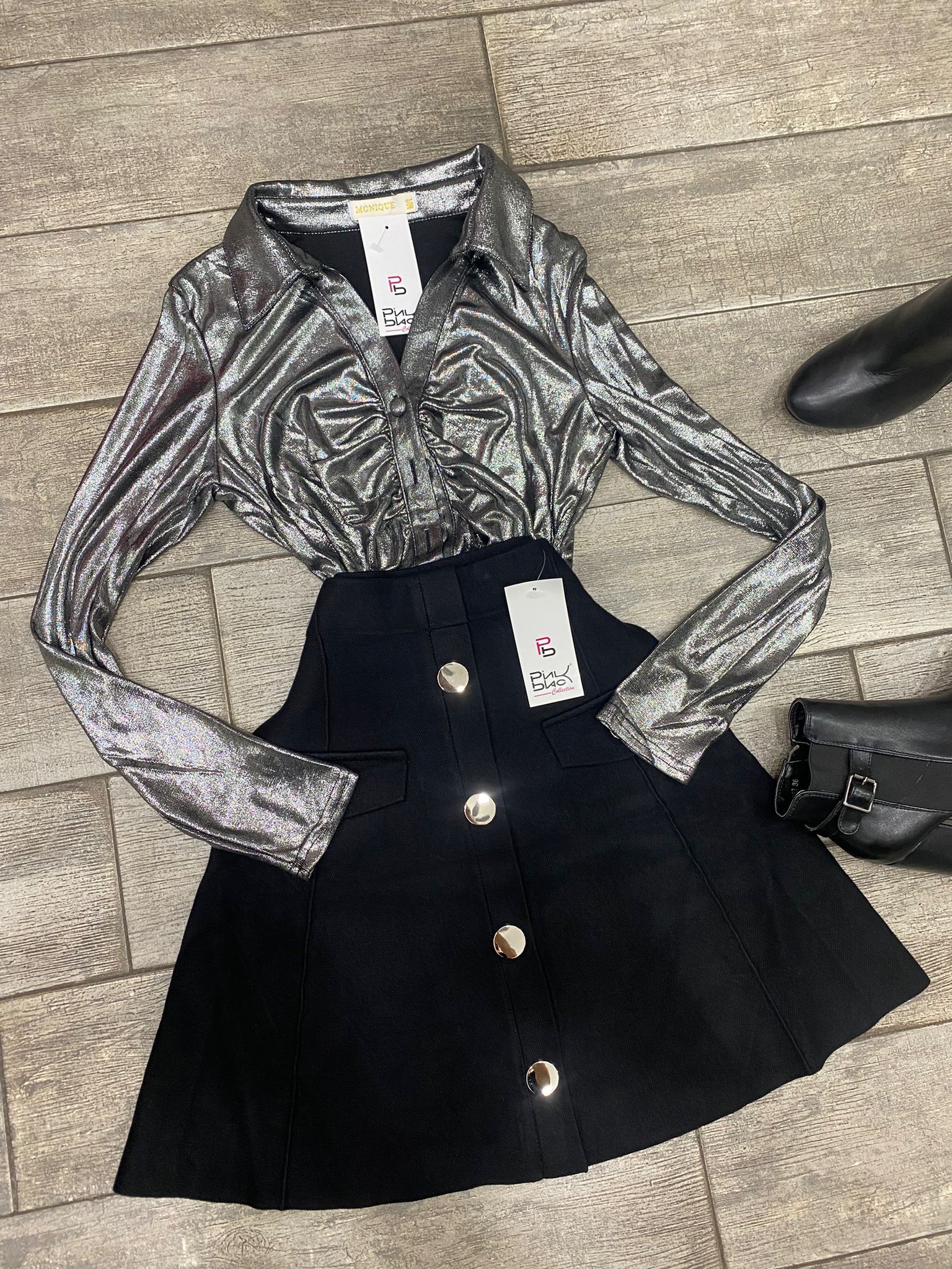 Body effetto laminato a manica lunga con bottoni centrali e chiusura ganci sul cavallo. Fabbricato in Italia.