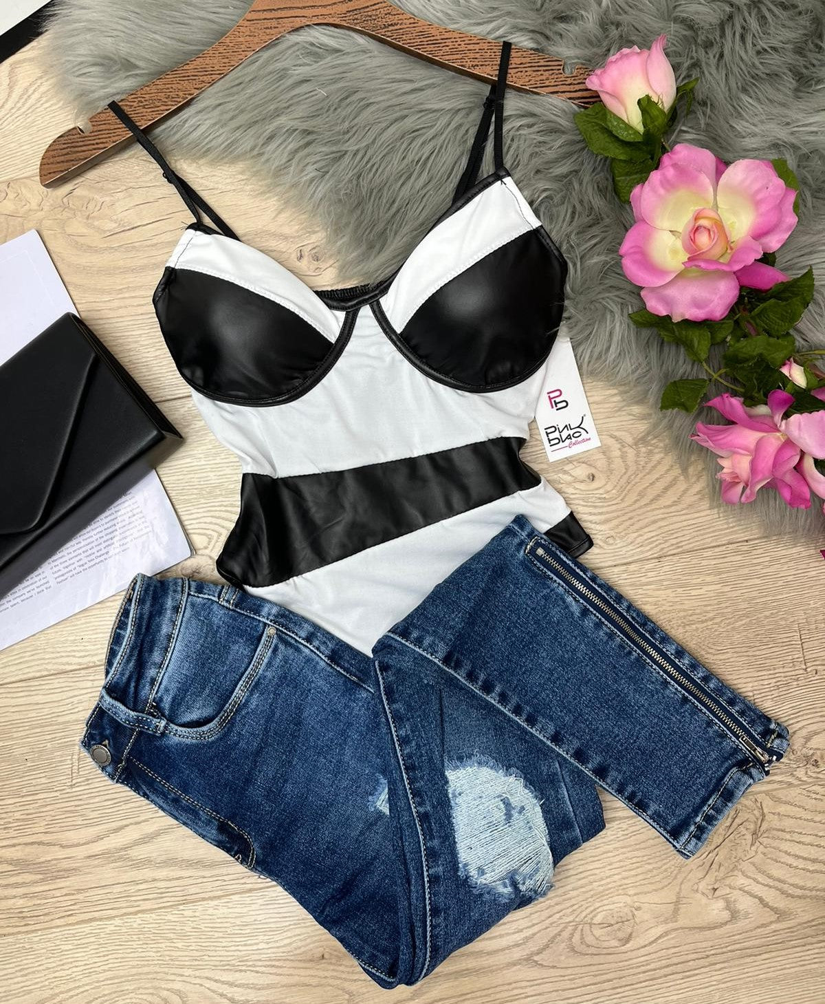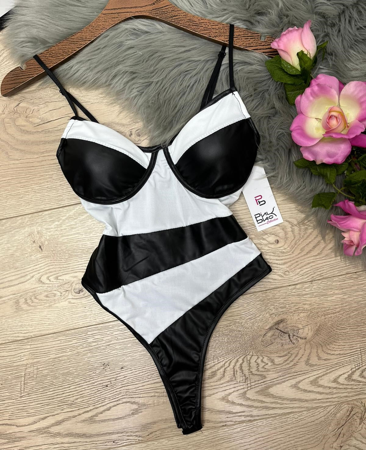 Body in ecopelle con coppe preformate, spalline regolabili e chiusura con ganci sul cavallo. Fabbricato in Italia.