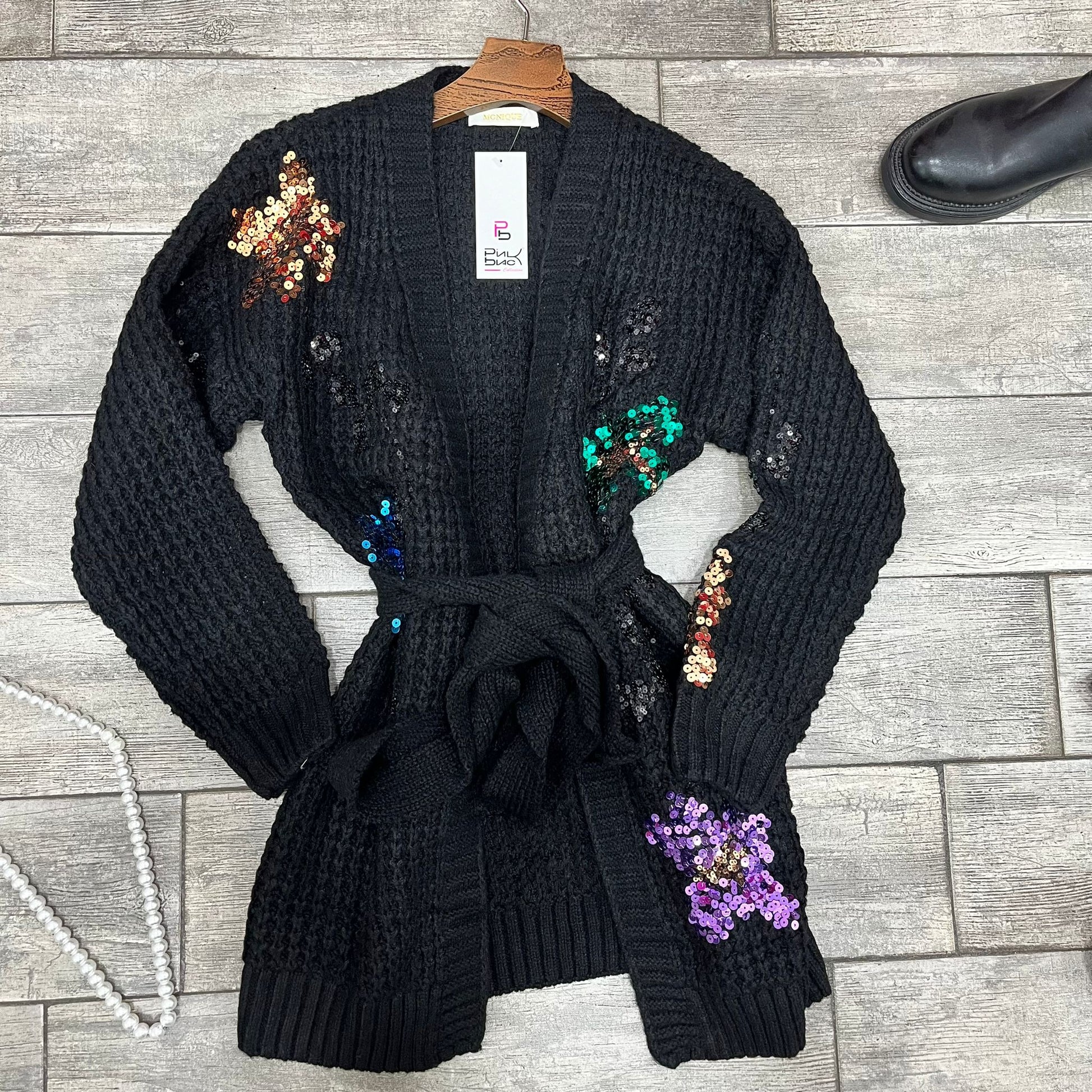 Cardigan in maglia con dettagli in paillettes e chiusura con cintura in maglia
