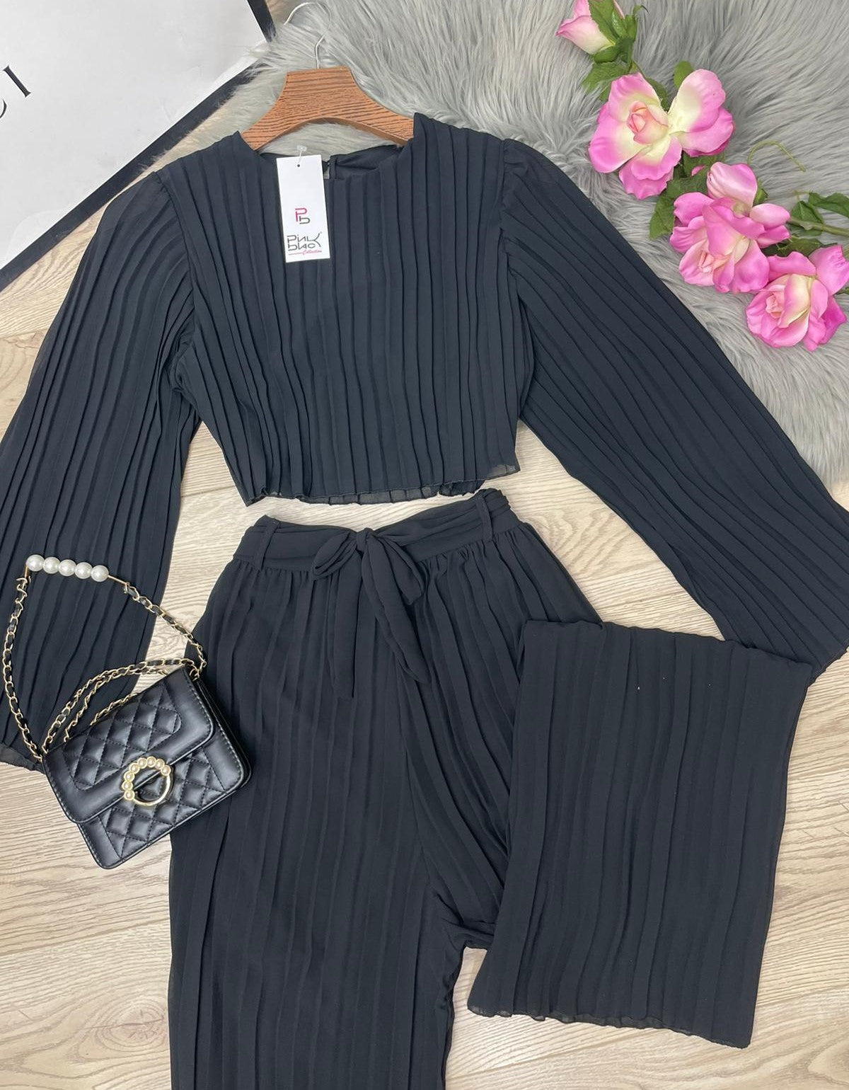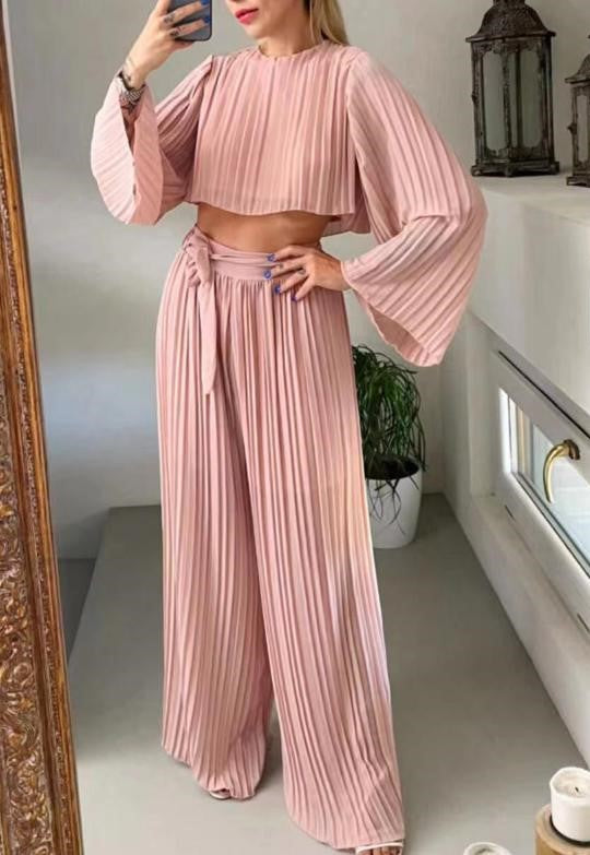 Completo in chiffon plissè. Maglia corta e pantalone palazzo con elastico in vita e cintura inclusa. Fabbricato in Italia.