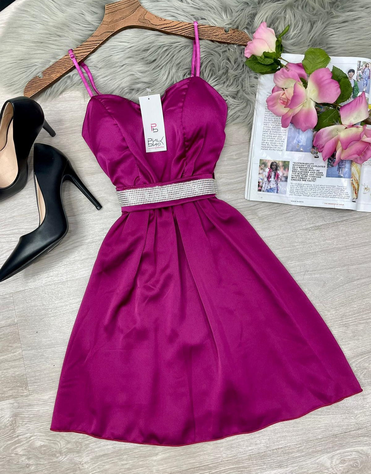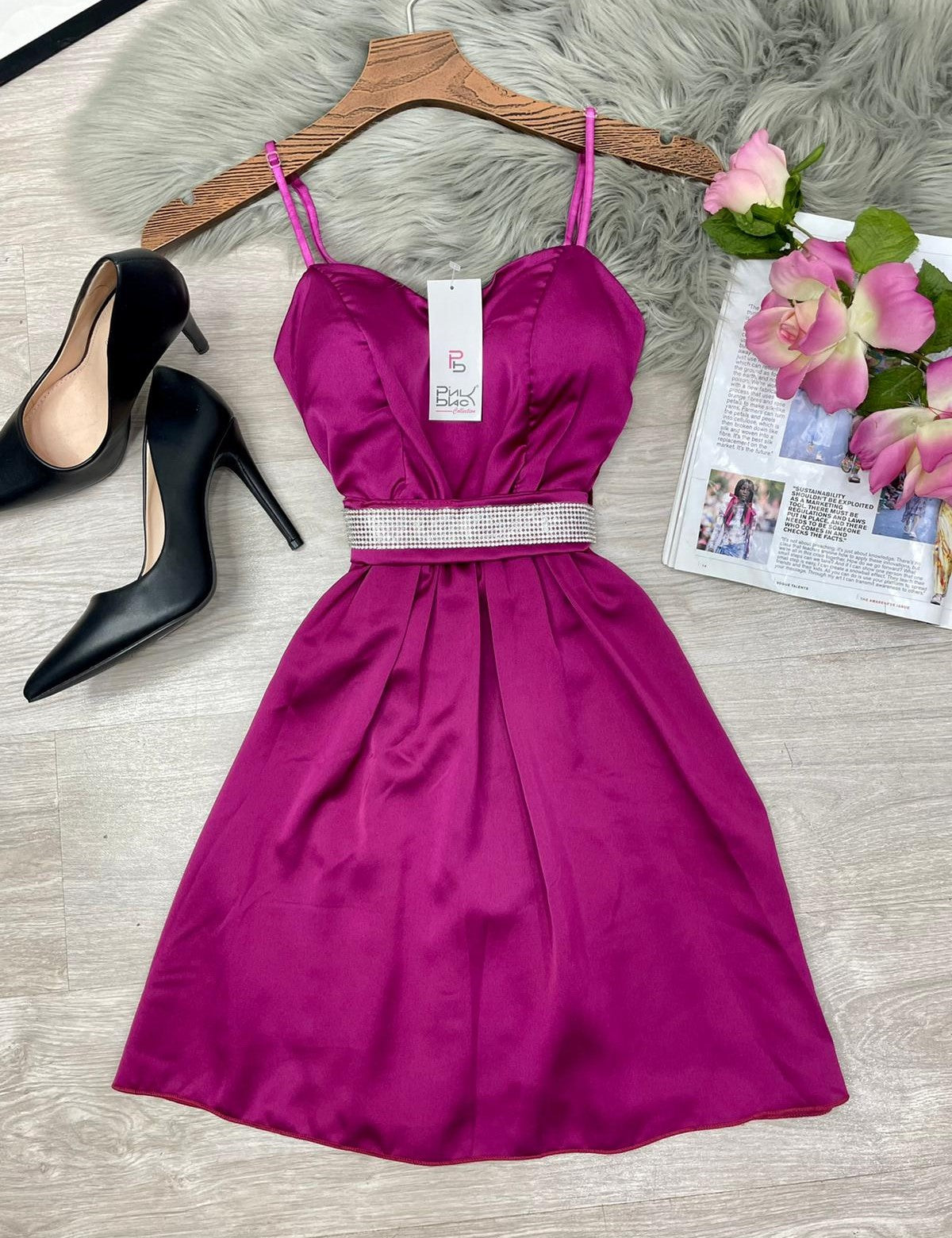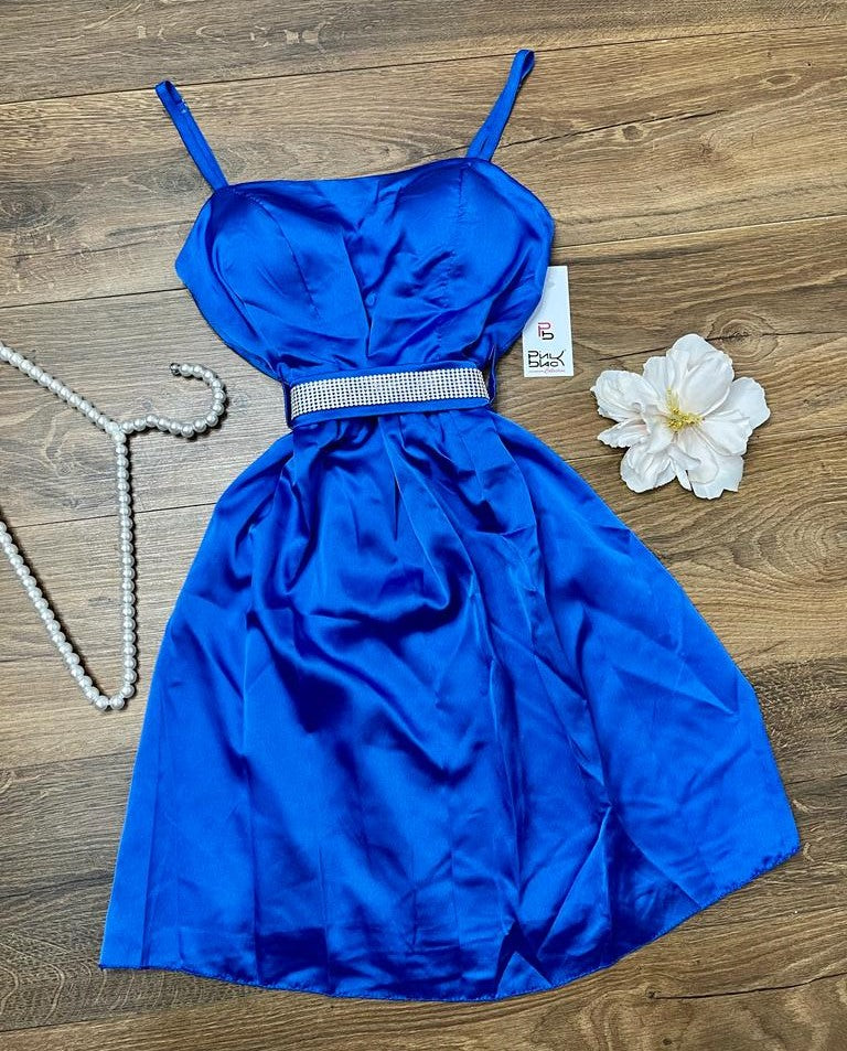Abito in raso, coppe preformate, spalline regolabili, fascia elastica arricciata sul retro e cinturino con strass. Fabbricato in Italia.