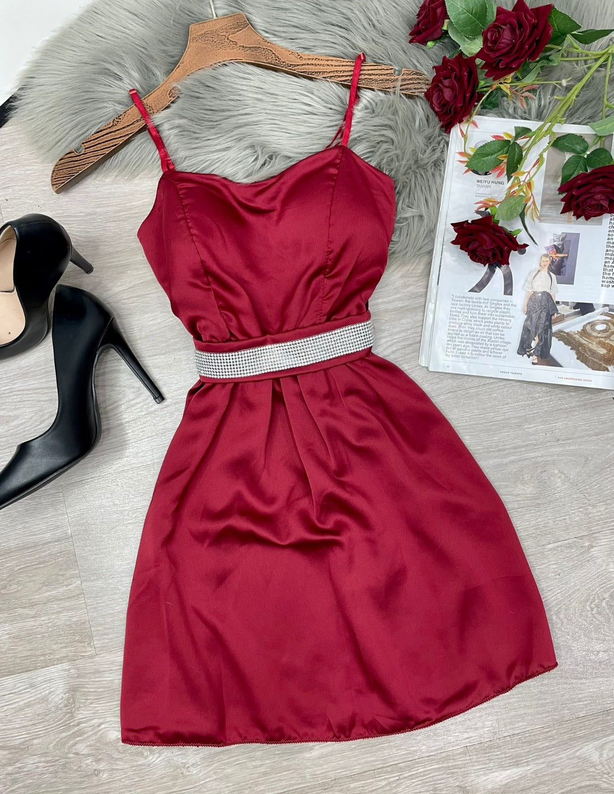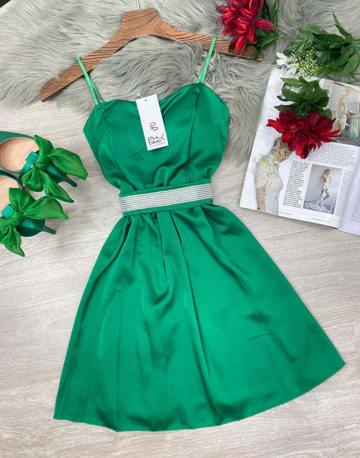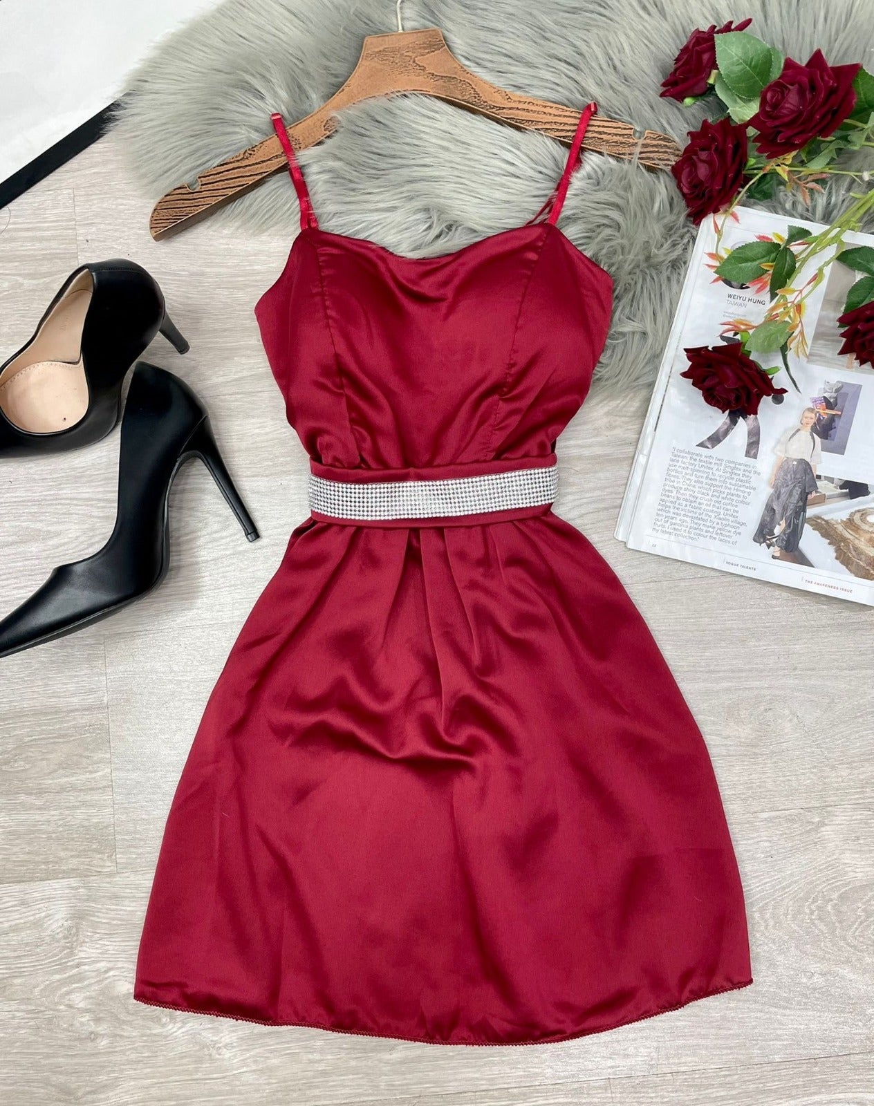 Abito in raso, coppe preformate, spalline regolabili, fascia elastica arricciata sul retro e cinturino con strass. Fabbricato in Italia.
