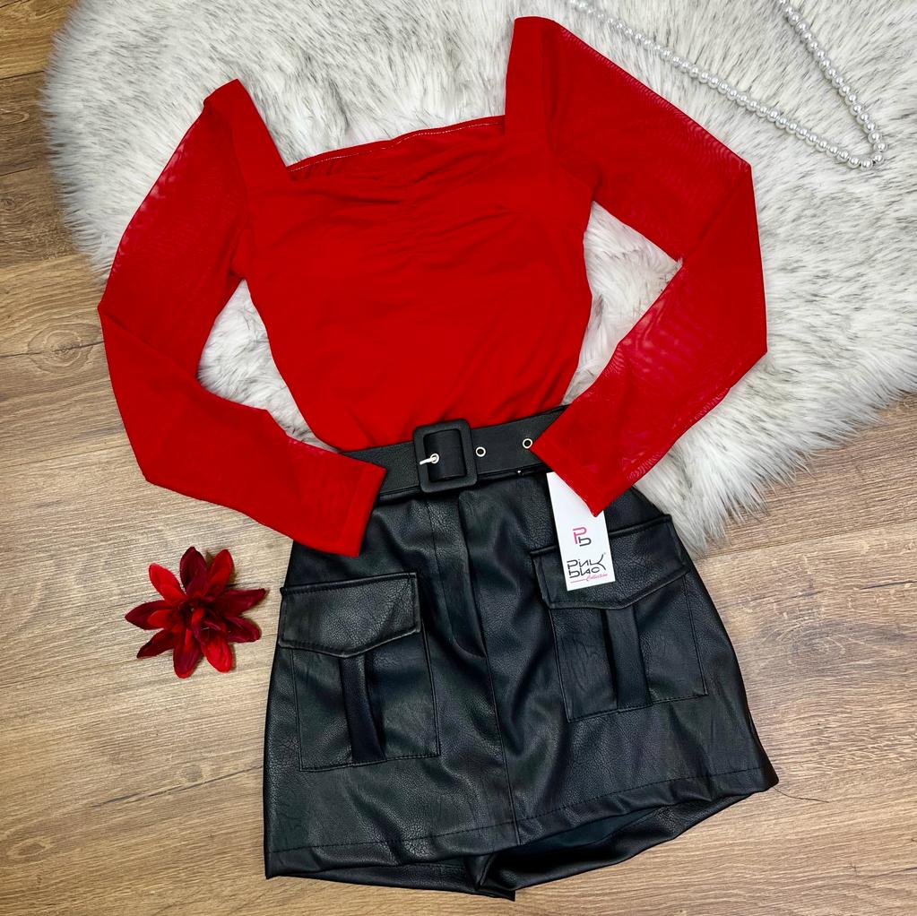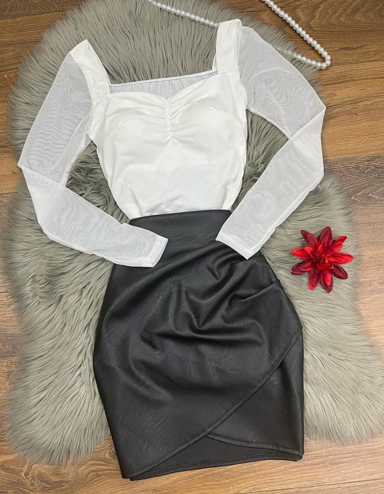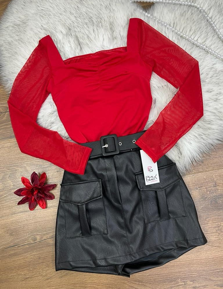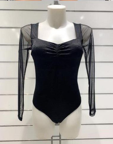 Body in tessuto strutturato con coppe preformate, maniche velate e chiusura con ganci sul cavallo. Fabbricato in Italia.
