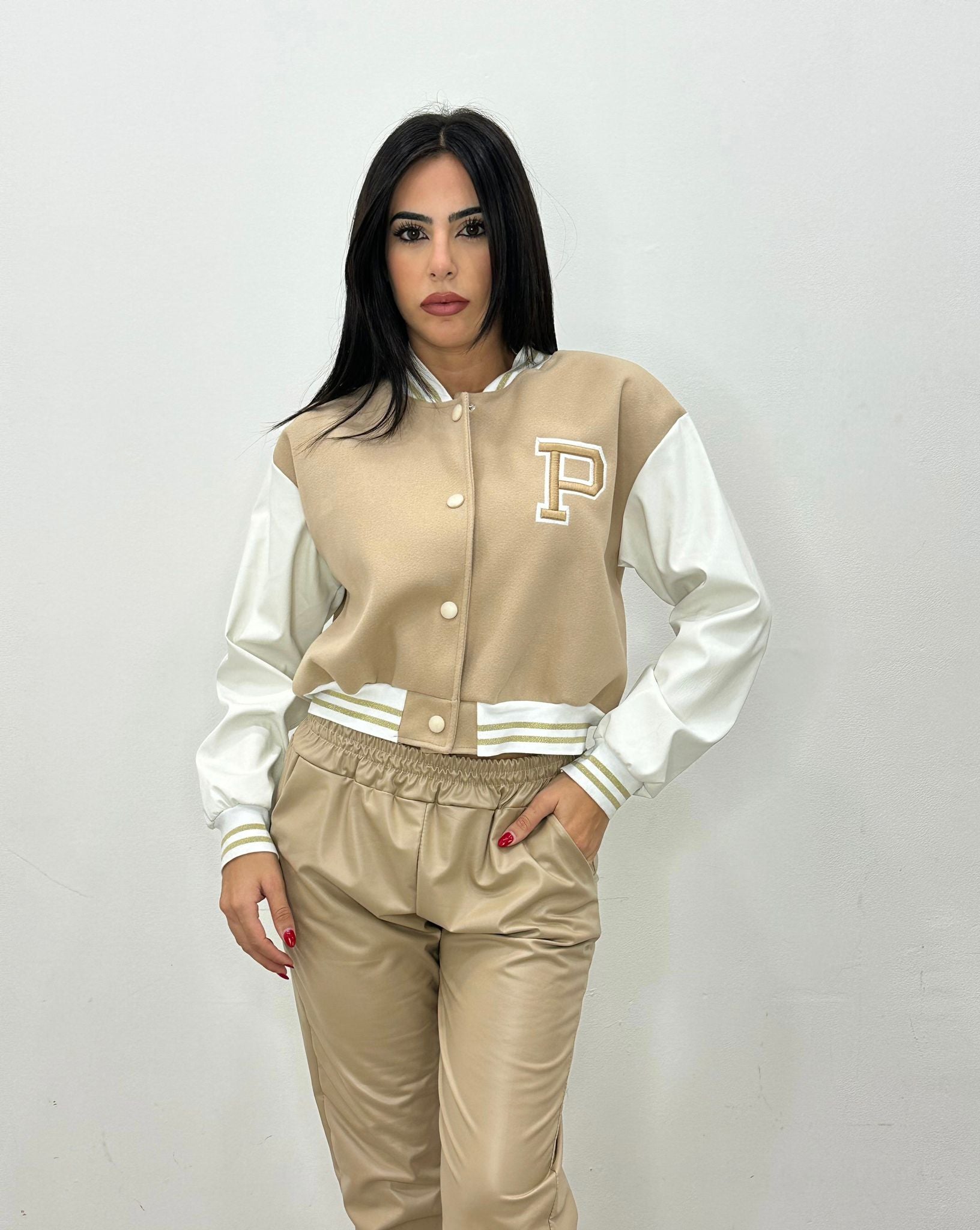 Giubbino in pile con manica in ecopelle e bottoni centrali. Fabbricato in Italia.