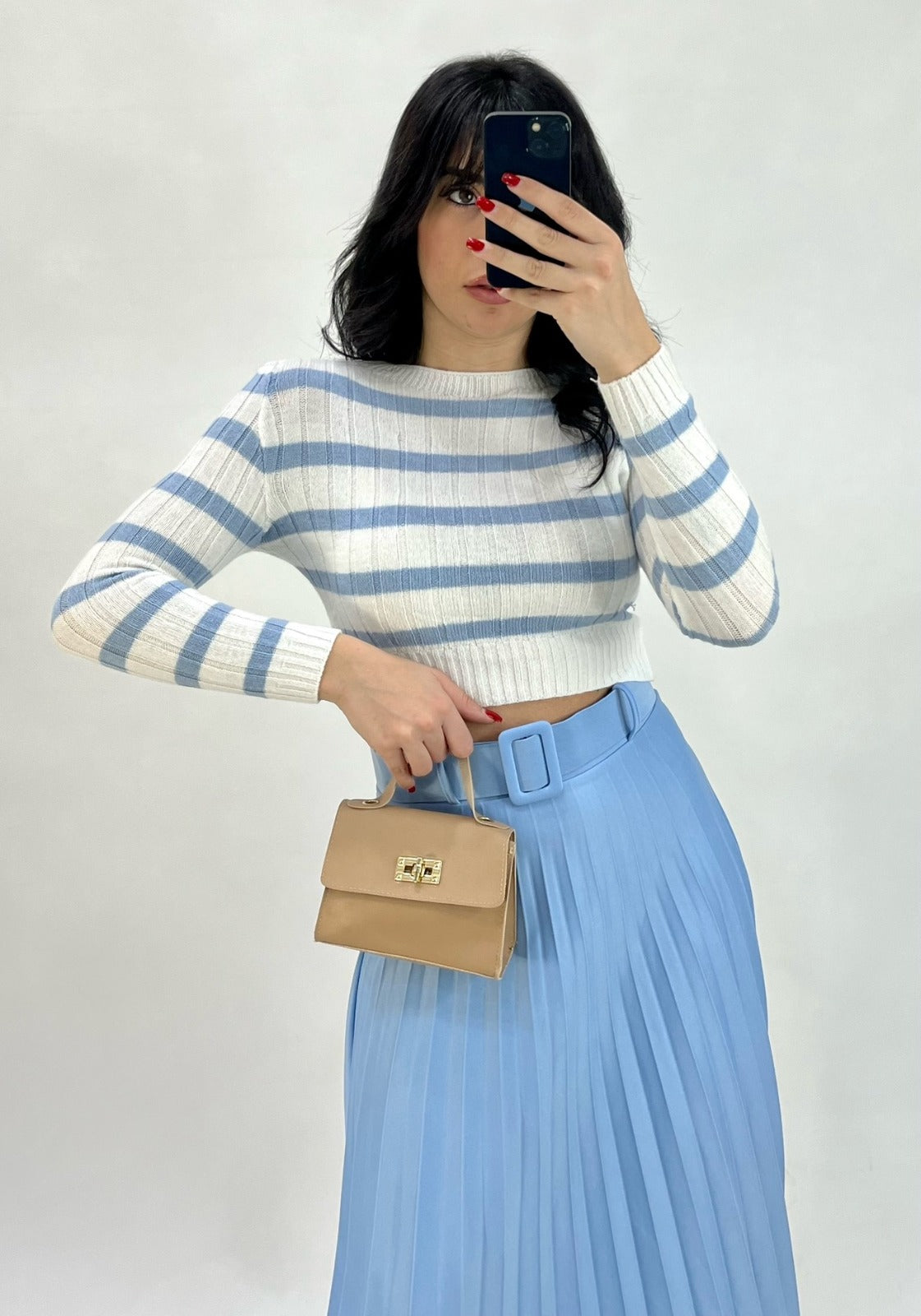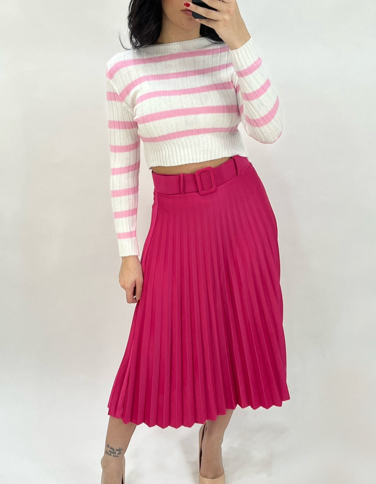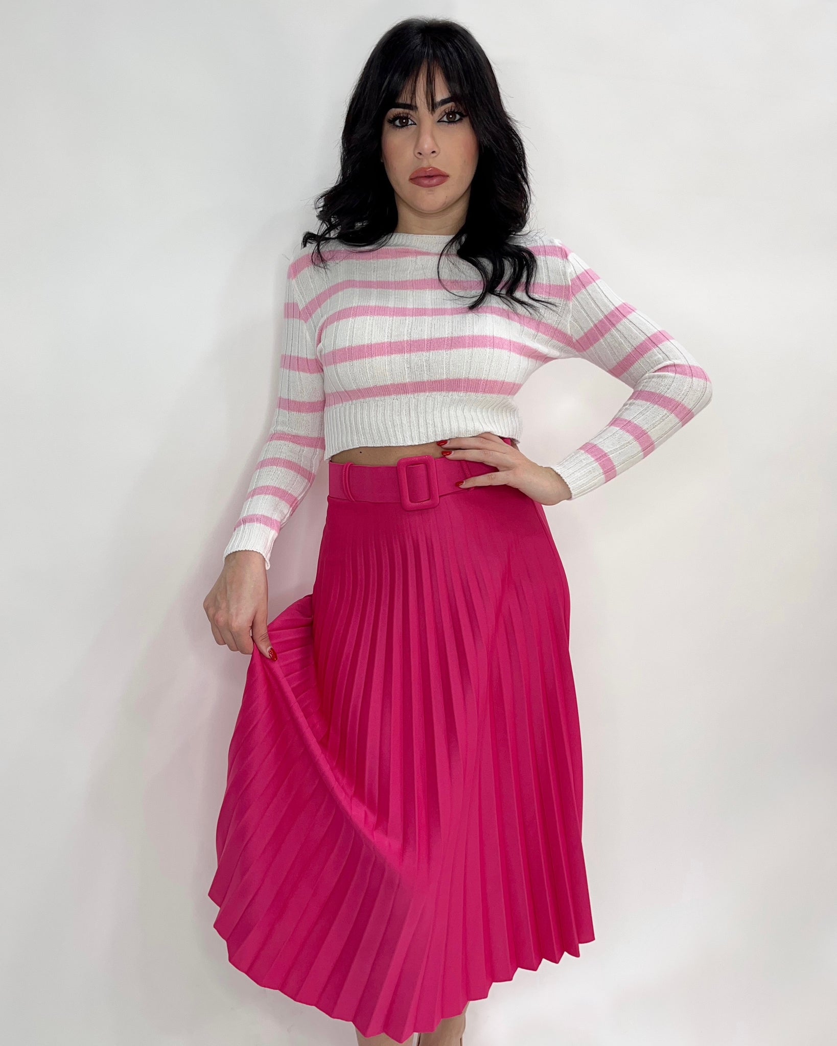Gonna longuette plissè in tessuto scuba crepe con fascia elastica in vita e cintura inclusa. Fabbricato in Italia.