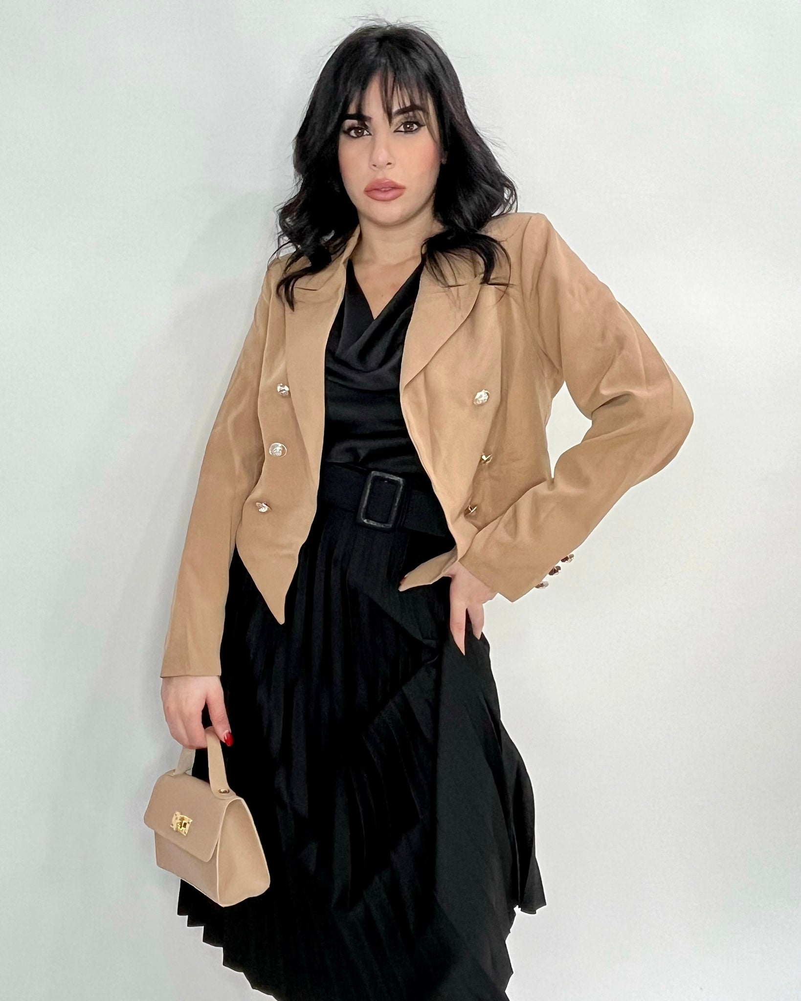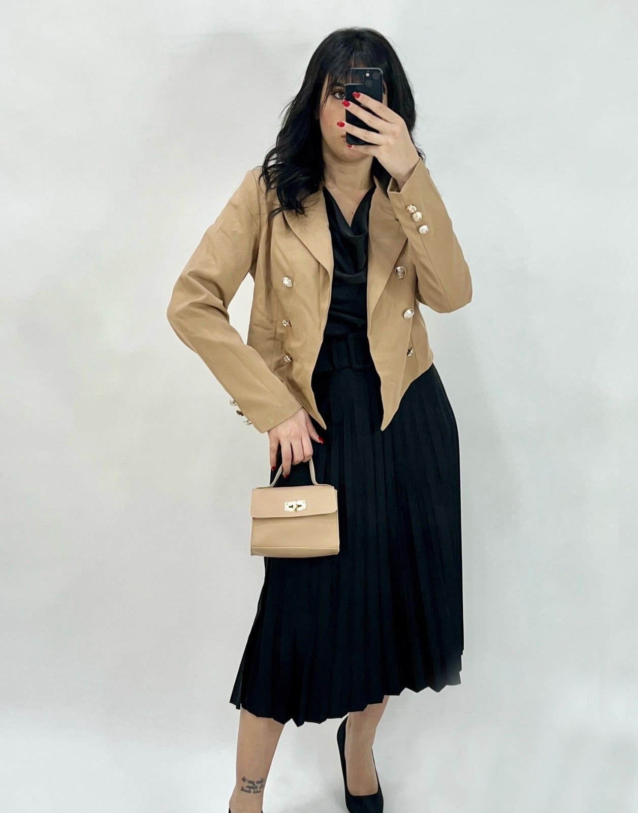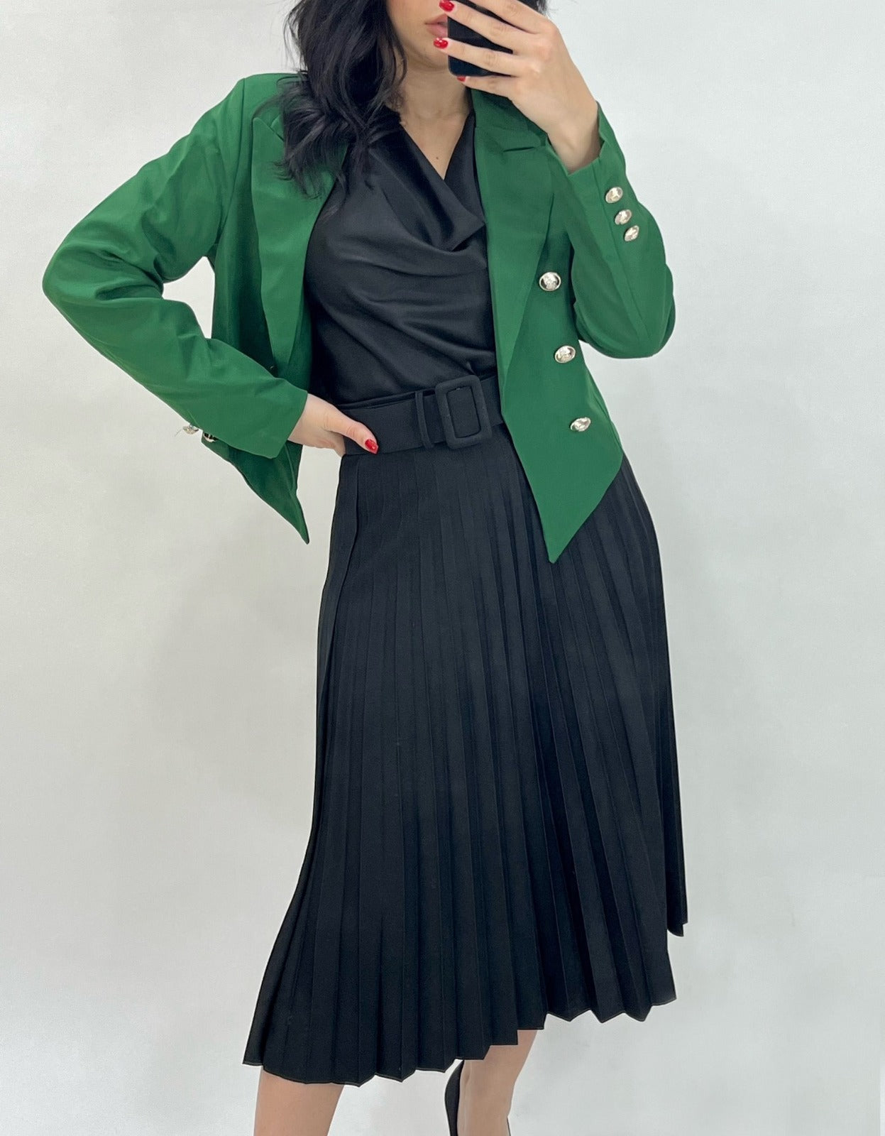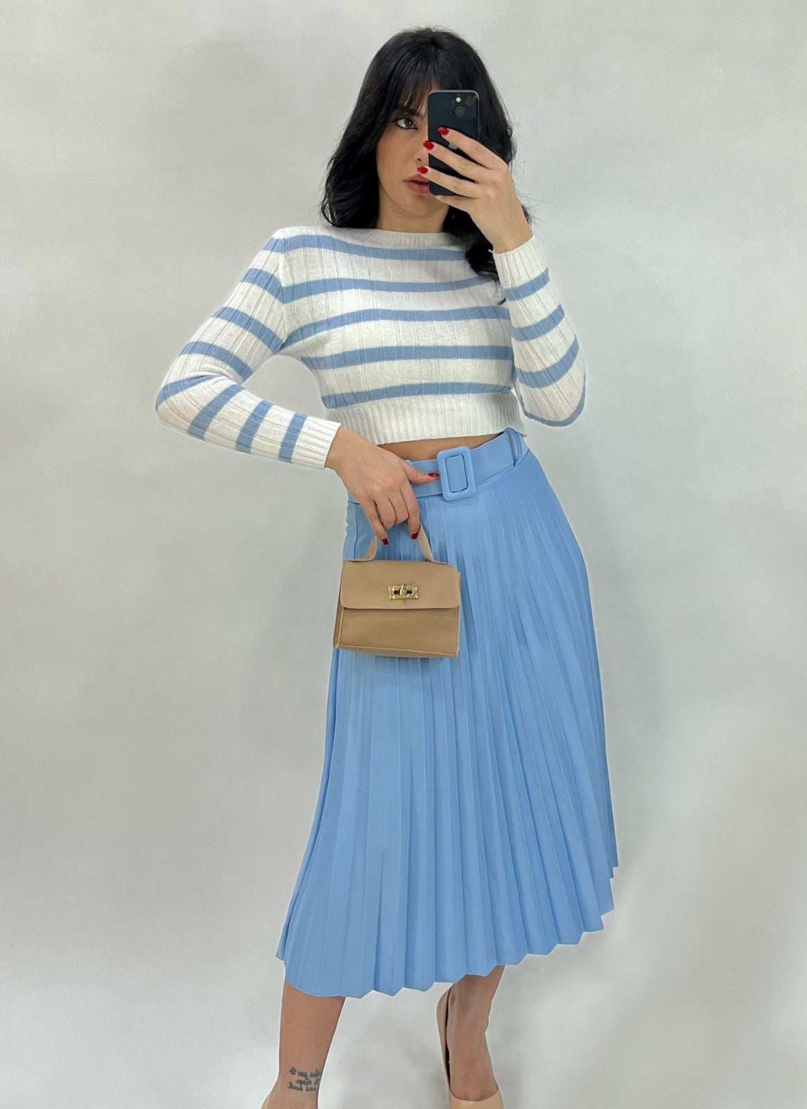 Gonna longuette plissè in tessuto scuba crepe con fascia elastica in vita e cintura inclusa. Fabbricato in Italia.