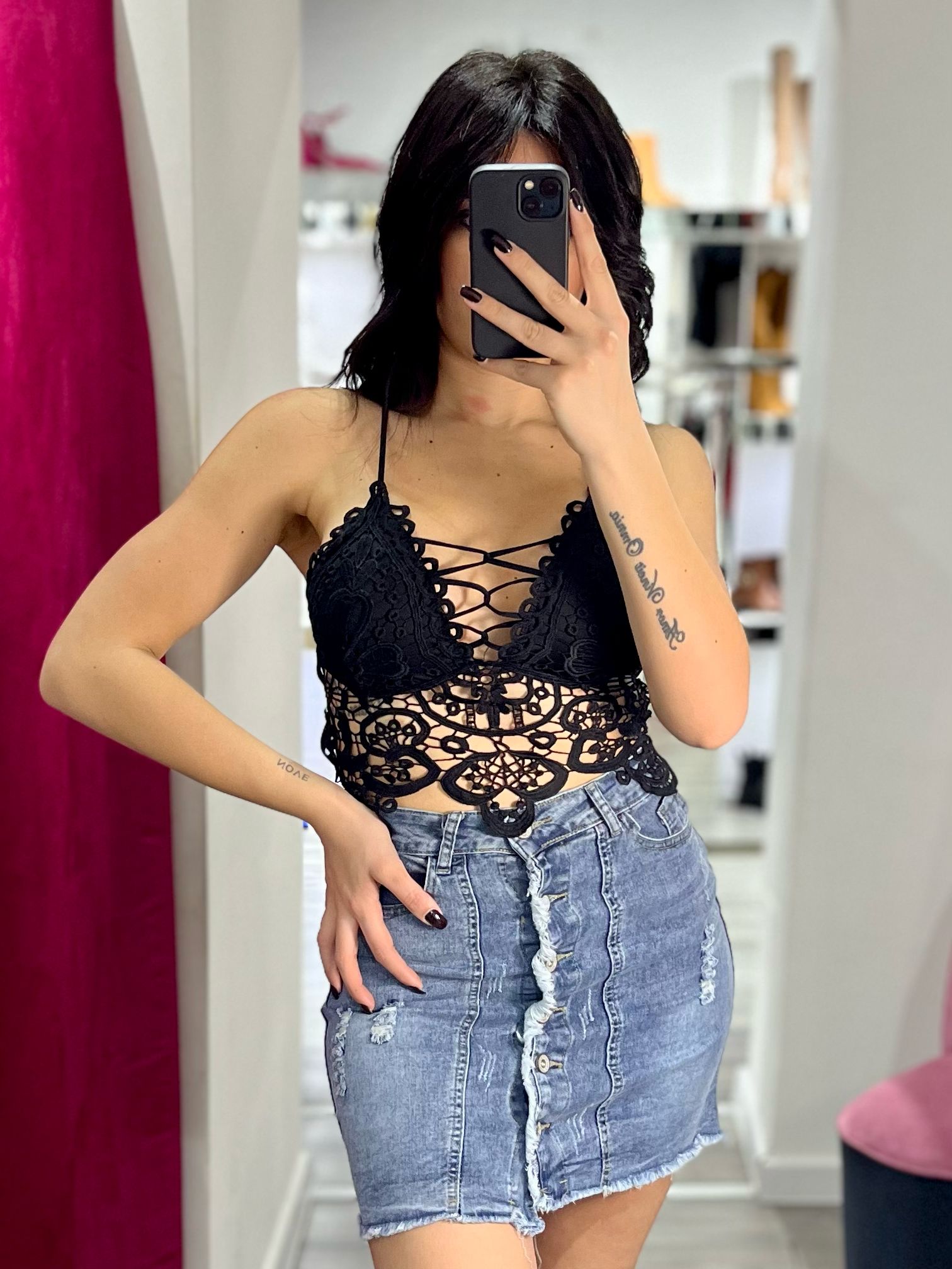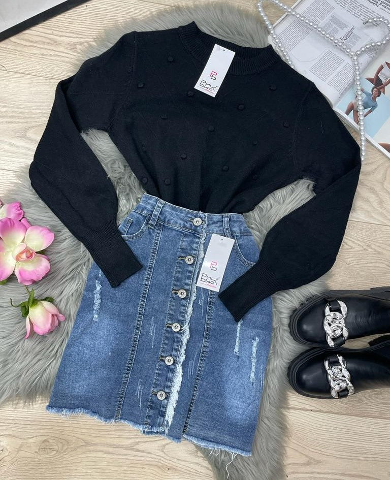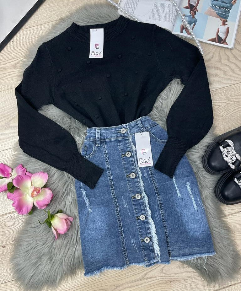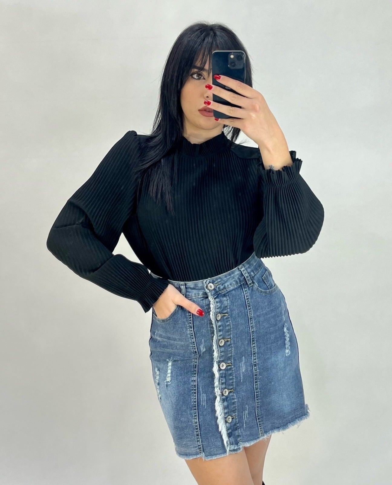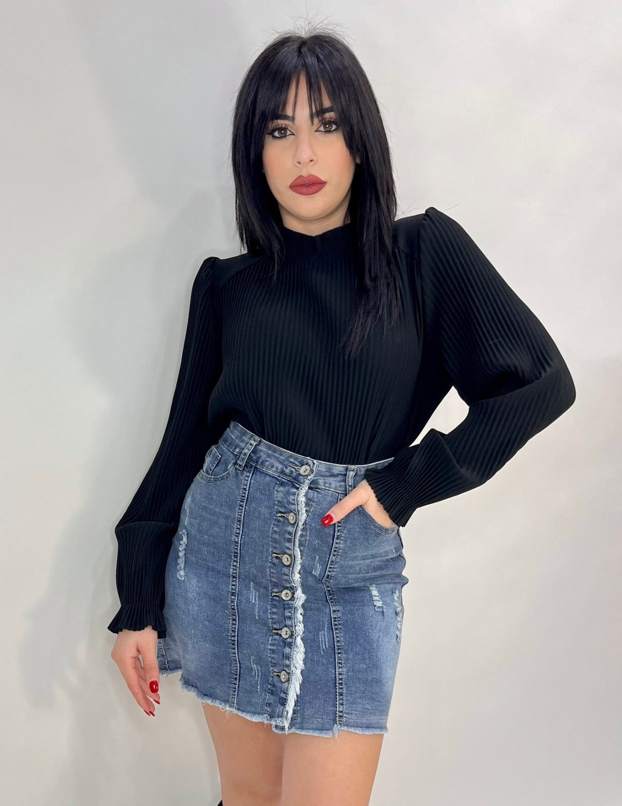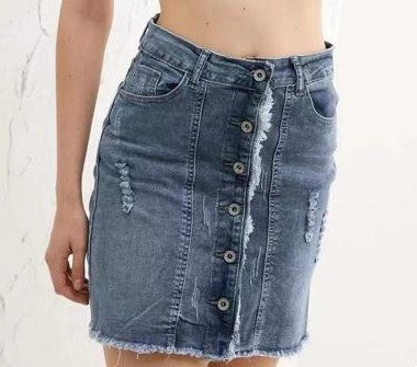 Gonna a jeans modello corto con bottoni, orlo sfilacciato e tasche. Fabbricato all'estero.